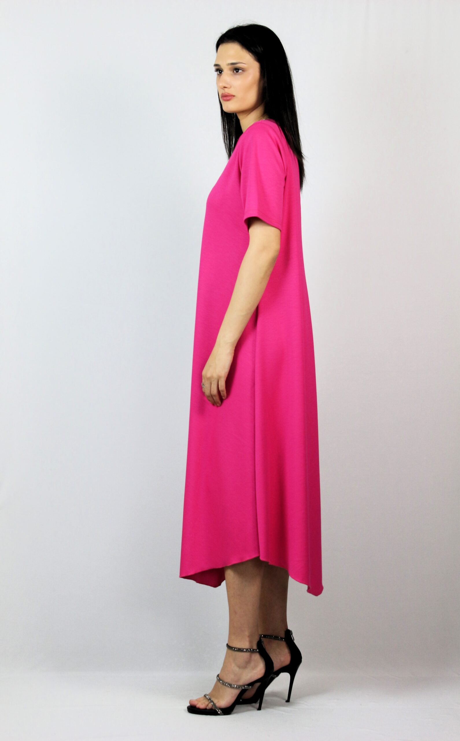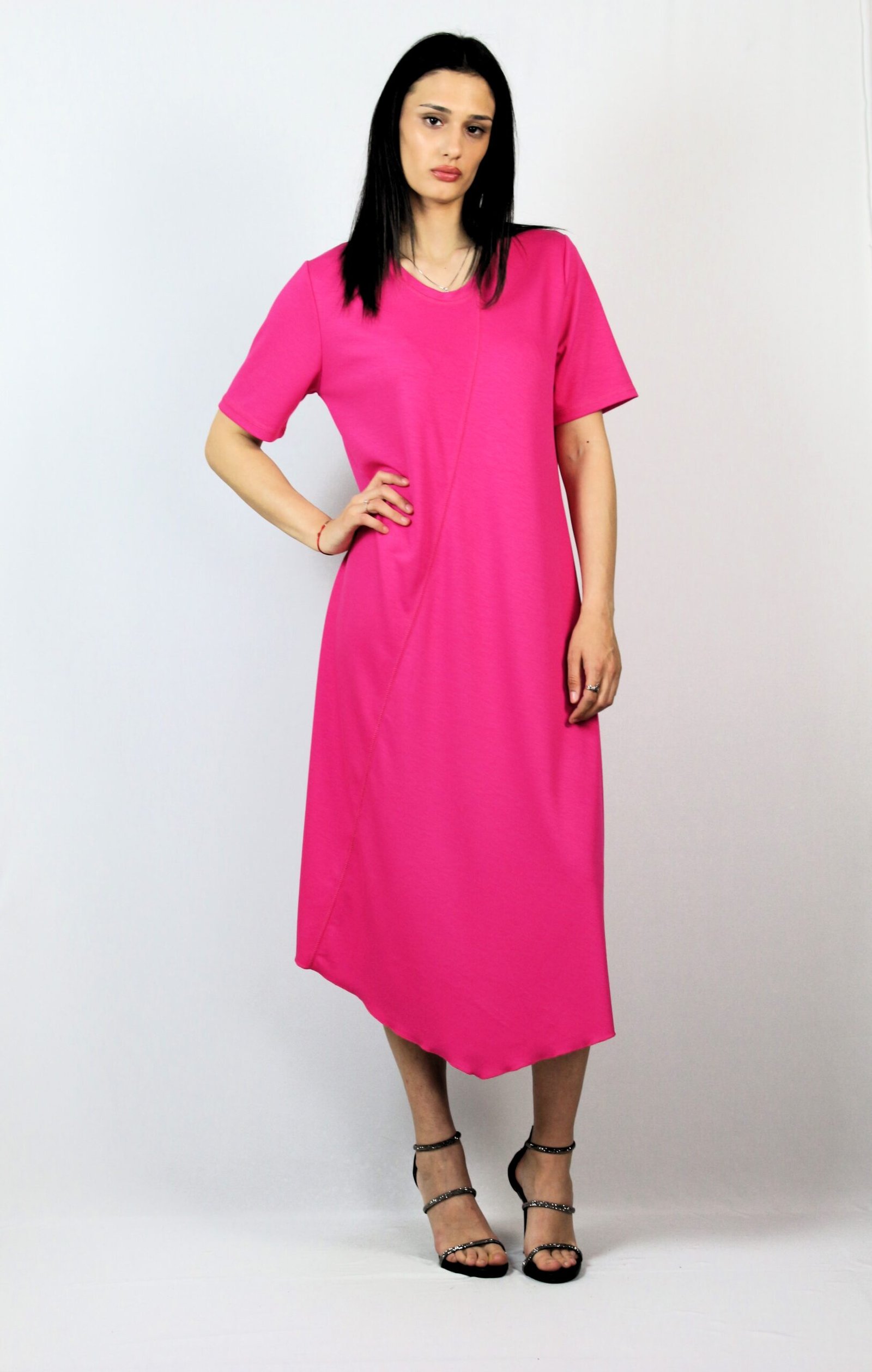 Асиметрична рокля с къс ръкав и украсителни тигели. Изработена от трико – вискоза ,полиестер и еластан.