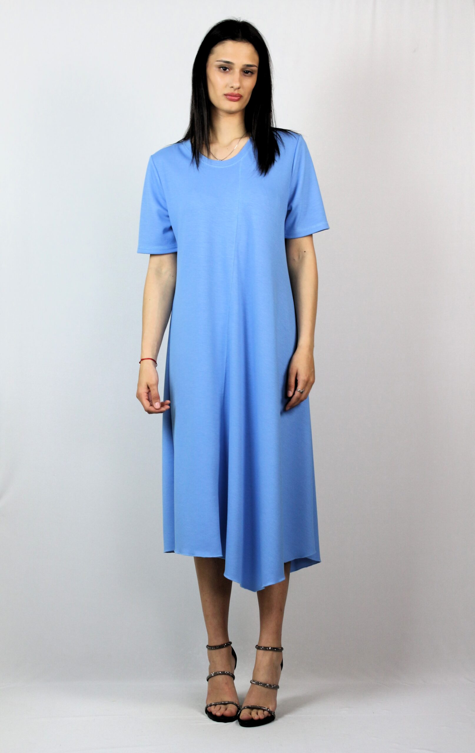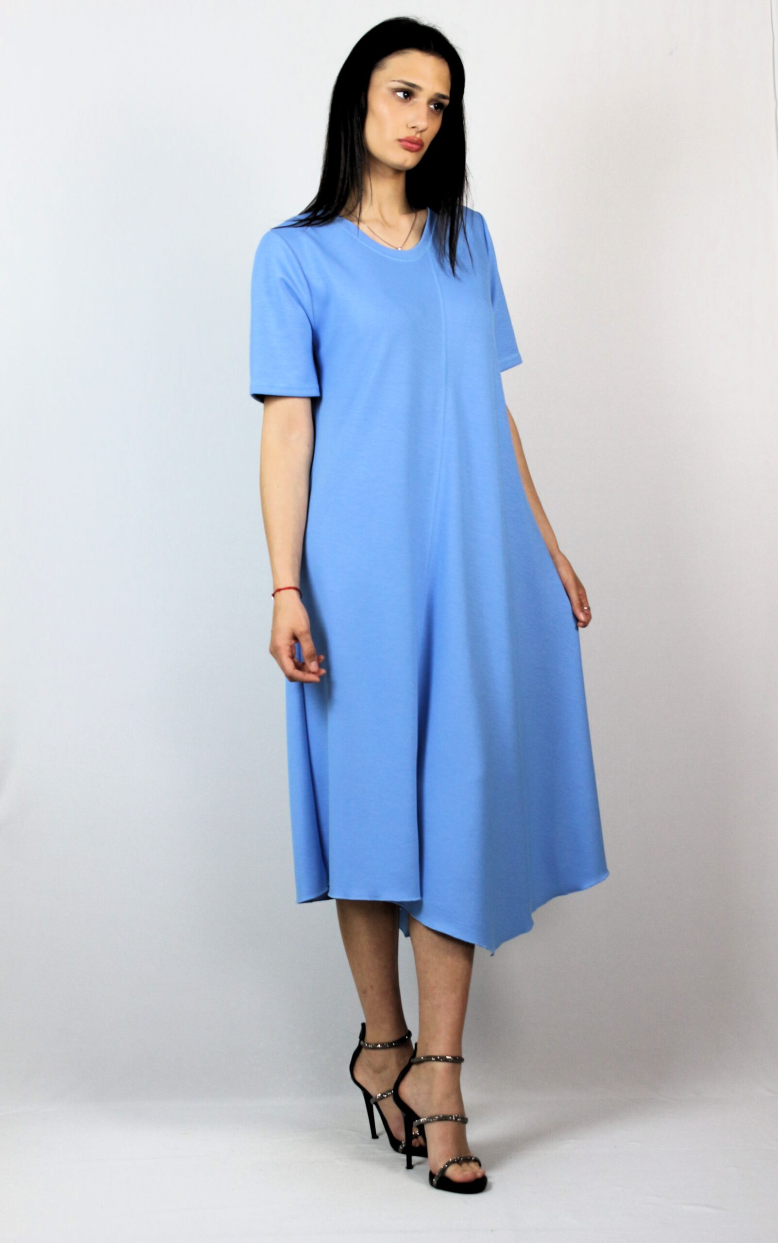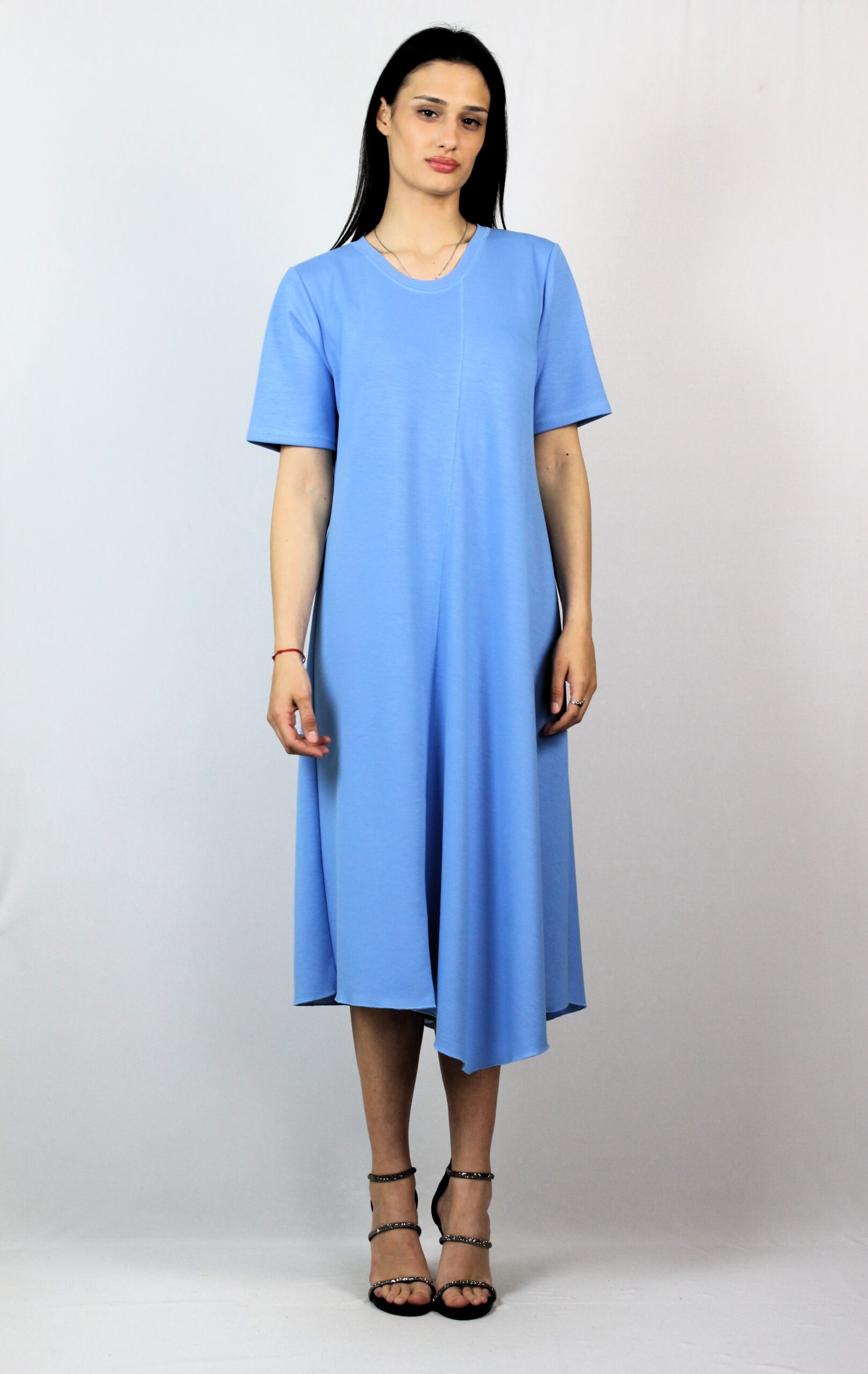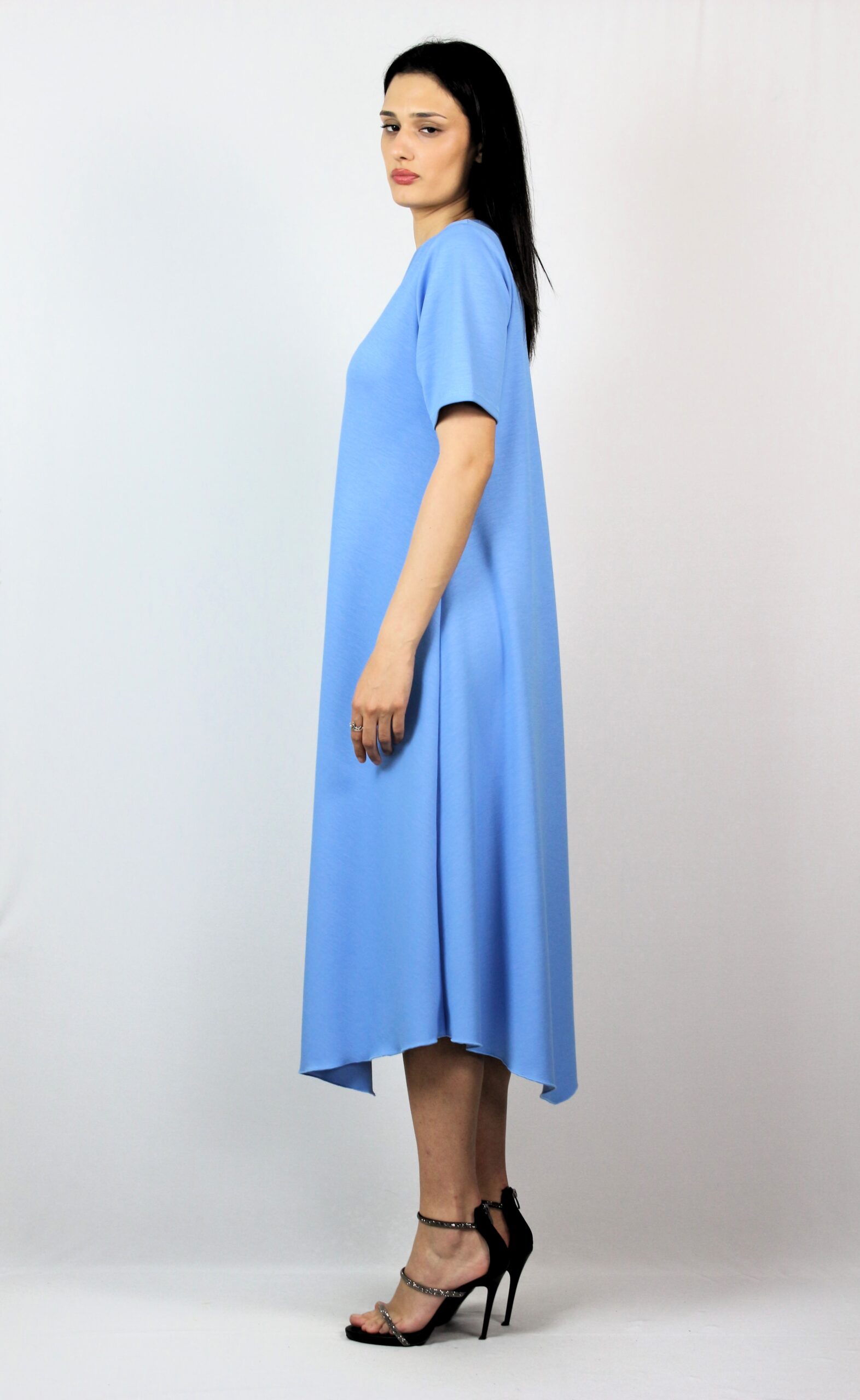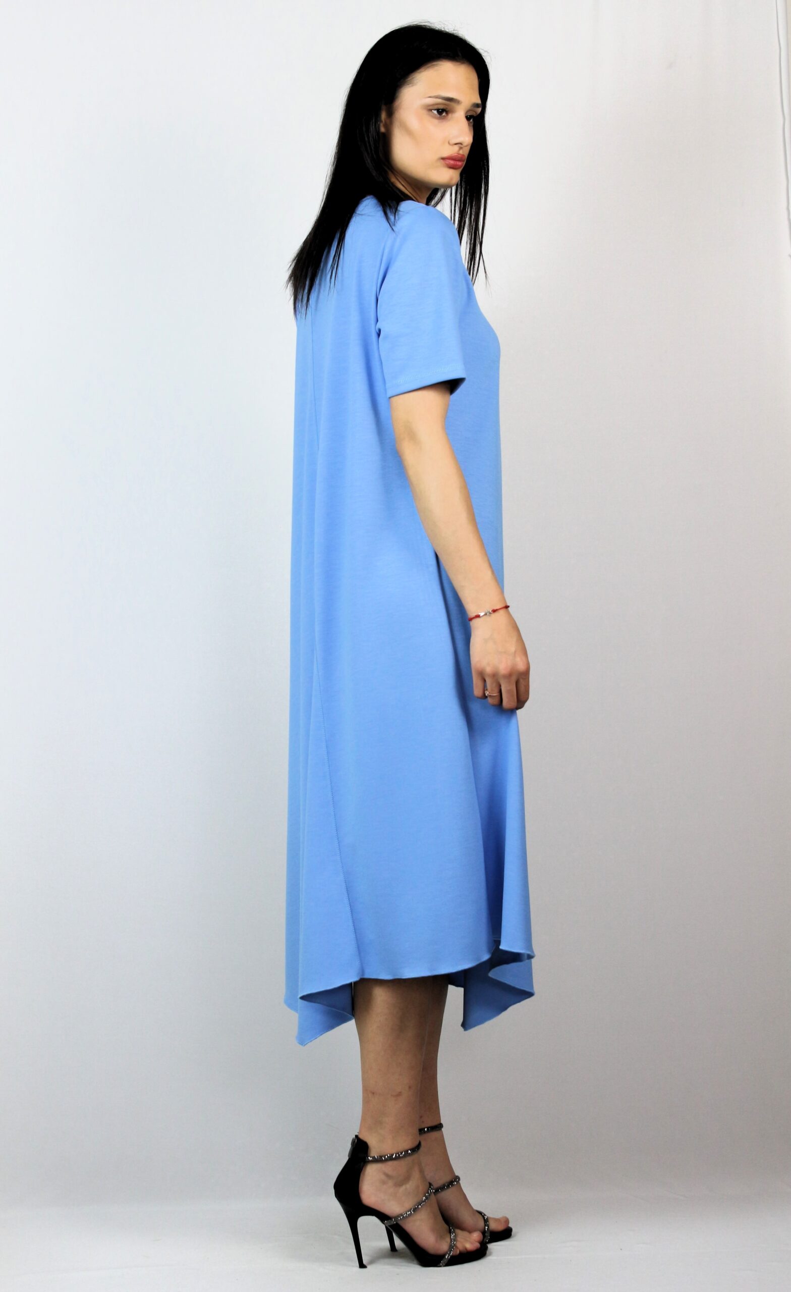 Асиметрична рокля с къс ръкав и украсителни тигели. Изработена от трико – вискоза ,полиестер и еластан.