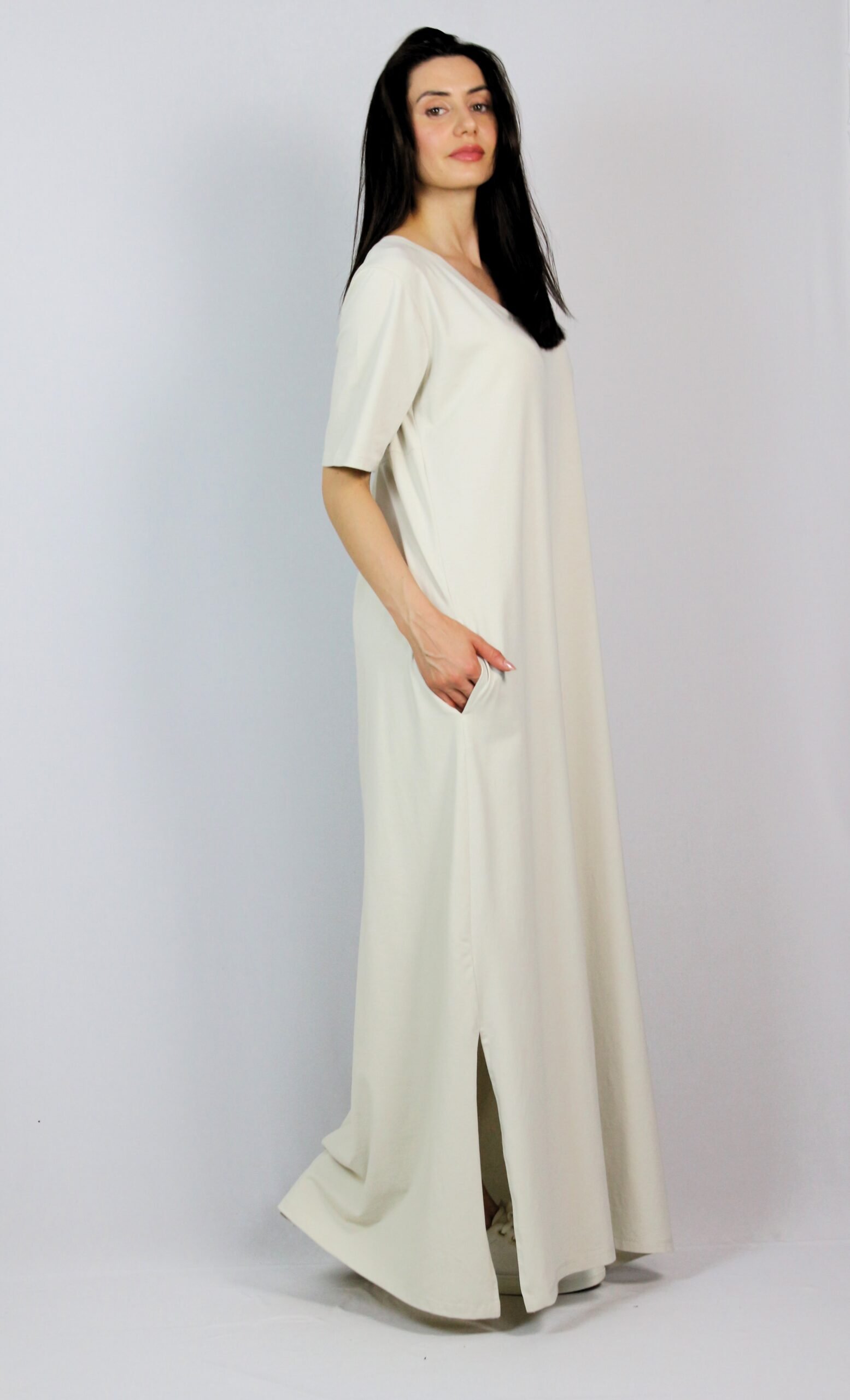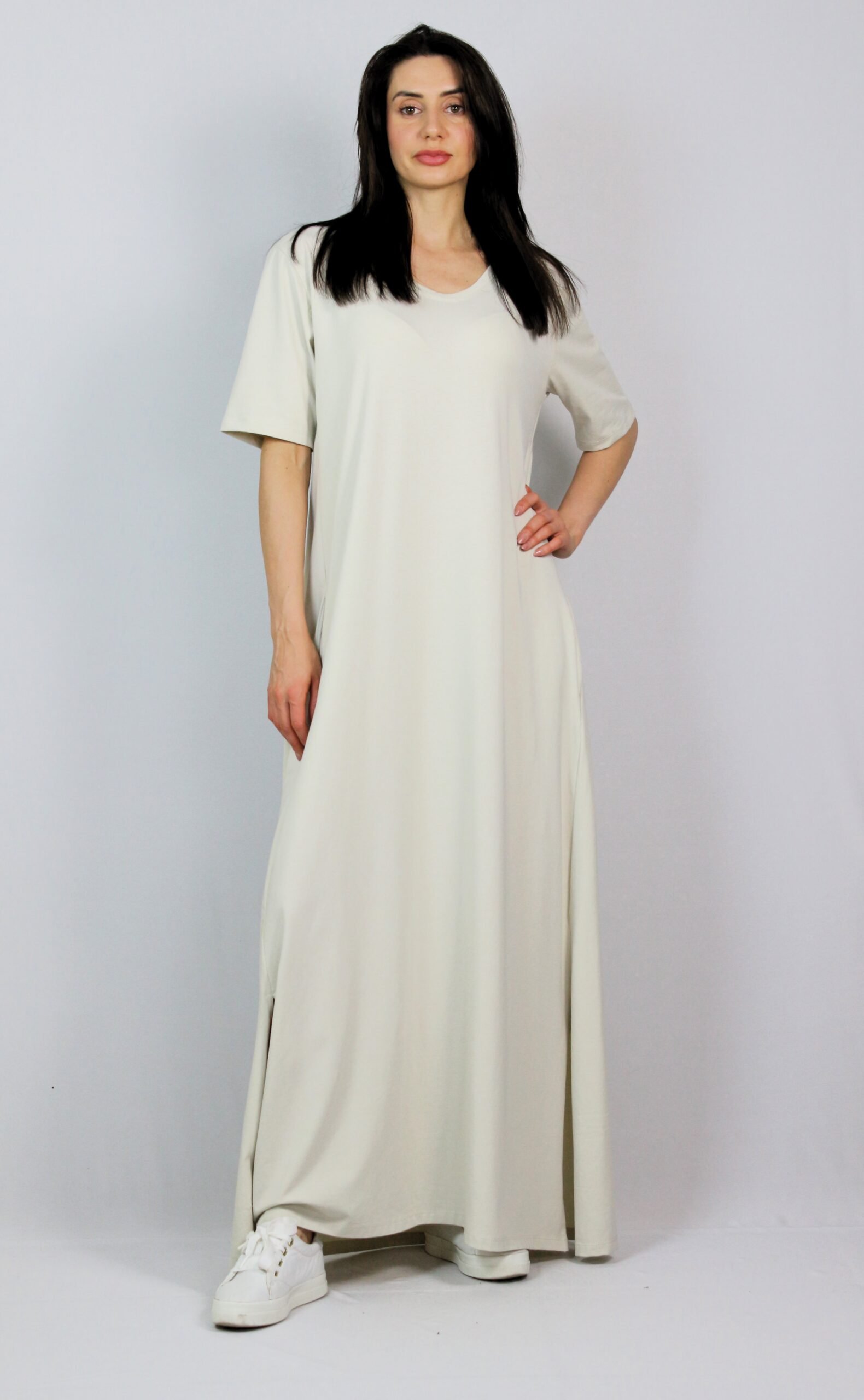 Рокля с къс ръкав, вътрешни джобове и две цепки отстрани. На гърба има платка с плохи .Изработена е от памучно трико 95% памук и 5% еластан.