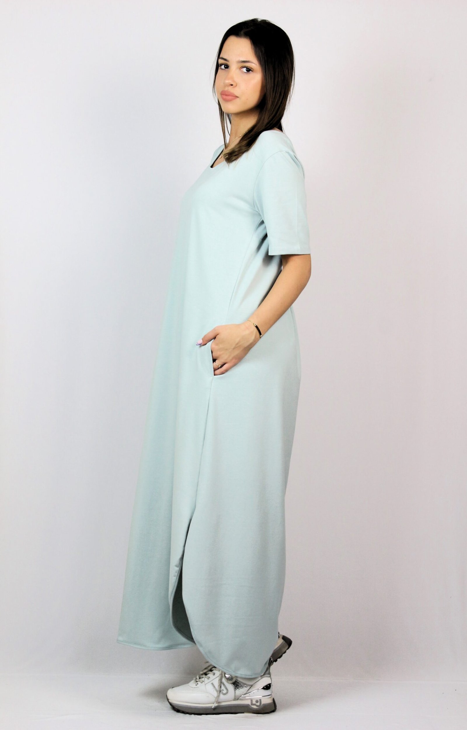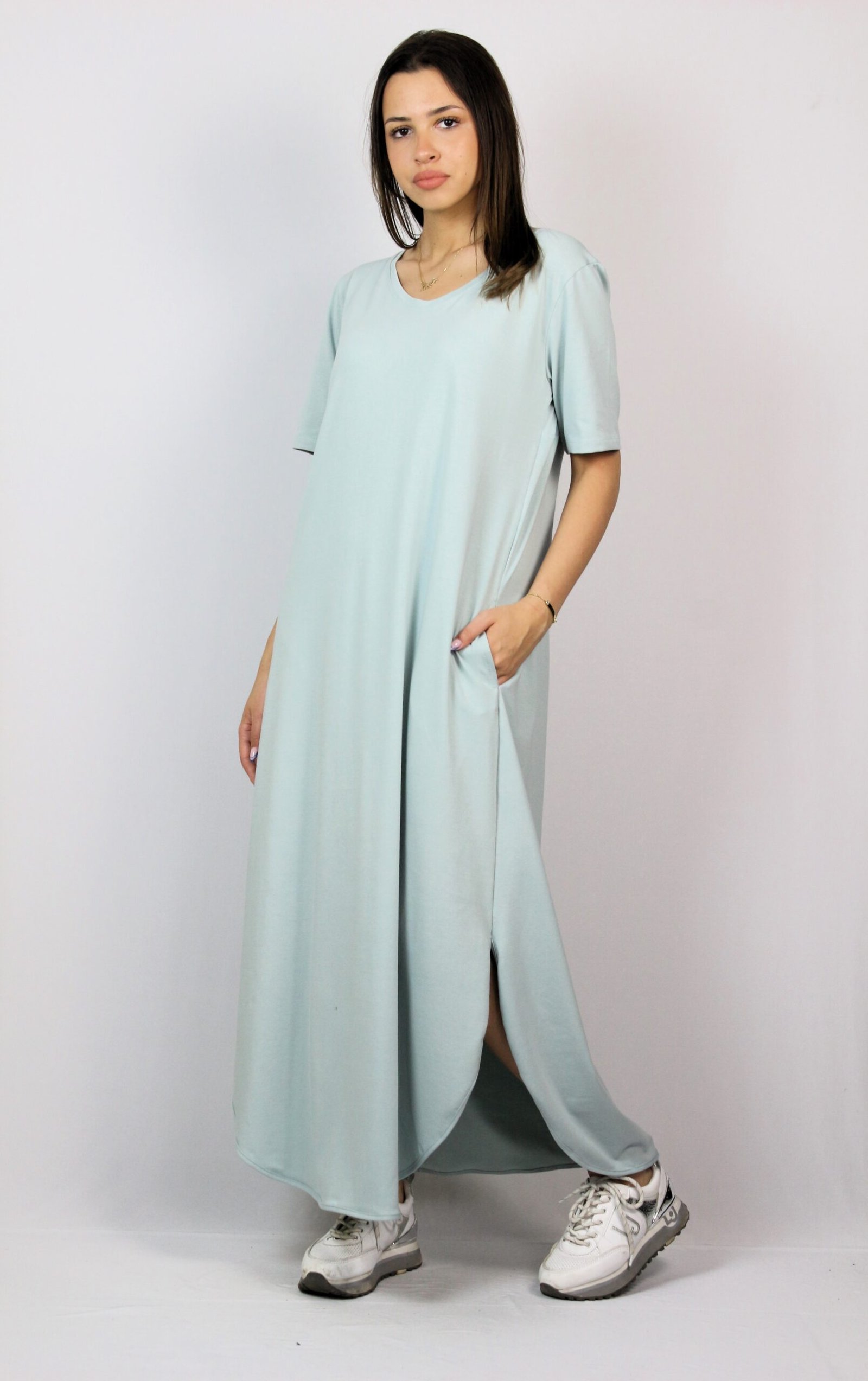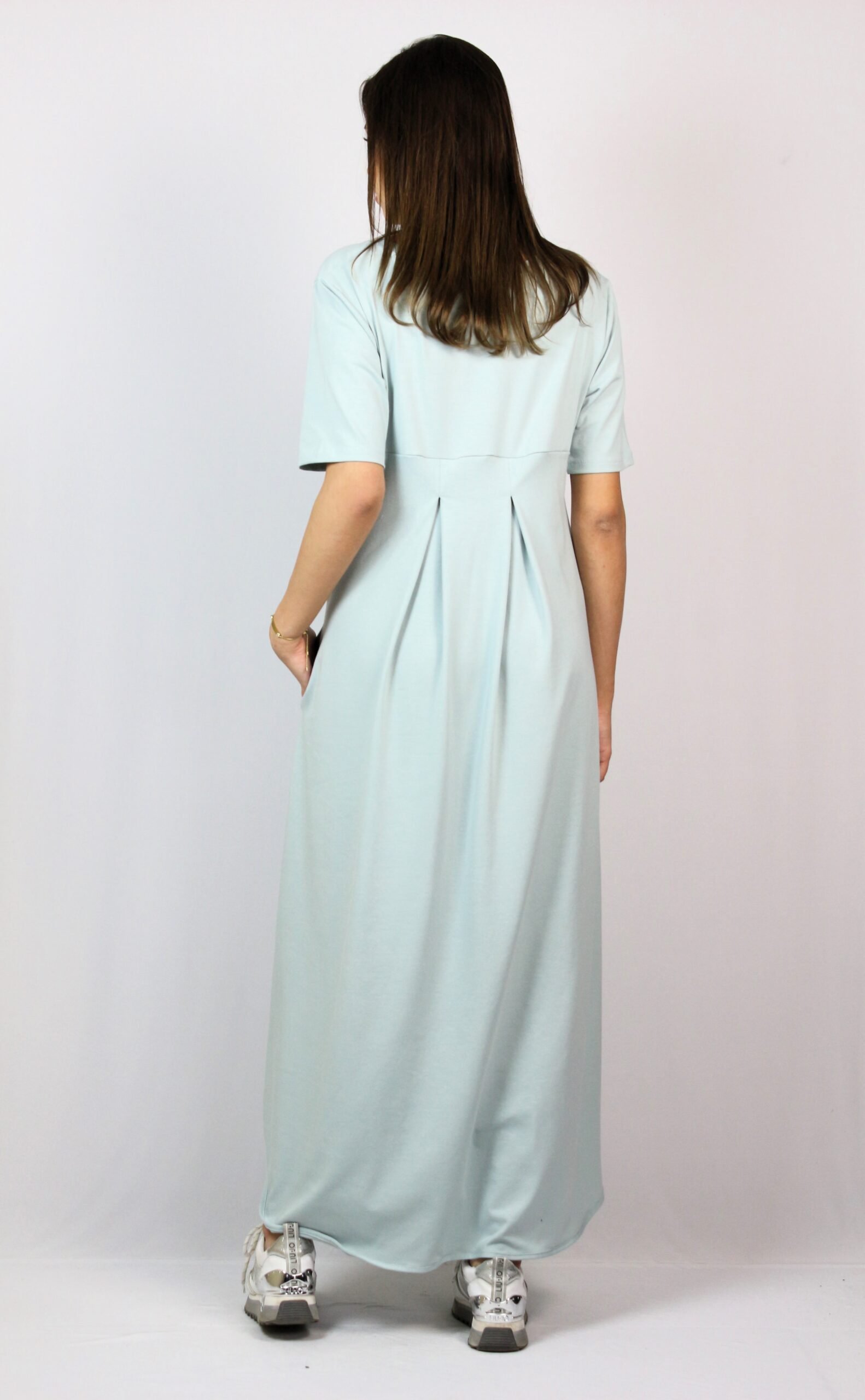 Рокля с къс ръкав, вътрешни джобове и две заоблени цепки отстрани. На гърба има платка с две плохи .Изработена е от памучно трико 95% памук и 5% еластан.