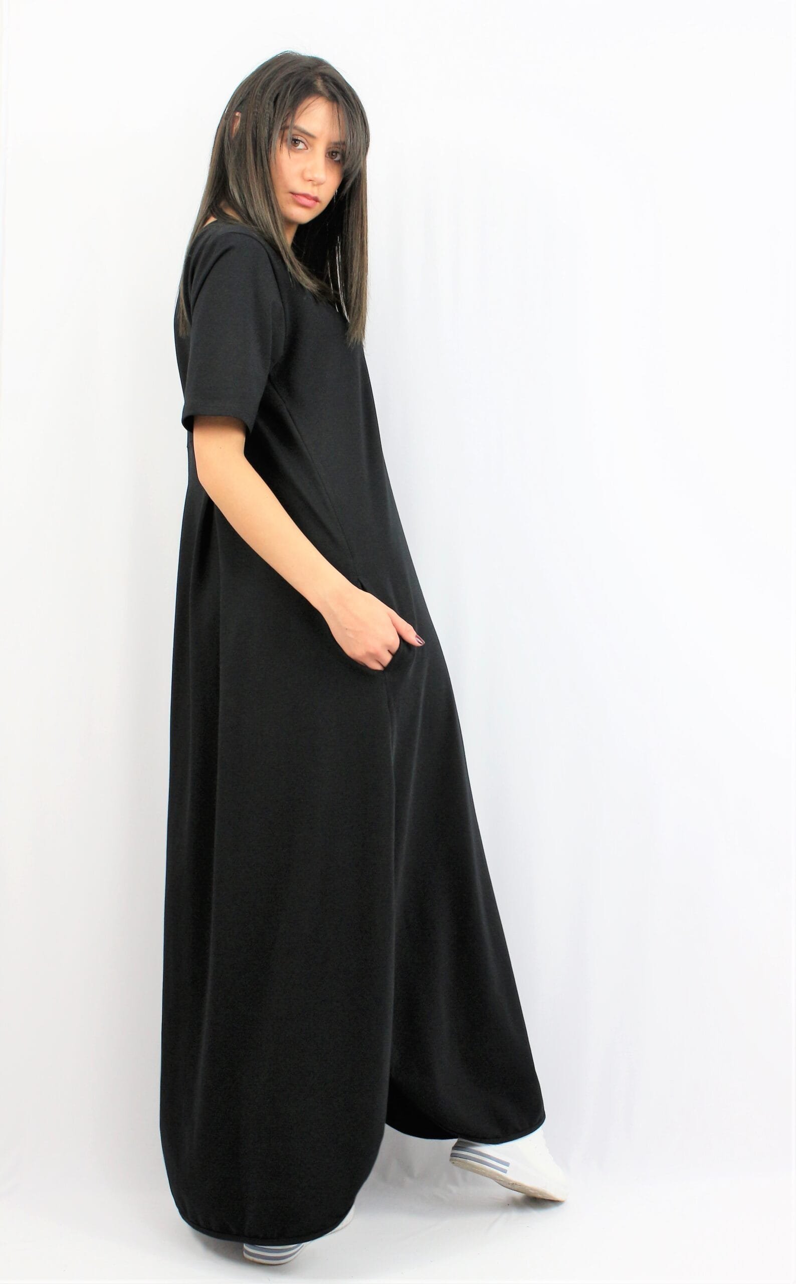 Рокля с къс ръкав, вътрешни джобове и две заоблени цепки отстрани. На гърба има платка с две плохи .Изработена е от памучно трико 95% памук и 5% еластан.
