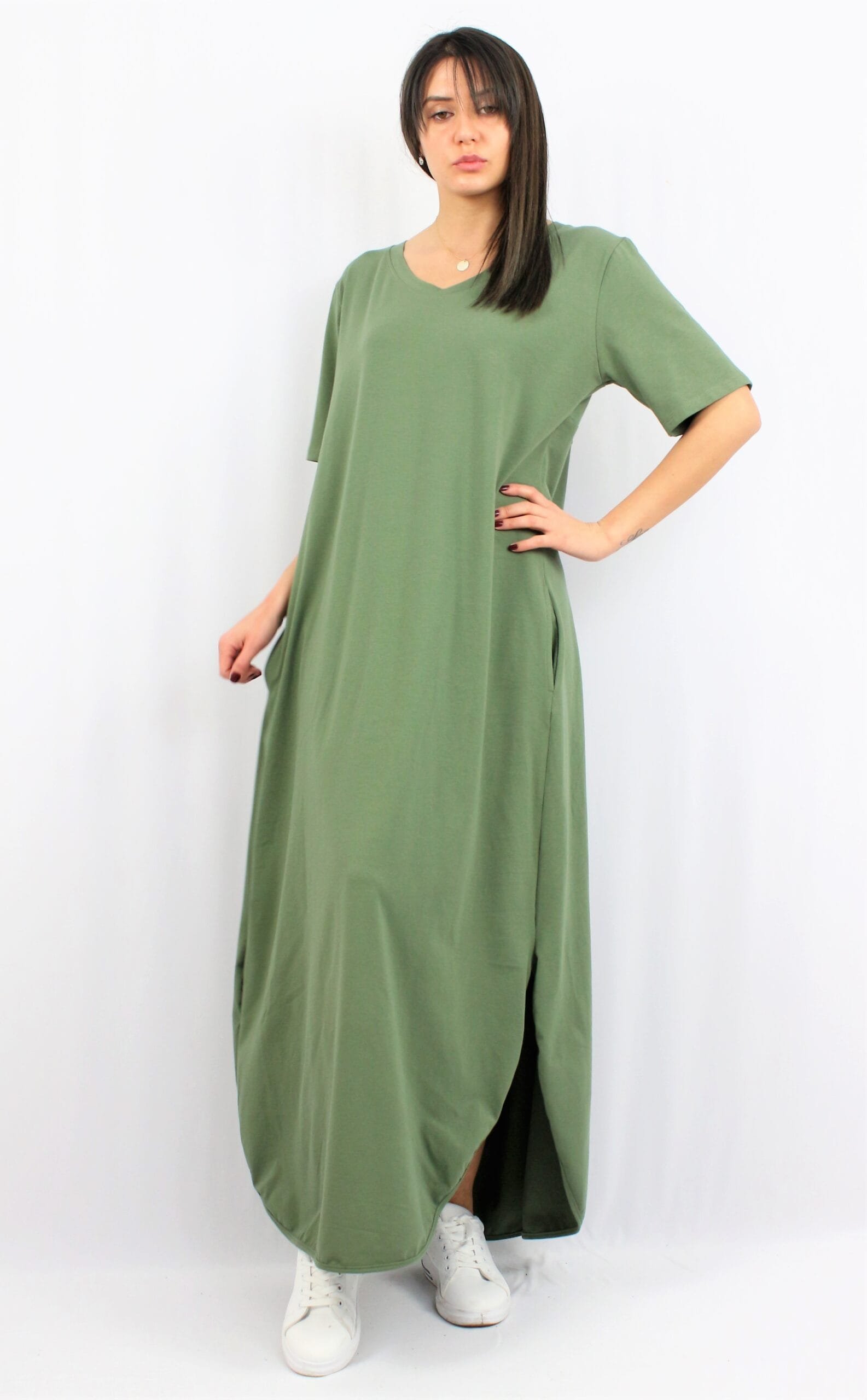 Рокля с къс ръкав, вътрешни джобове и две заоблени цепки отстрани. На гърба има платка с две плохи .Изработена е от памучно трико 95% памук и 5% еластан.