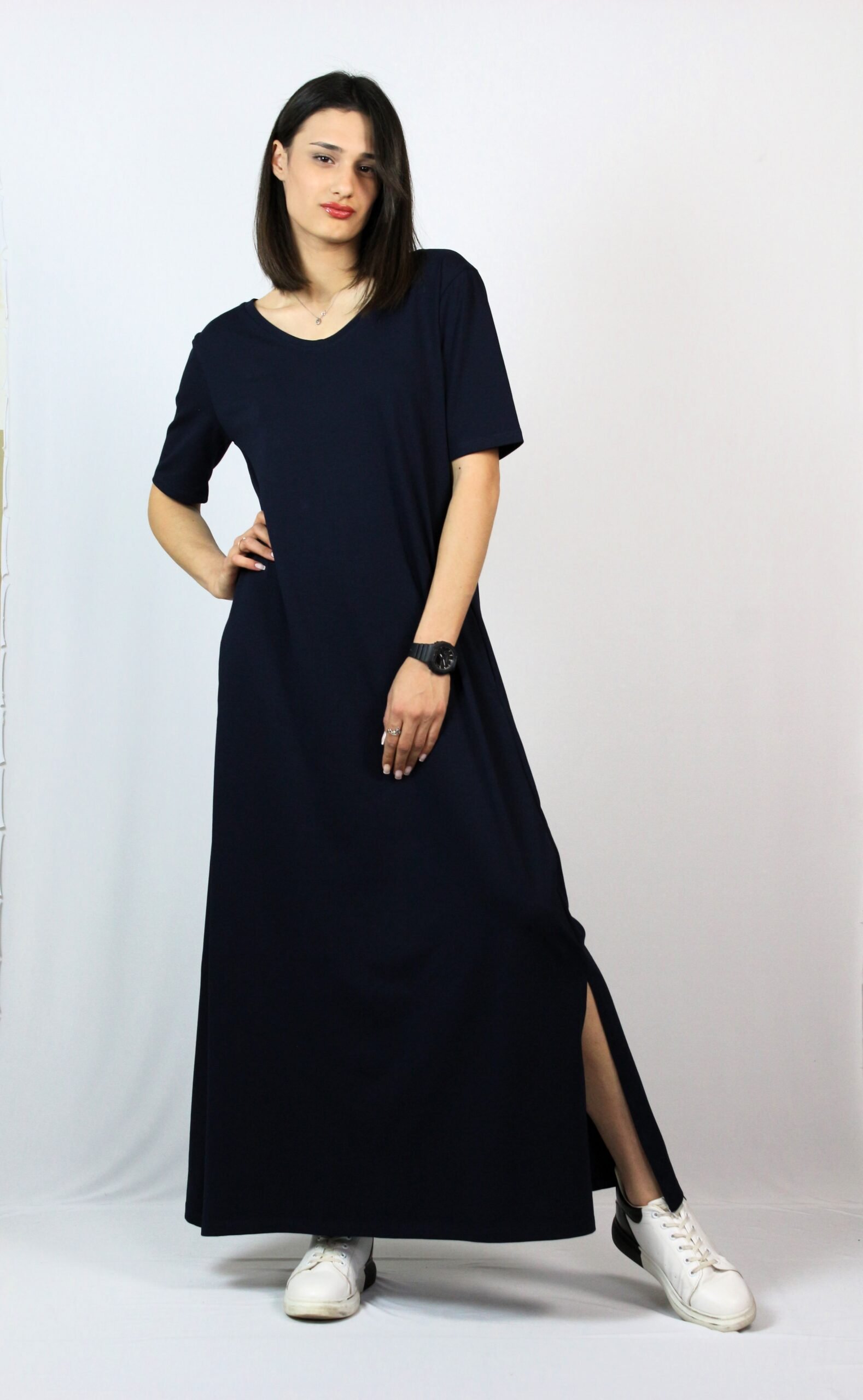 Рокля с къс ръкав, вътрешни джобове и две цепки отстрани. На гърба има платка с плохи .Изработена е от памучно трико 95% памук и 5% еластан.