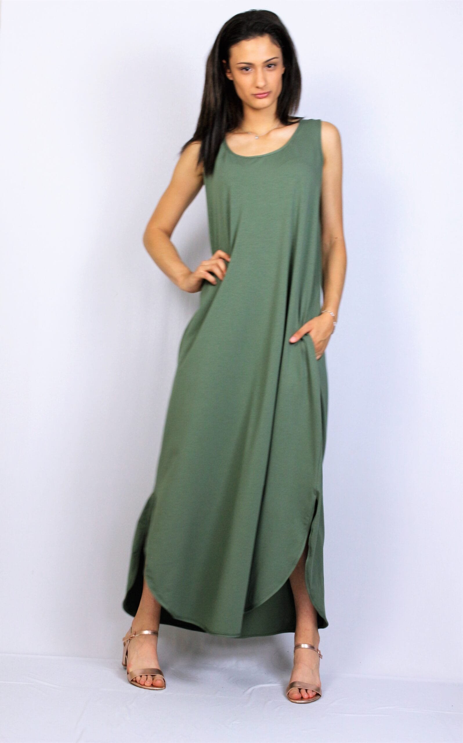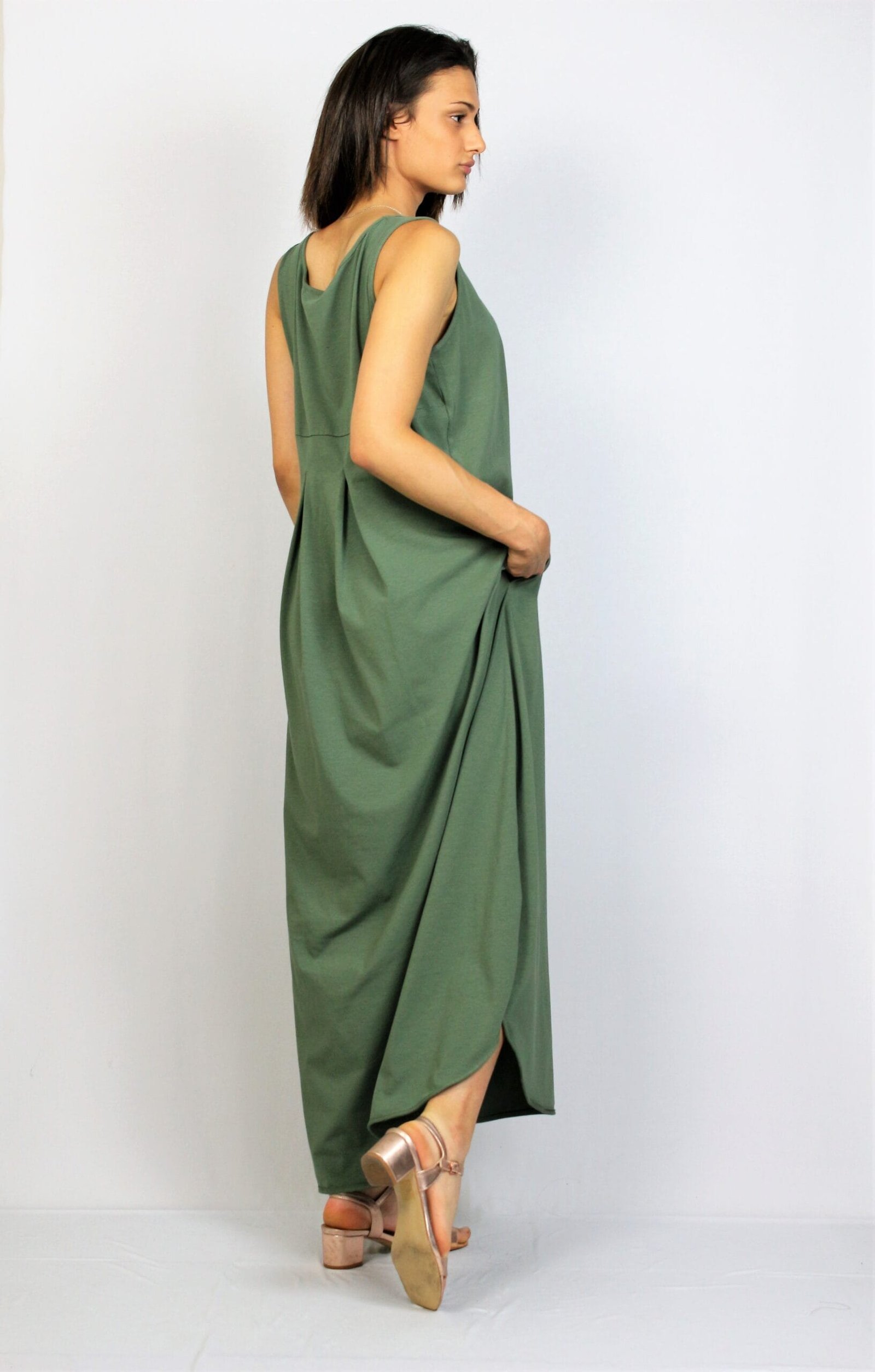 Рокля без ръкав, вътрешни джобове и две заоблени цепки отстрани. На гърба има платка с две плохи