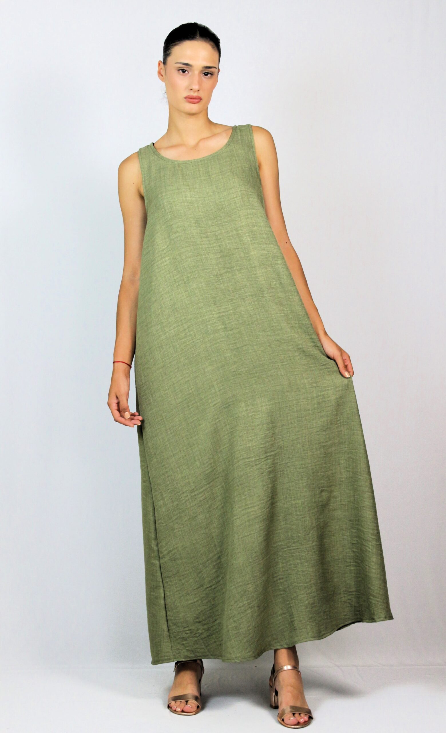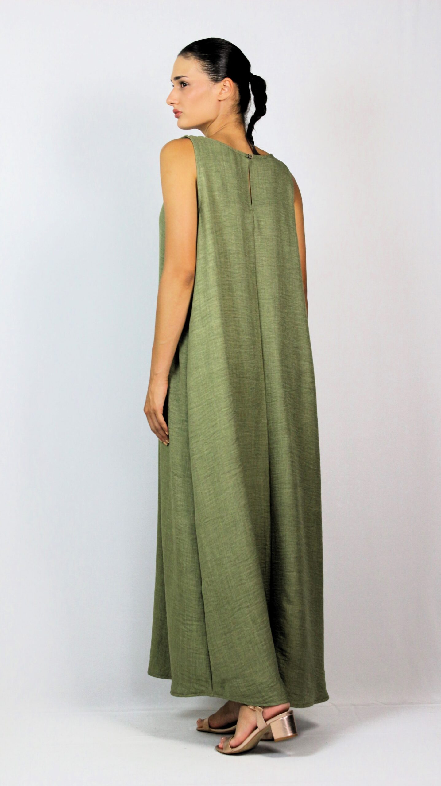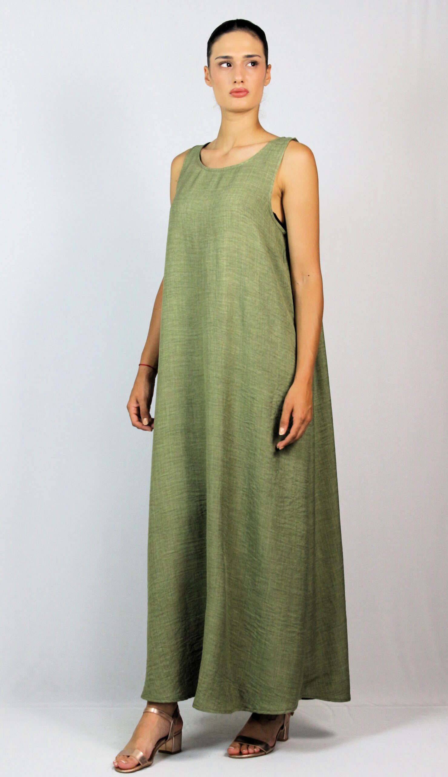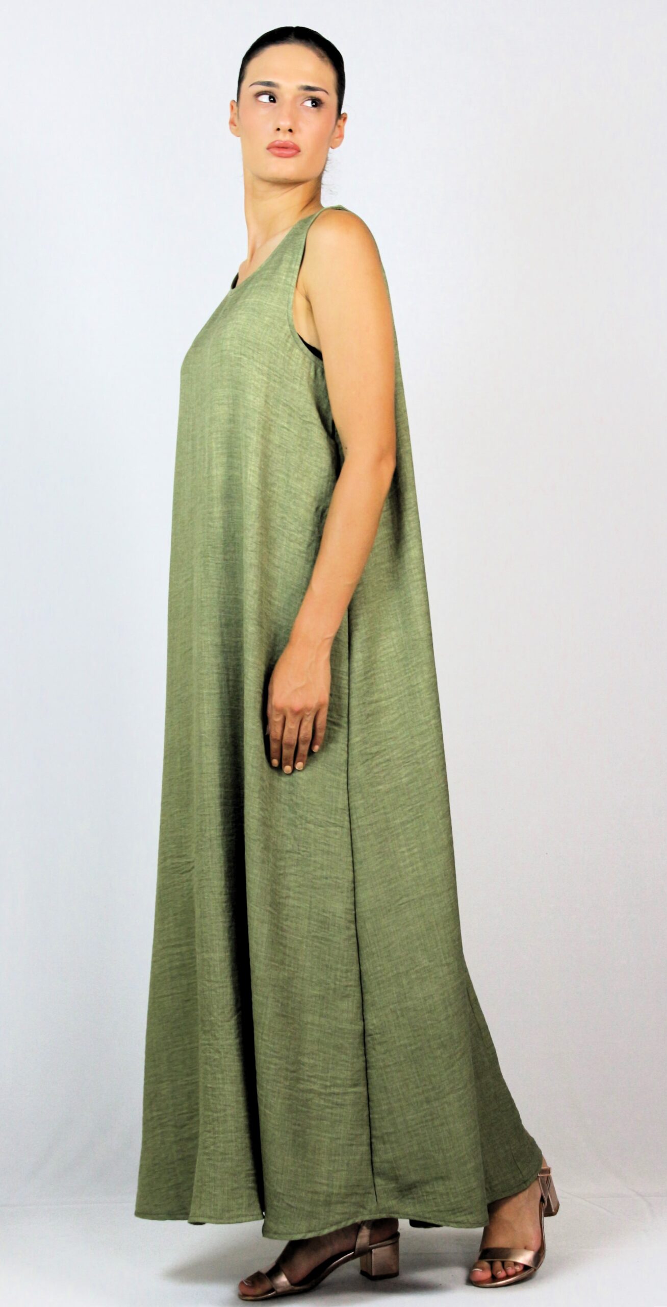Дълга свободна рокля без ръкави, изработена от лека тъкан. Обло деколте. Закопчаване с копче на гърба.