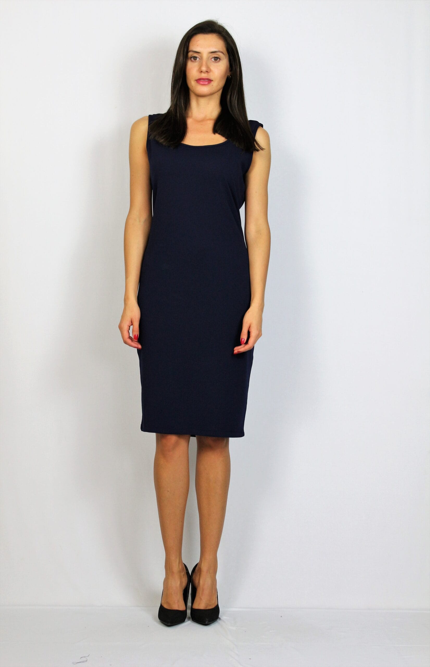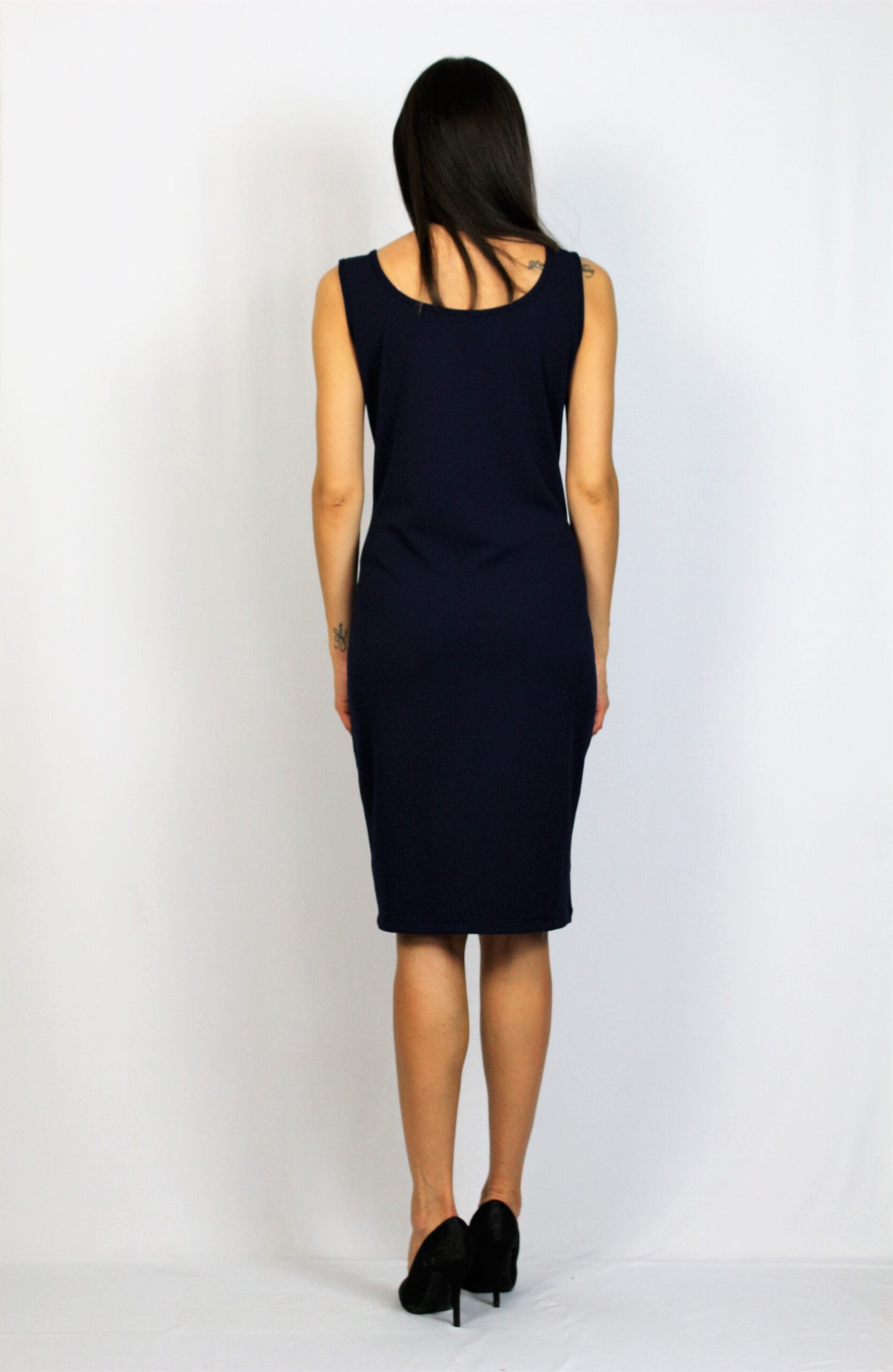 Еластична рокля без ръкав изработена от креп неопрен -полиестер с еластан. Комбинирана е леко падаща туника от еластична дантела.Мерките са в неразтегнато състояние на плата, който е много еластичен.