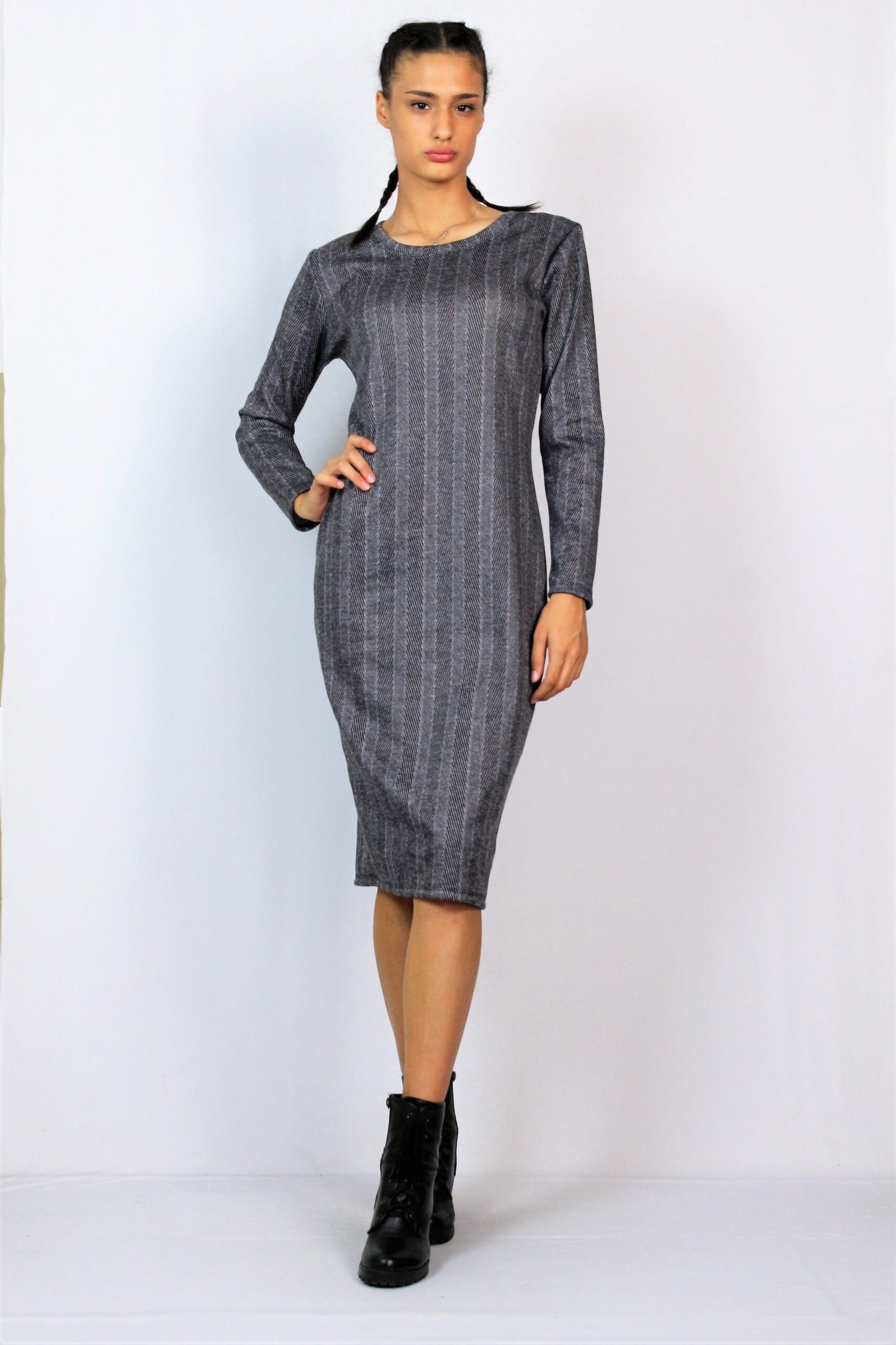 Рокля права изчистена кройка изработена от еластичен креп неопрен .