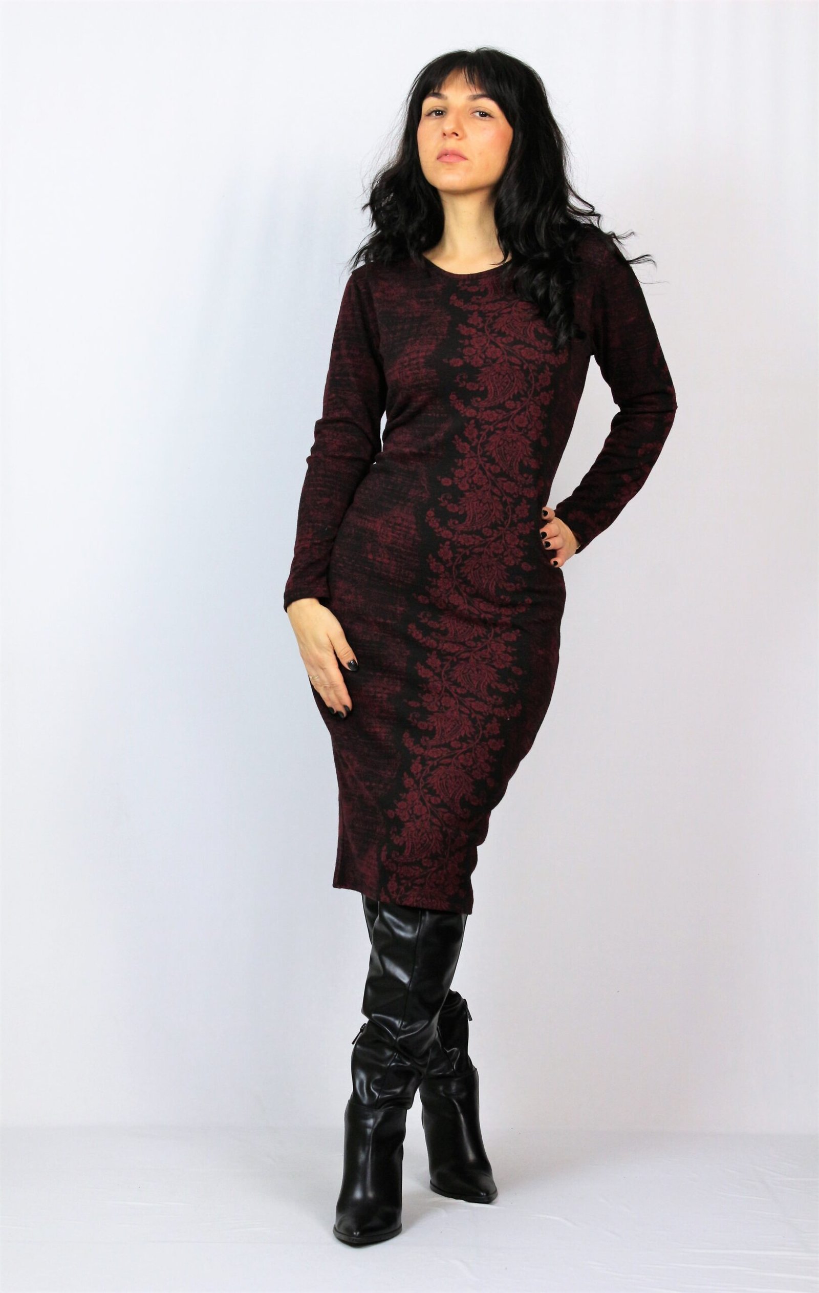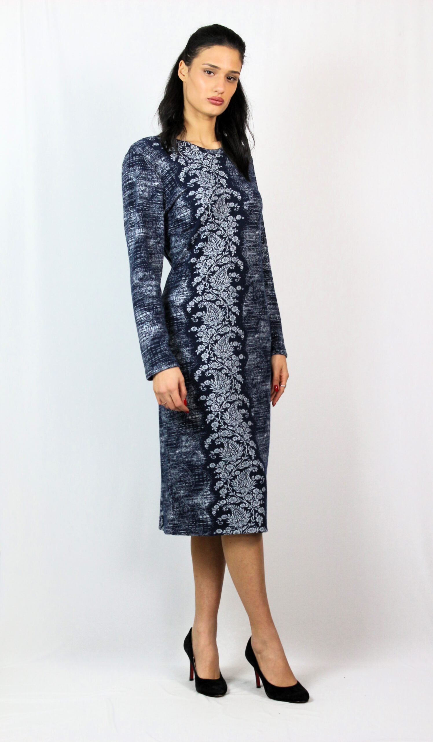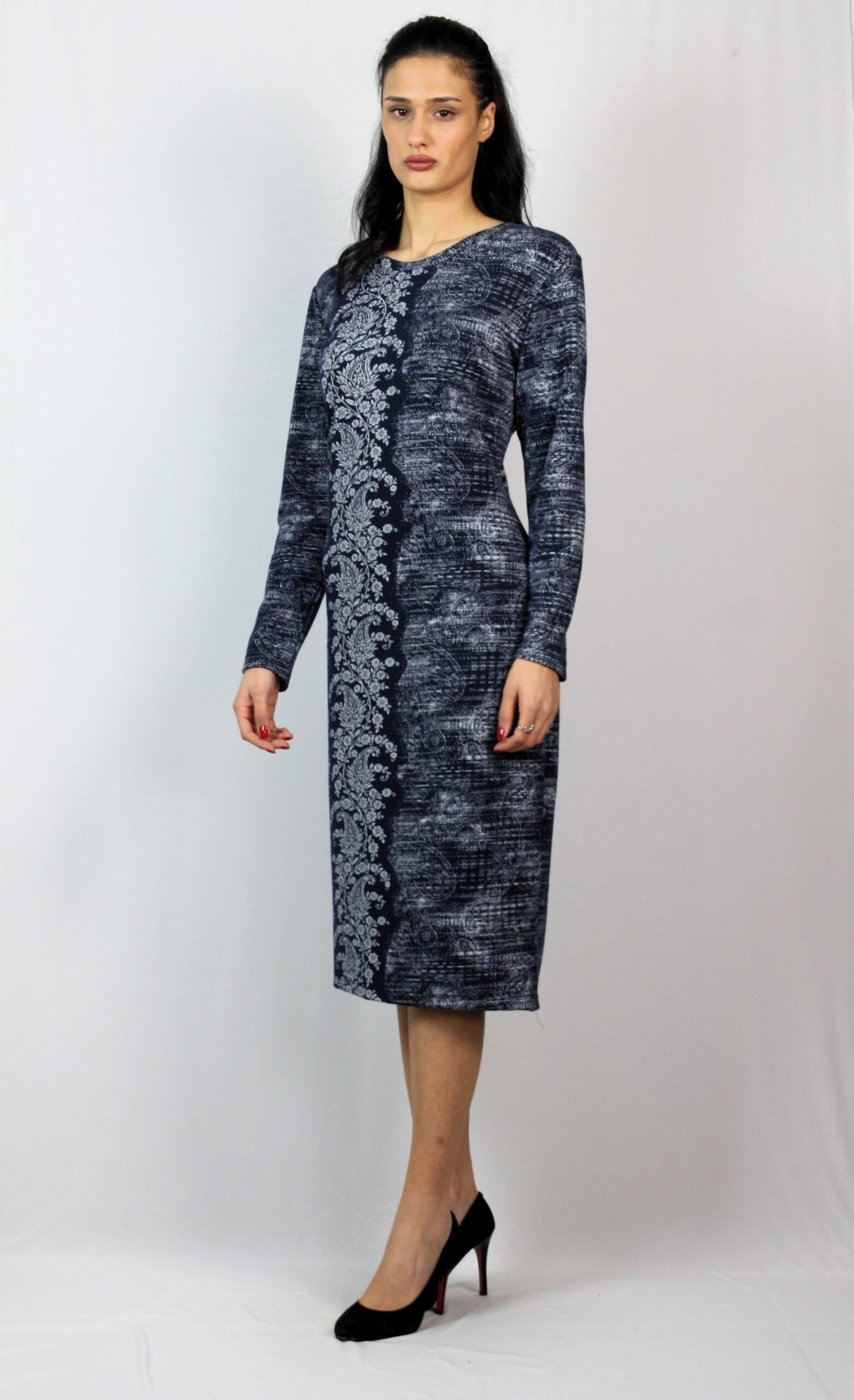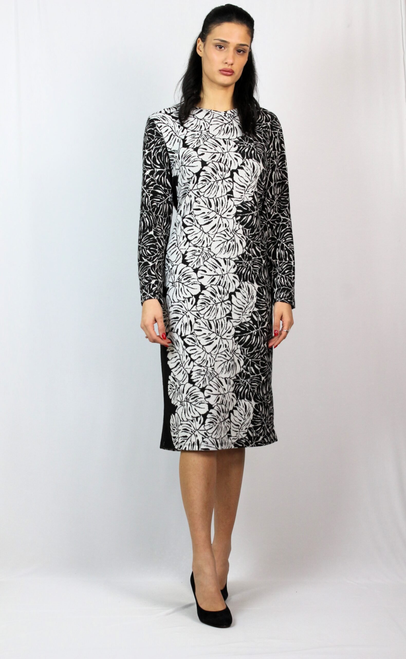 Права рокля с дълъг ръкав и обло деколте.