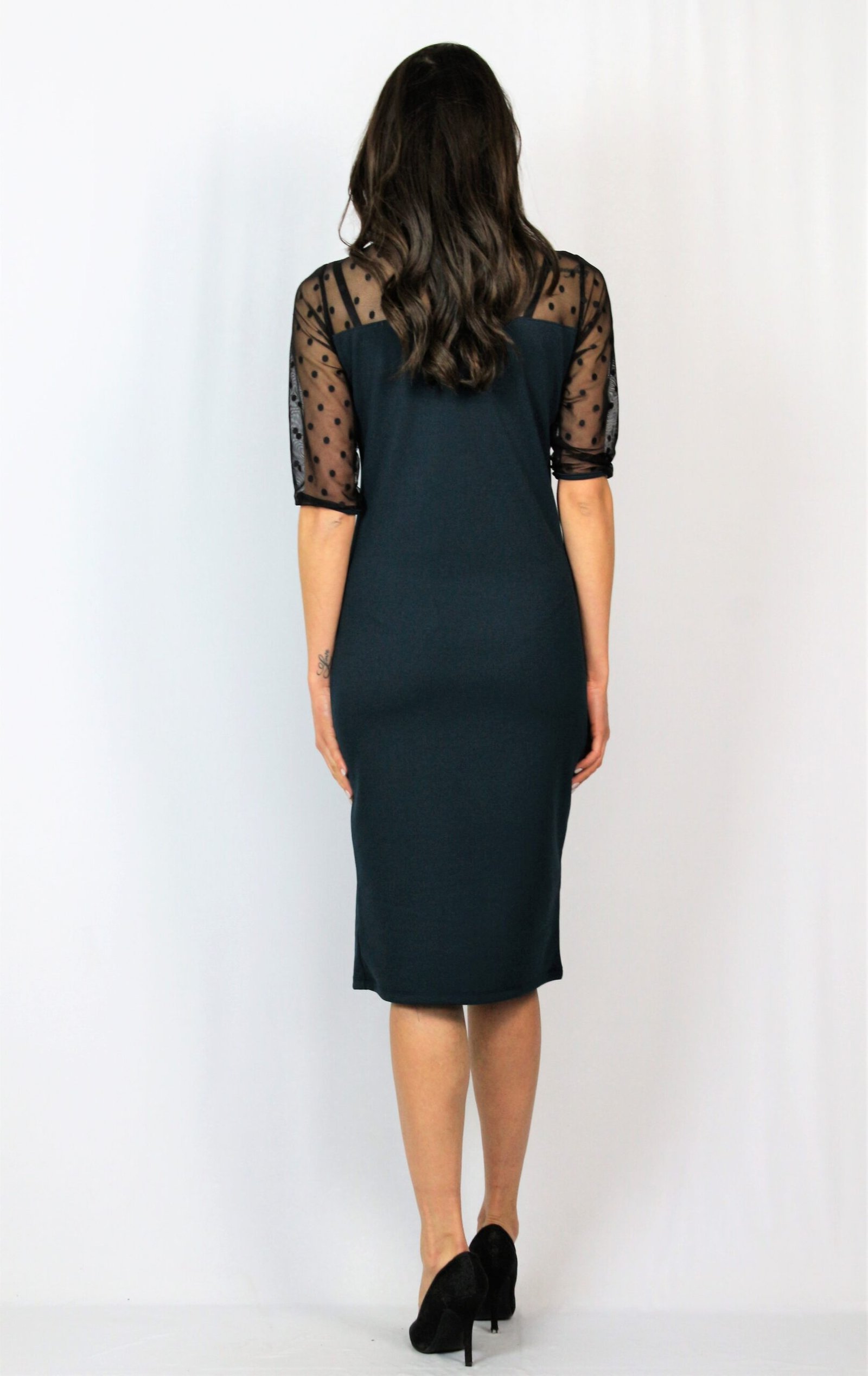 Права рокля с тюлени платки и три-четвърт ръкав. Изработена от еластичен плат креп неопрен – полиестер с еластан.