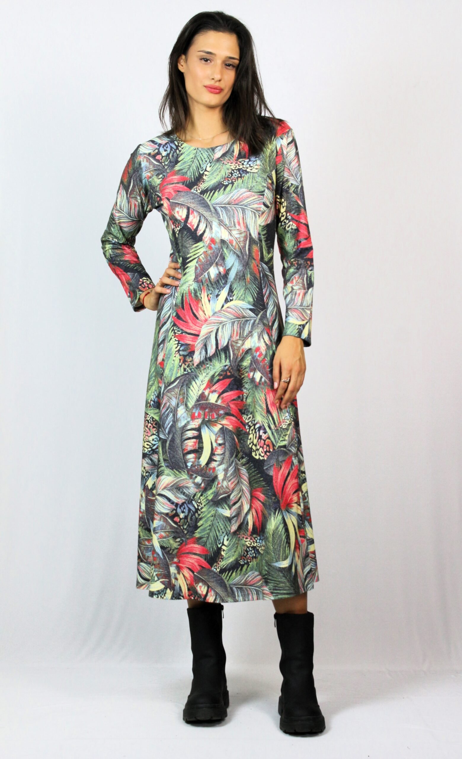 Елегантна рокля с цветен принт , меката материя пада красиво , а разкроения модел осигурява коморт и женственост. Подходяща за ежедневието , офиса и специални поводи. Изработена от високо качествена вискоза с еластан.