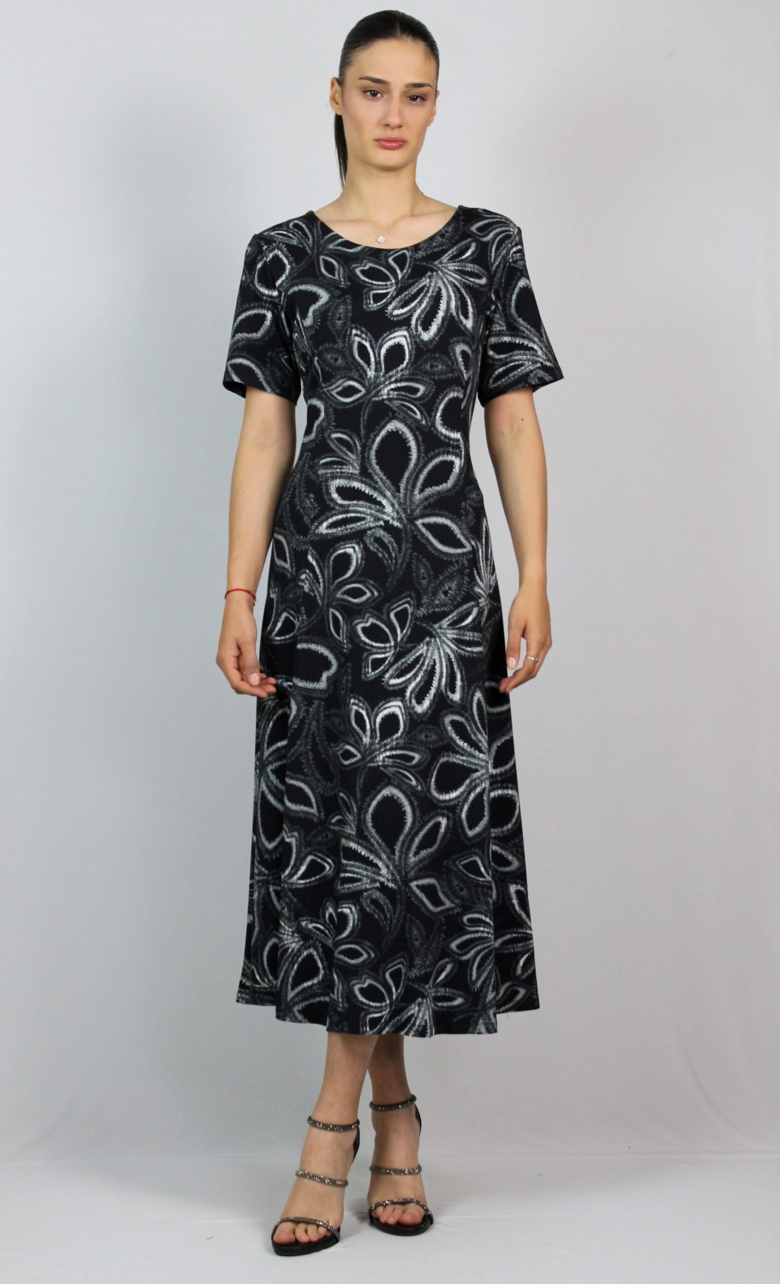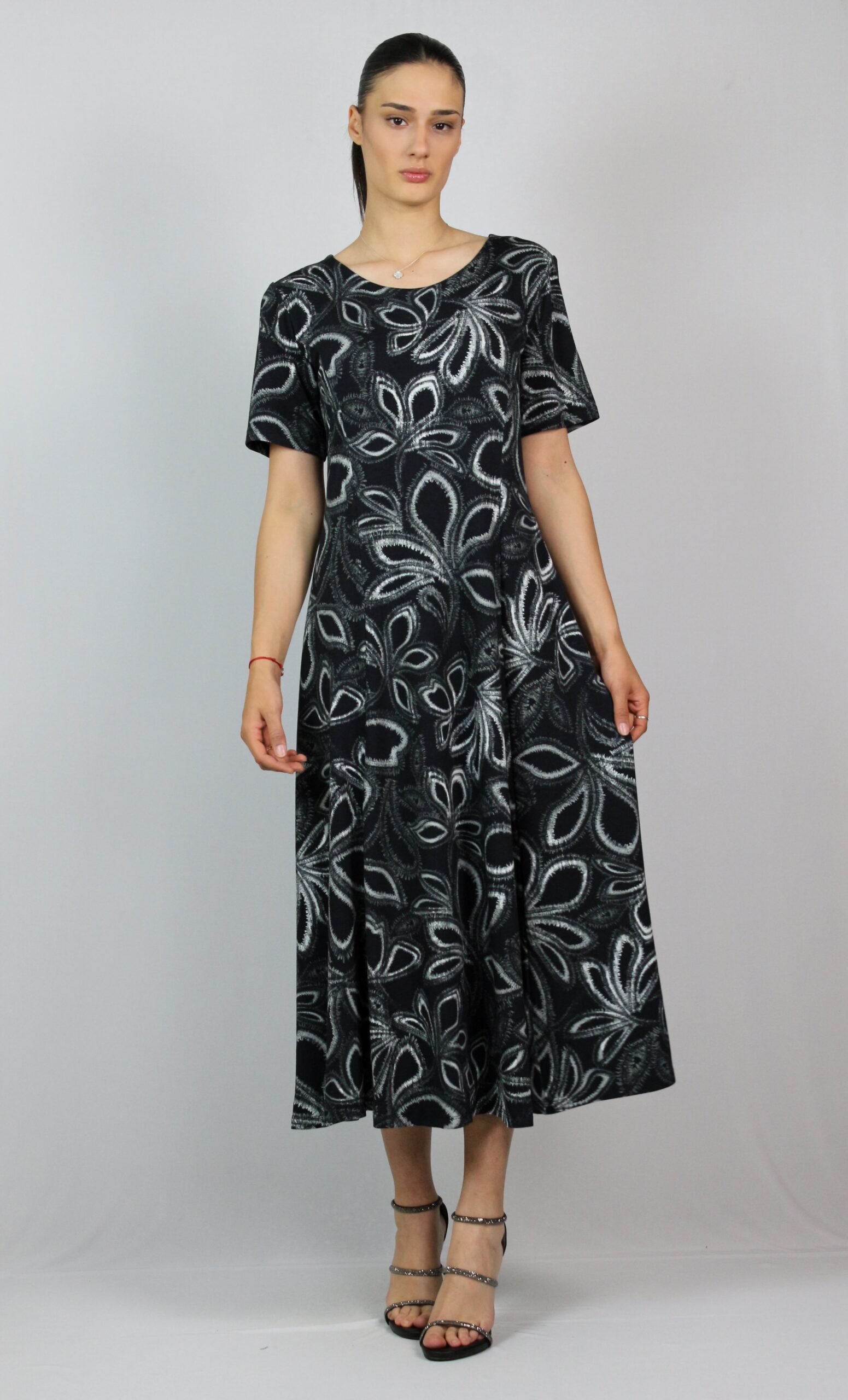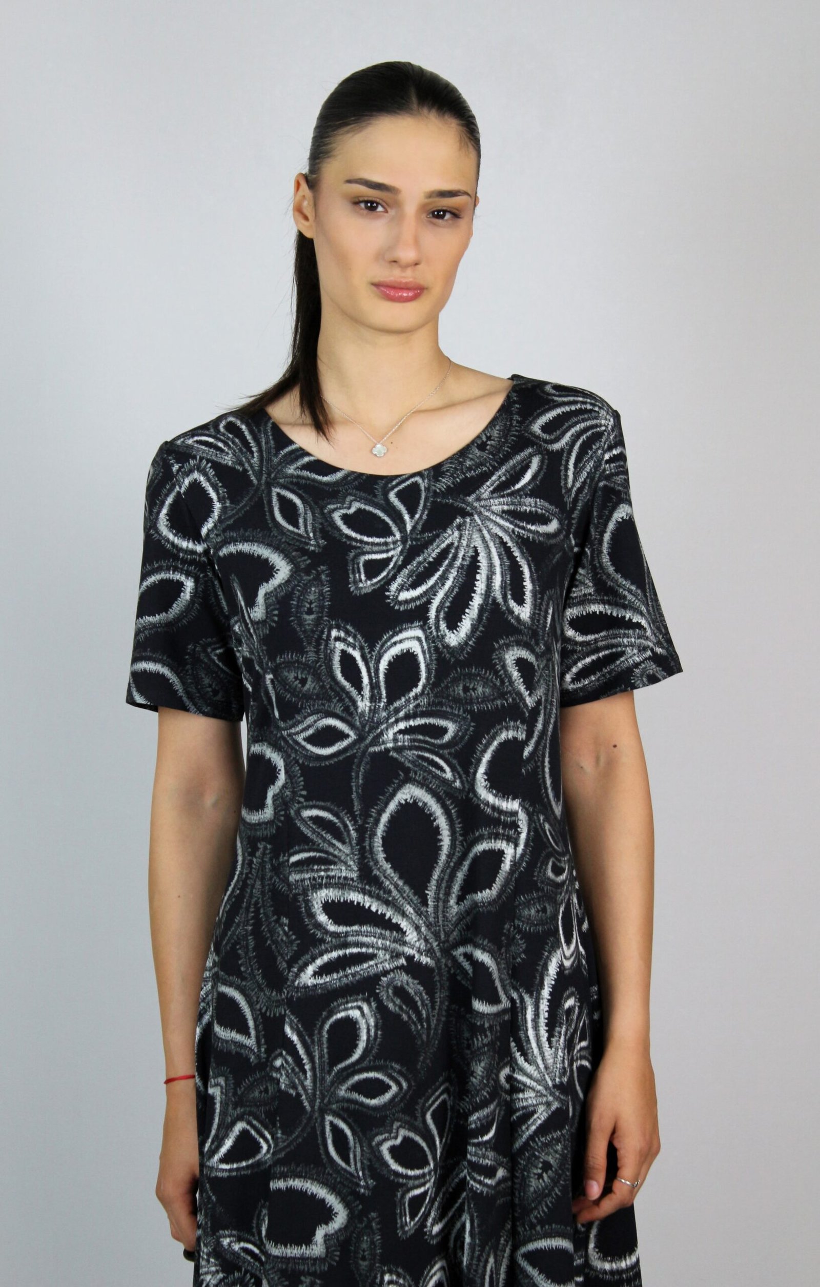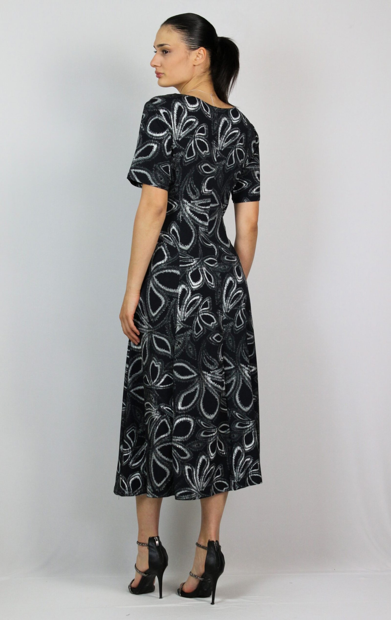 Разкроена рокля с обло деколте и къс ръкав.Изработена от високо качествена вискоза с еластан.