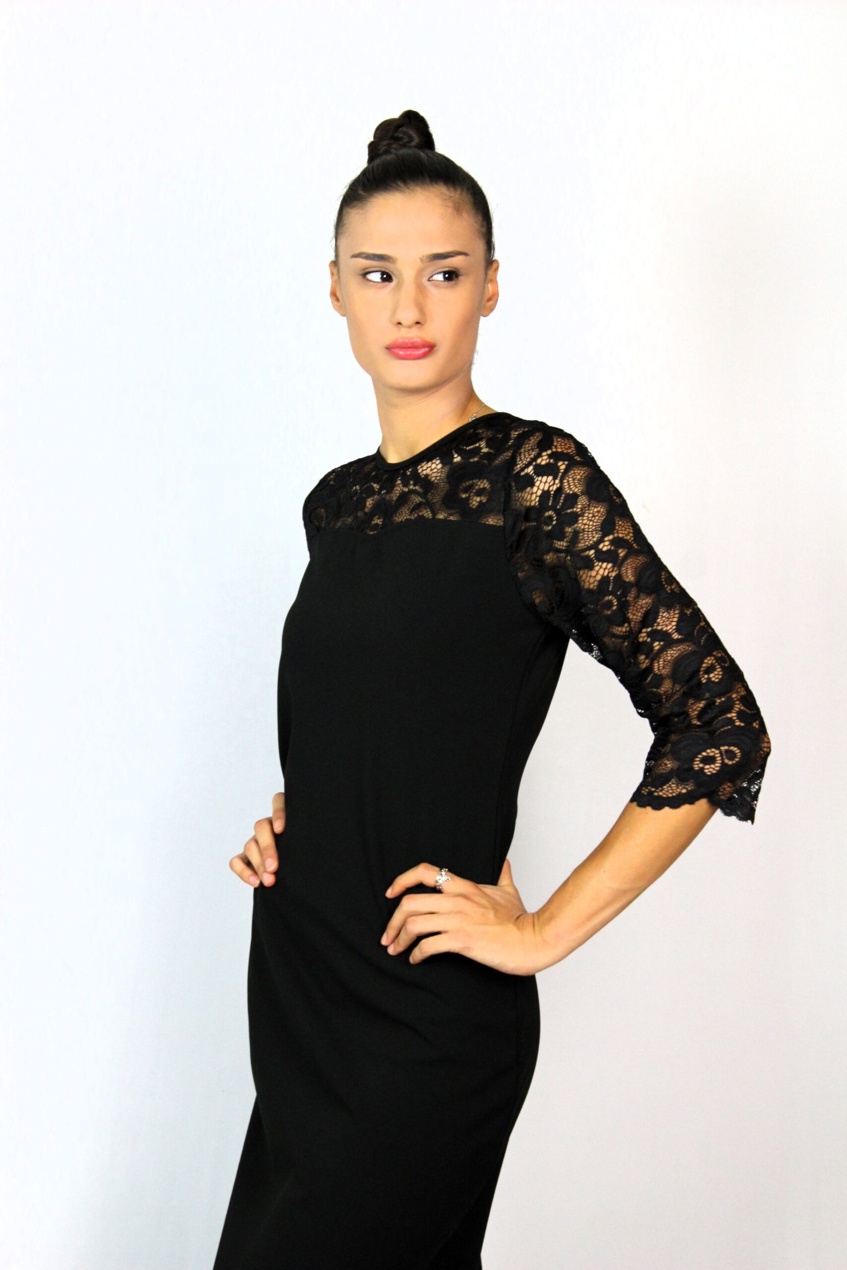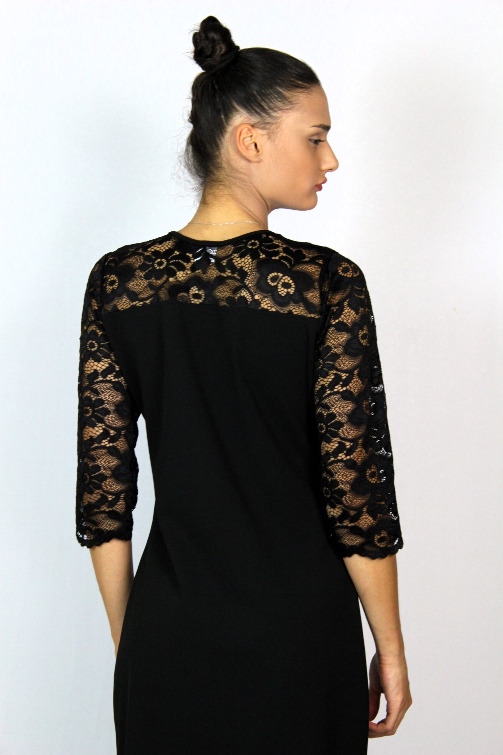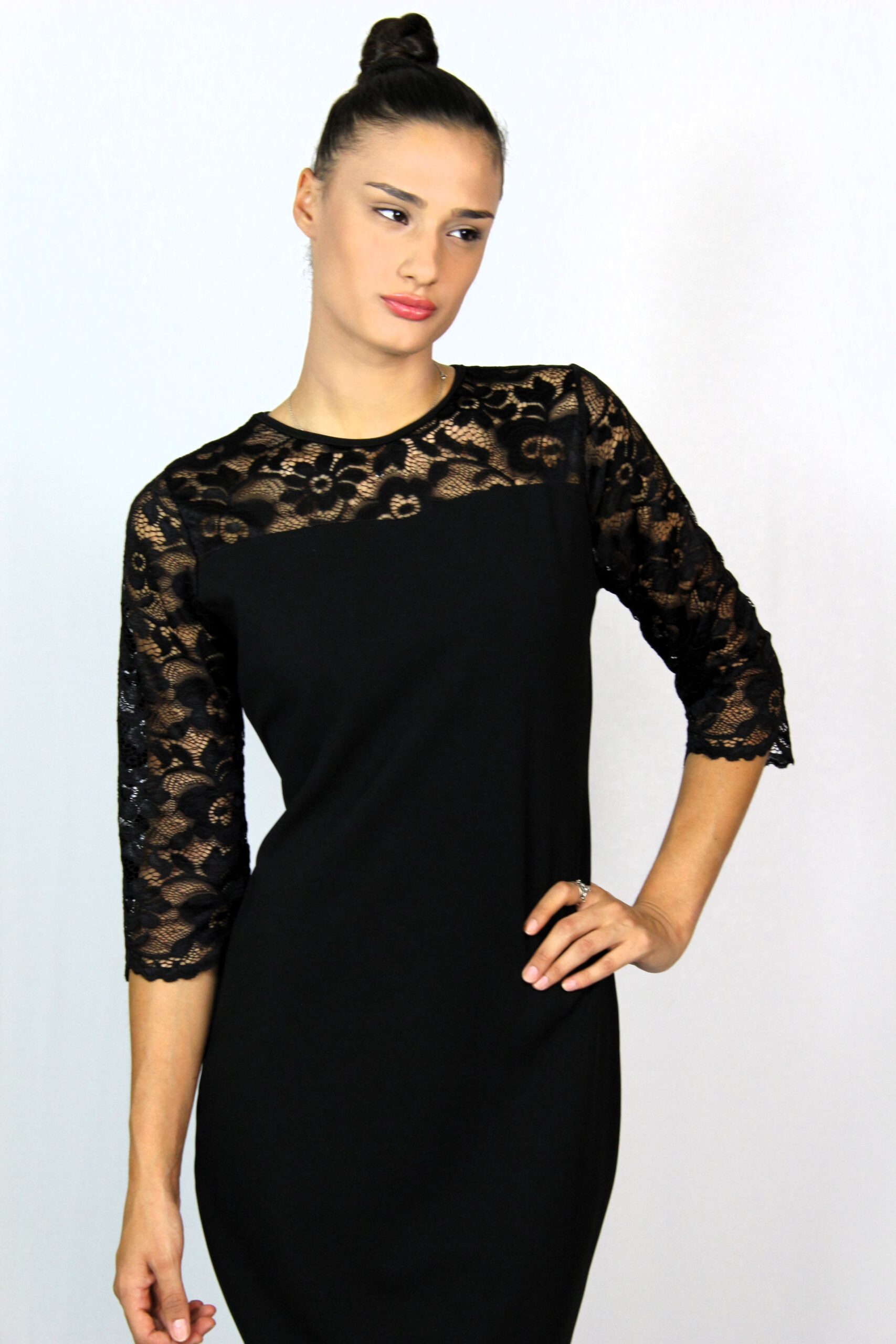 Права рокля с дантелени платки отпред и отзад ,с три-четвърт ръкав ,изработена от еластичен плат креп неопрен – полиестер с еластан.