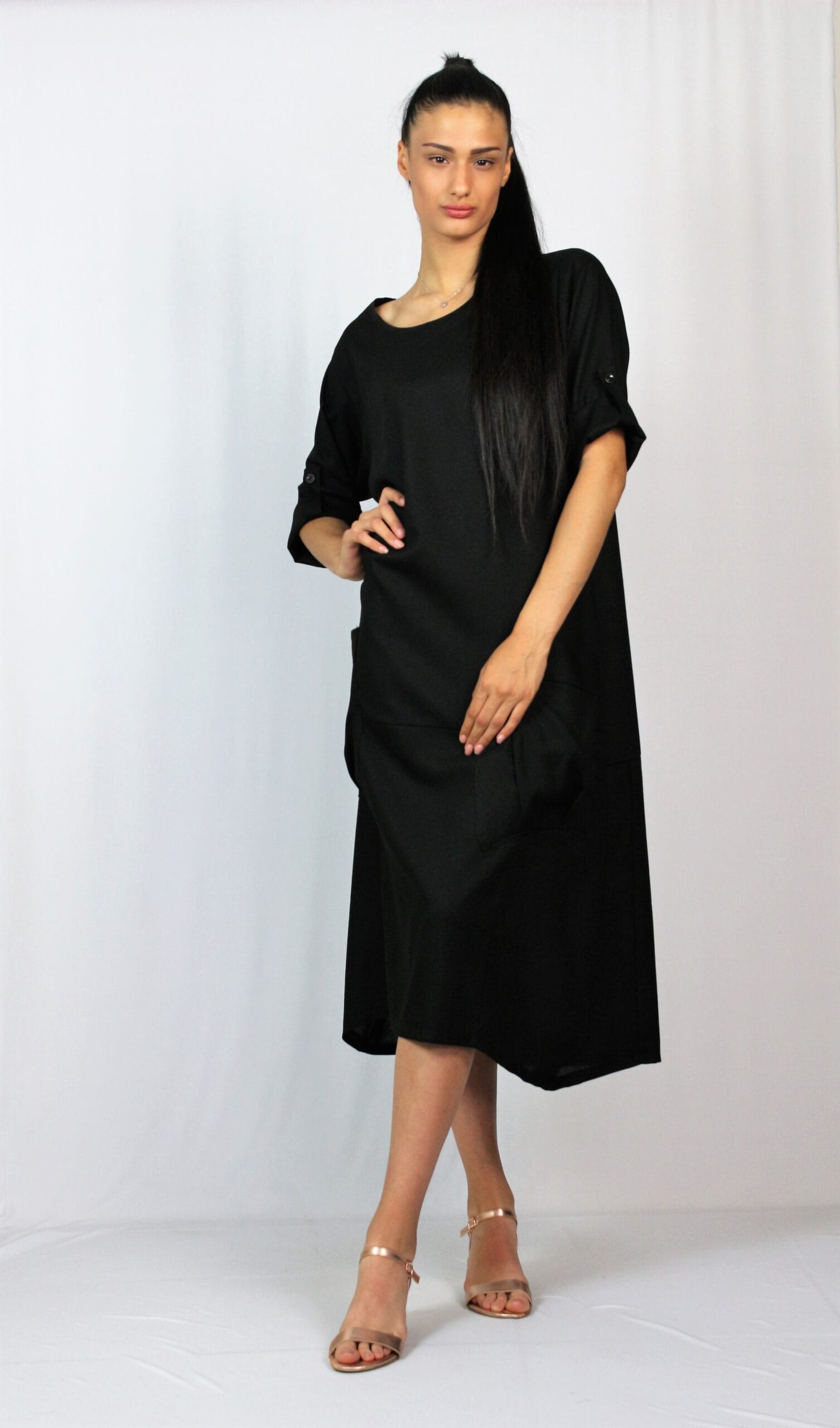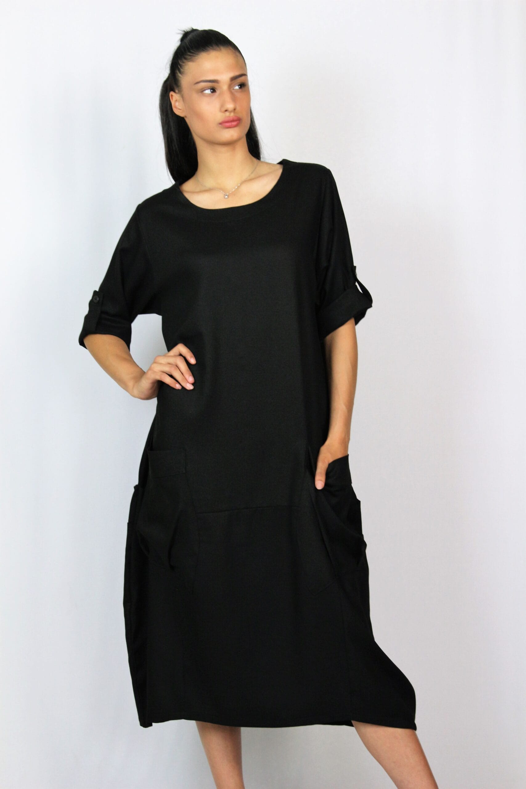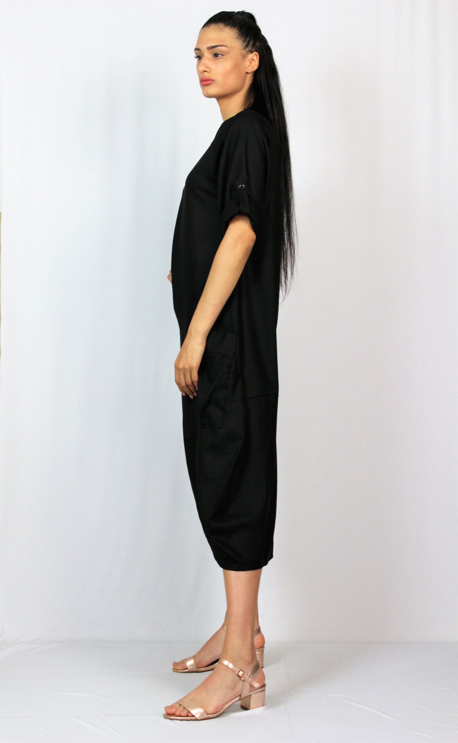 Рокля тип балон свободно падаща надолу с два джоба, с тричетвърт ръкав ,който позволява да се вдига и става къс.