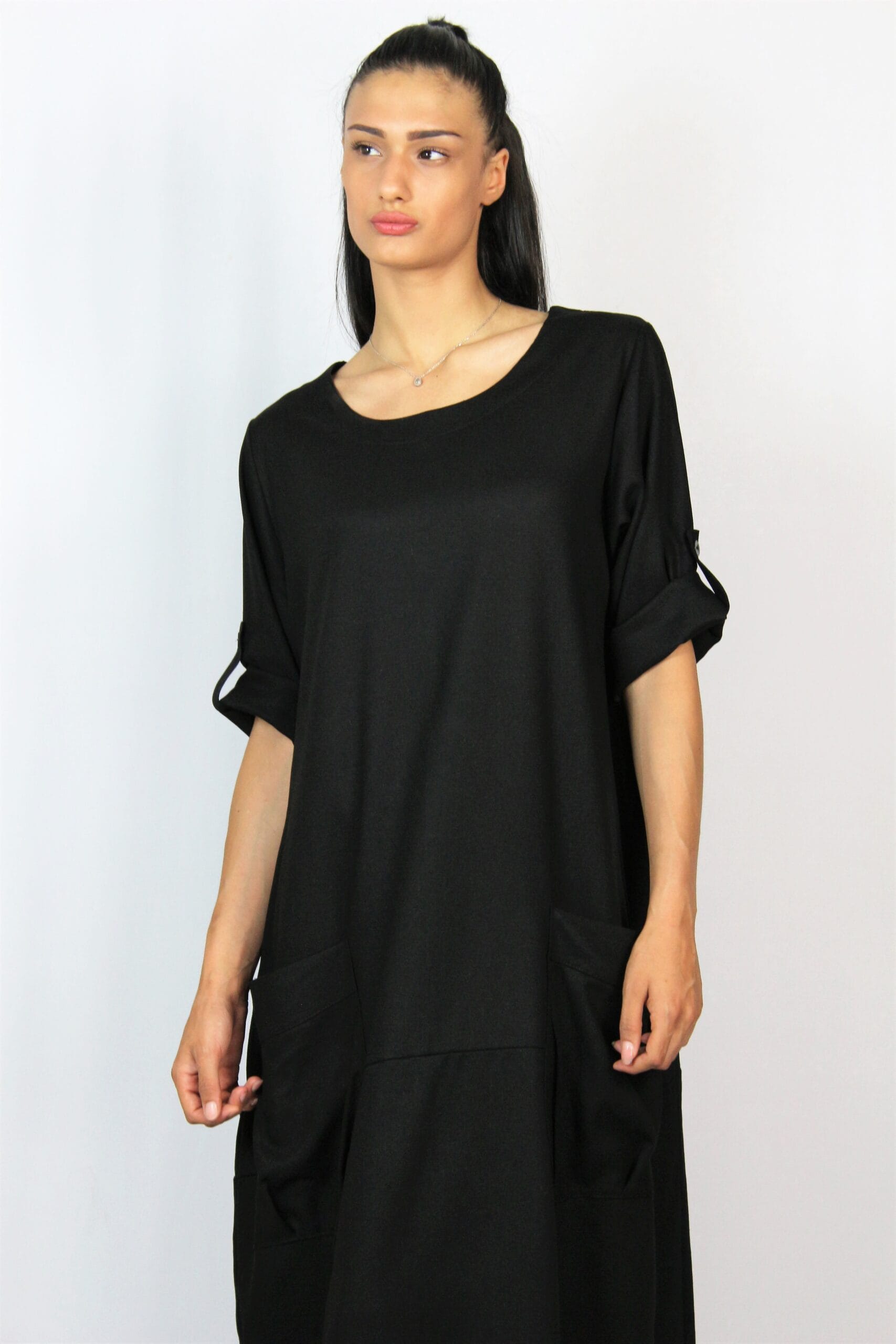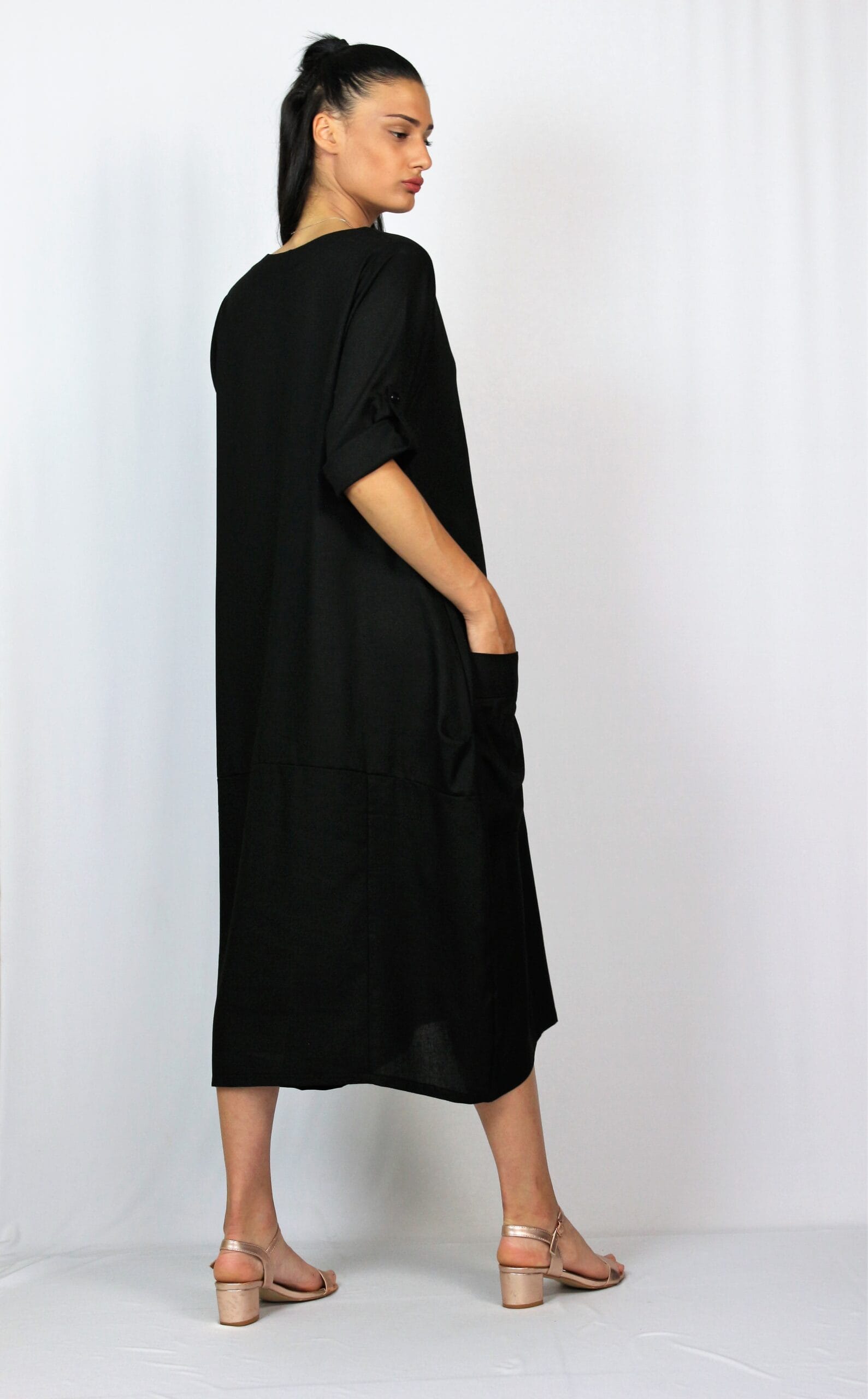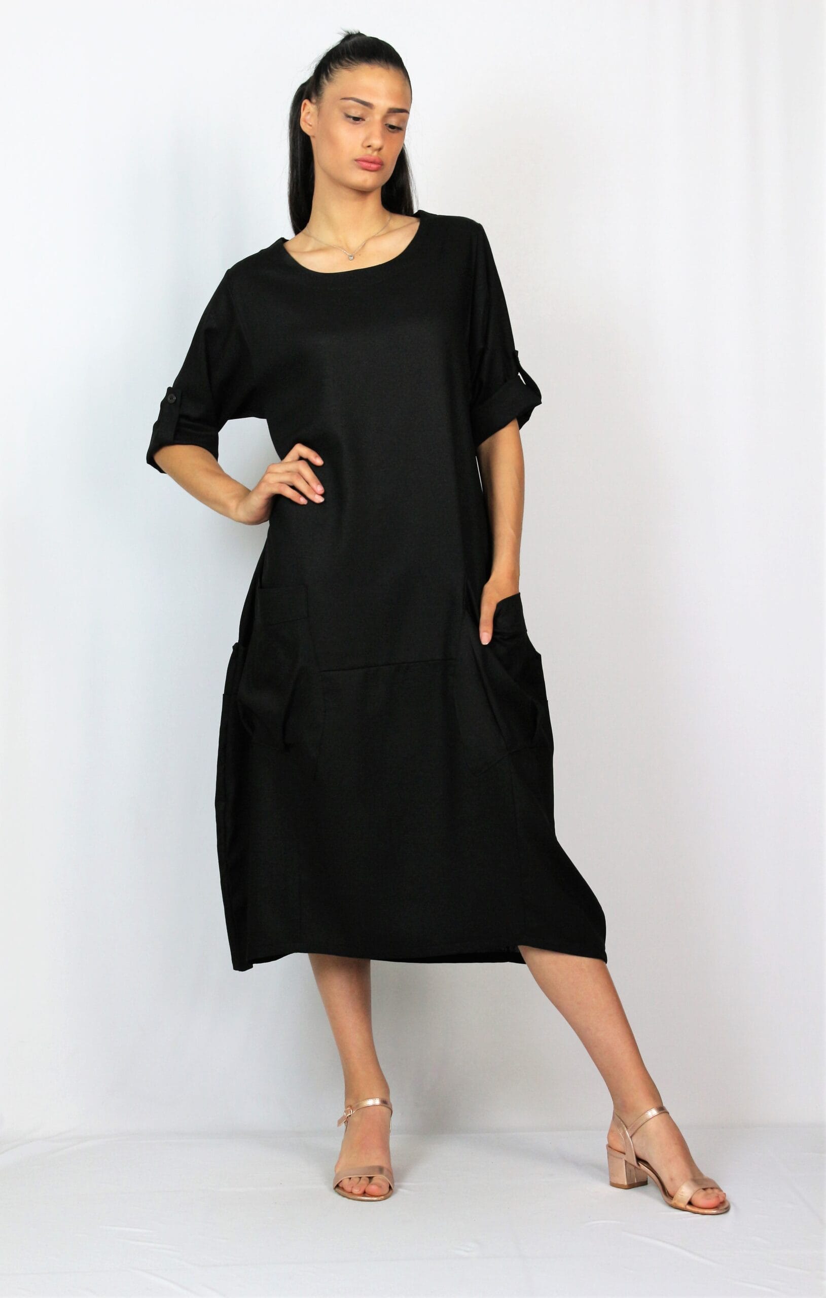 Рокля тип балон свободно падаща надолу с два джоба, с тричетвърт ръкав ,който позволява да се вдига и става къс.