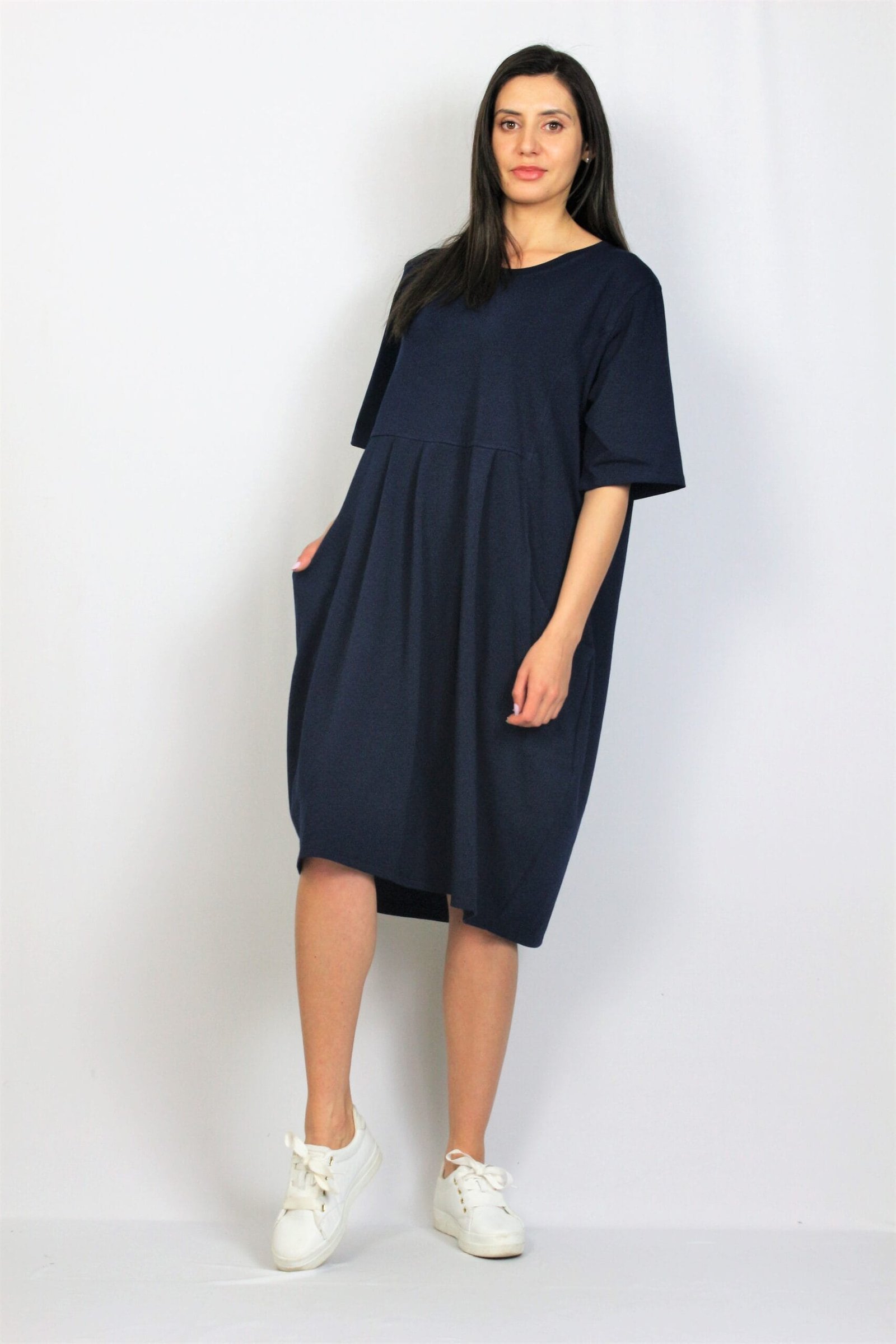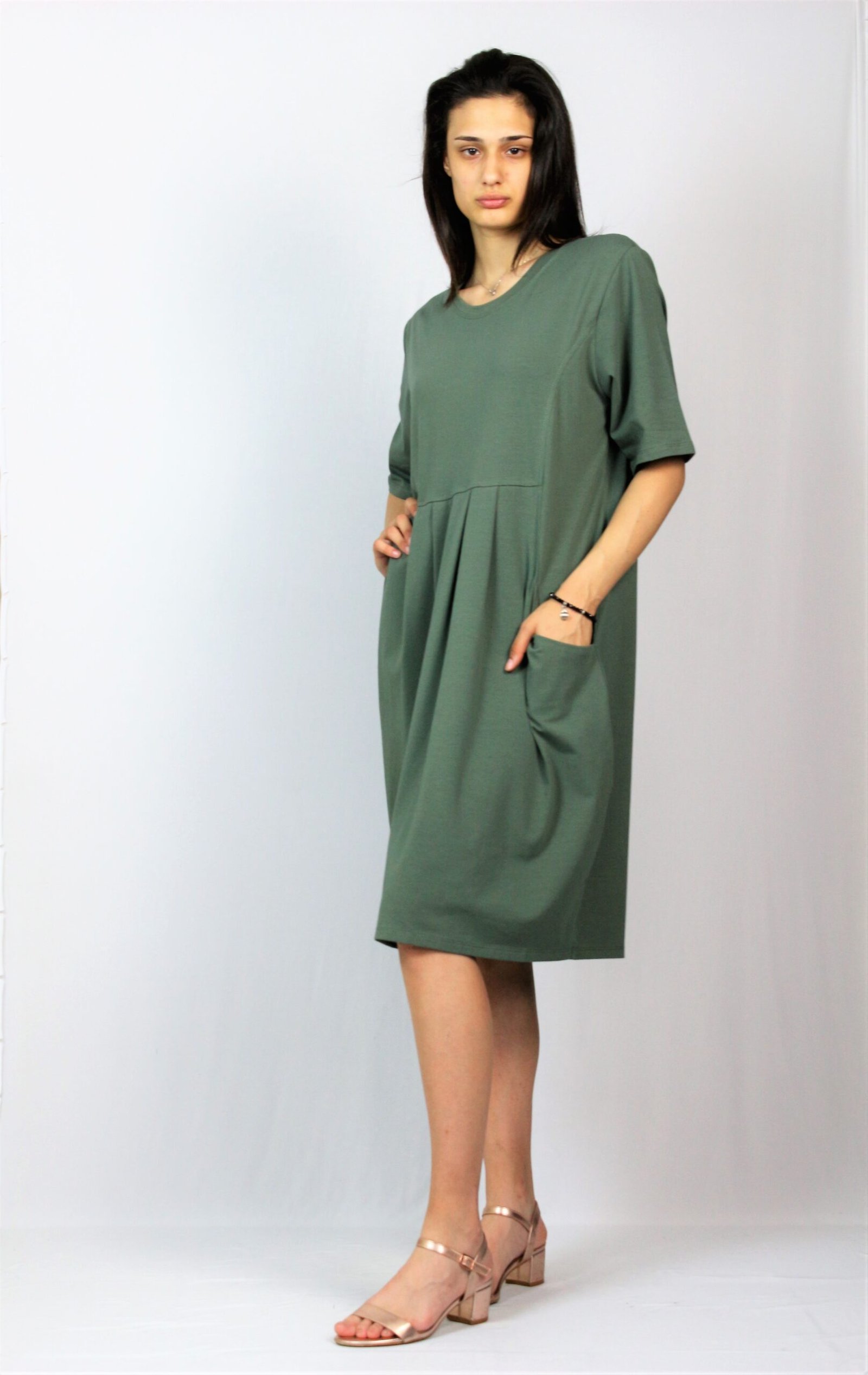 Свободно падаща рокля с два джоба и плохи на предната част . Изработена от памучно трико. Размерите са уголемени ,защото позволява да се носи по свободна.