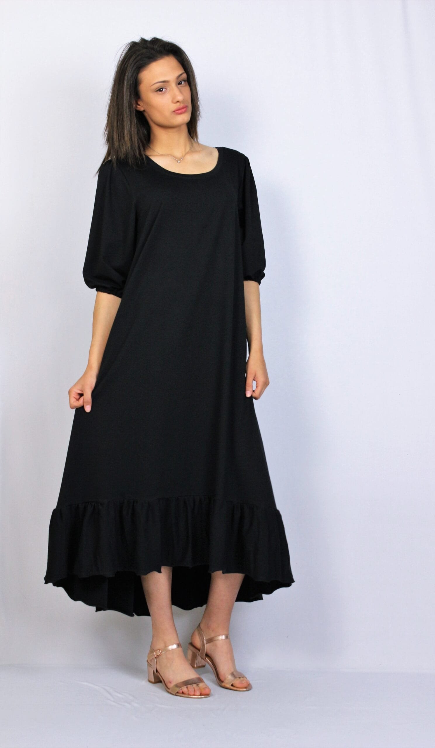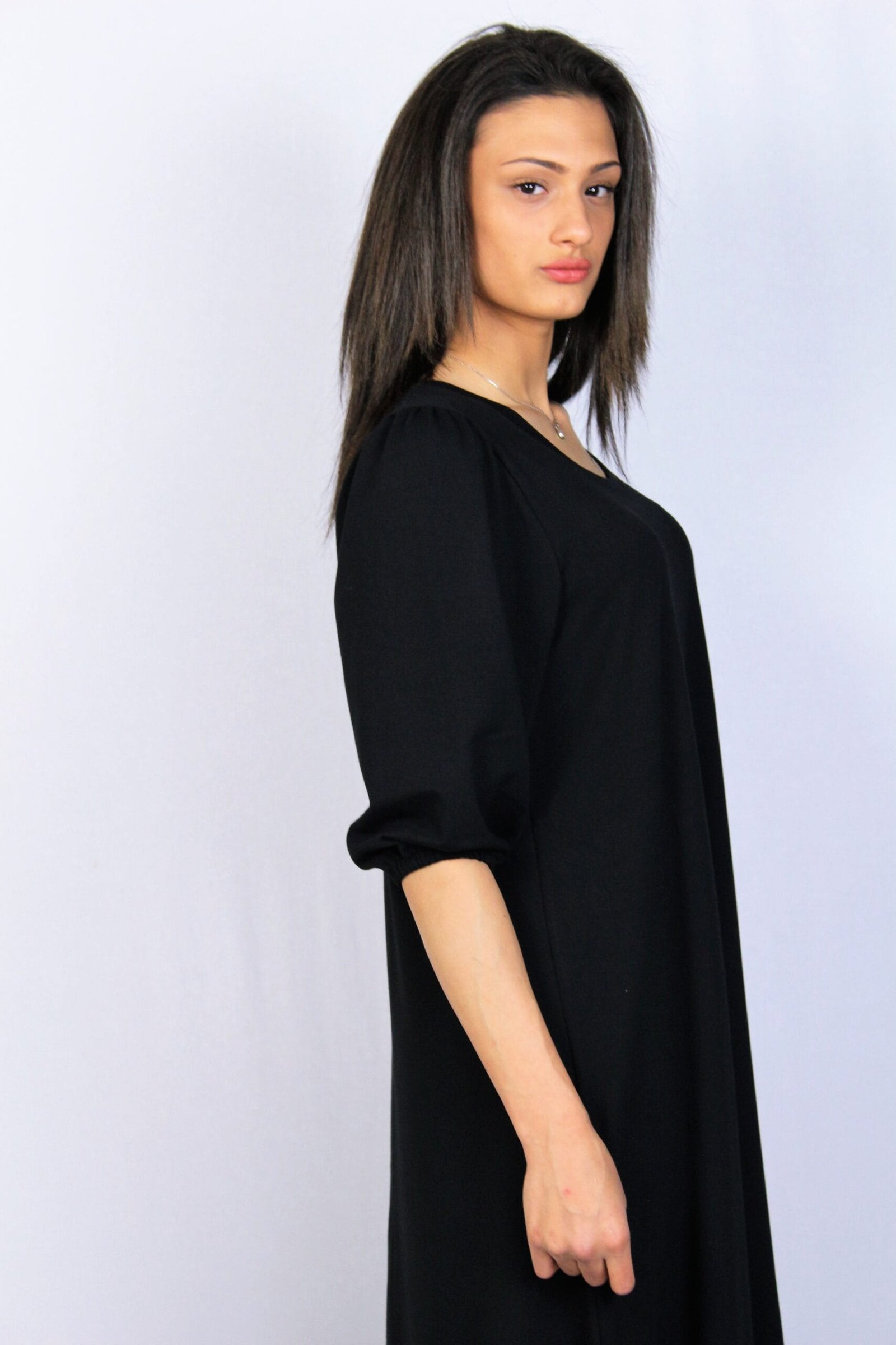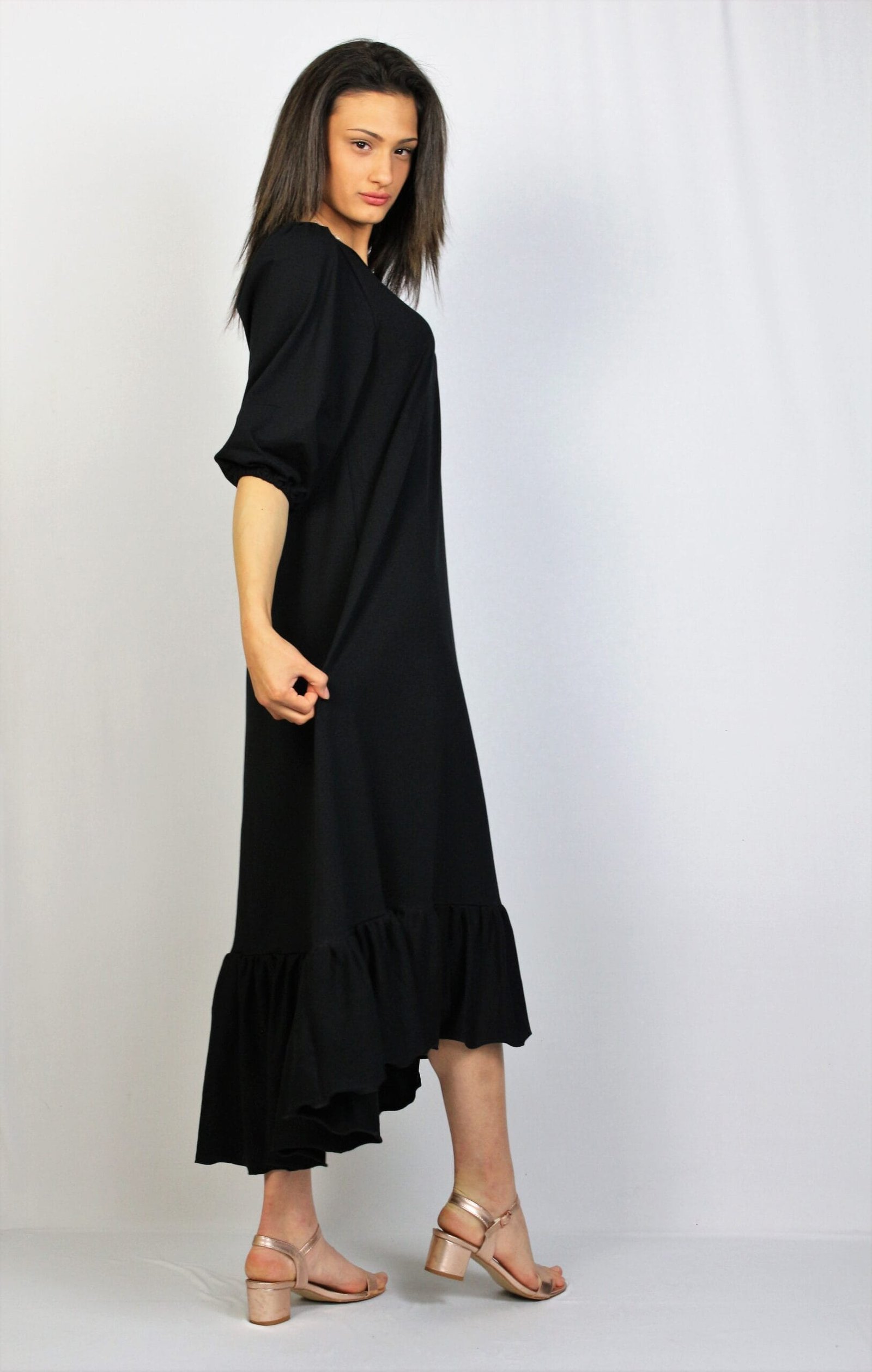Асиметрична свободно падаща рокля с къдра., буфан ръкав ,който завършва с набран ластик за повече удобство.