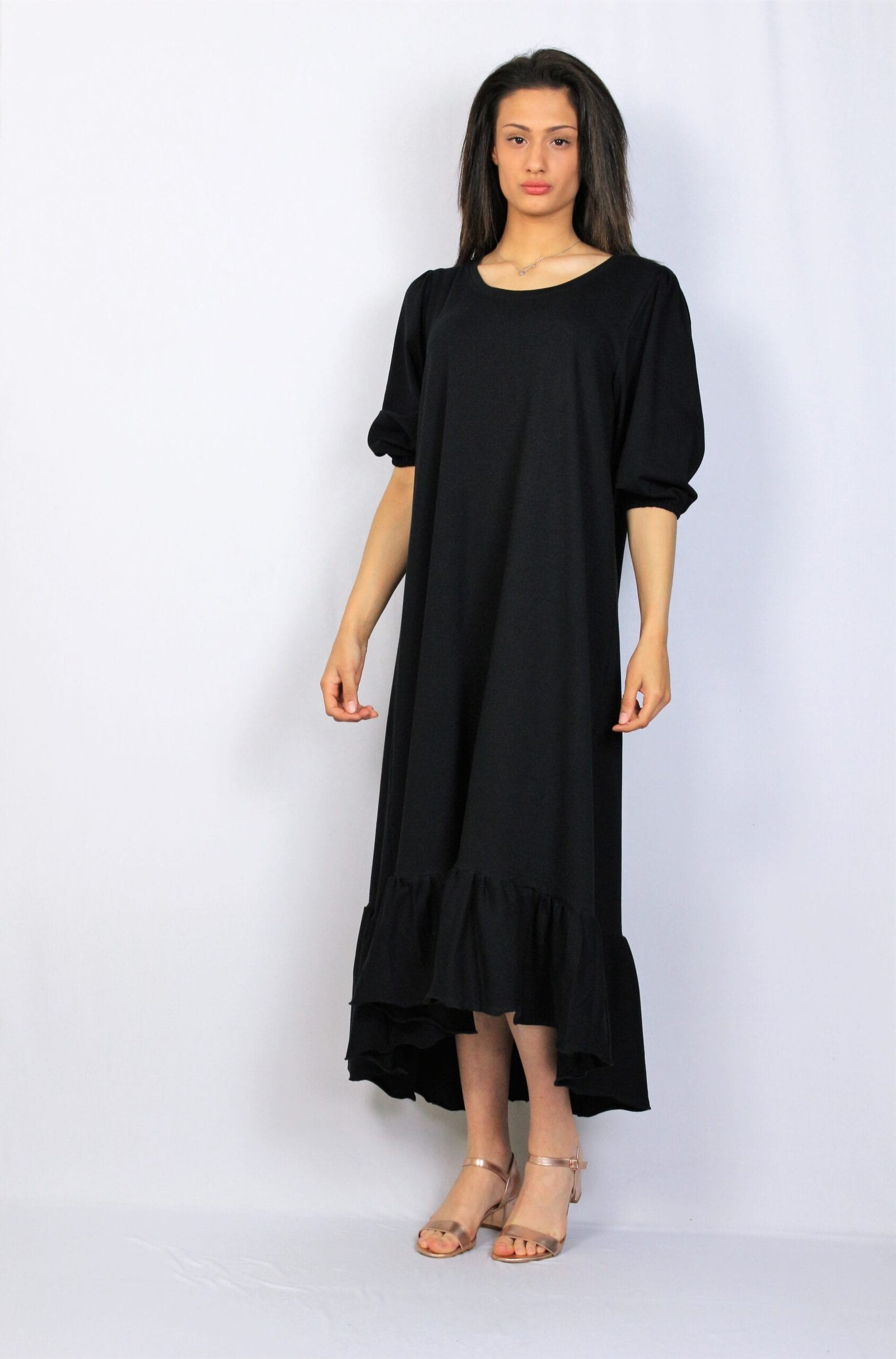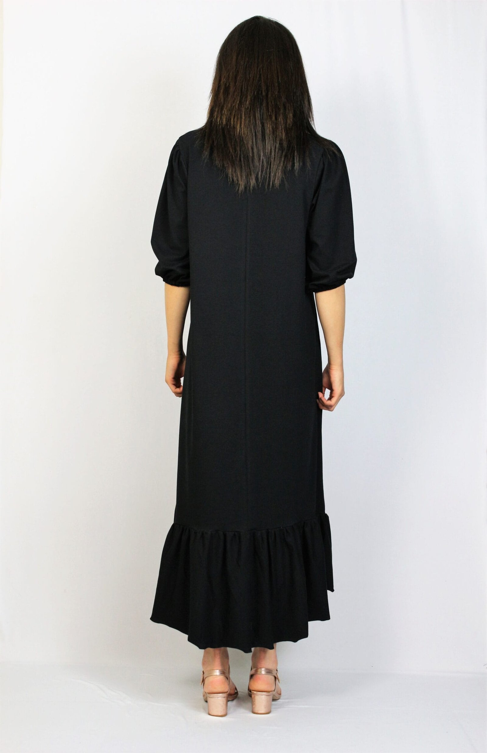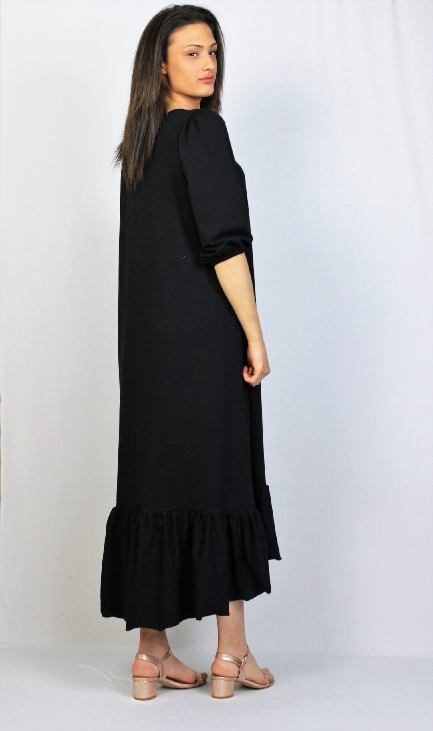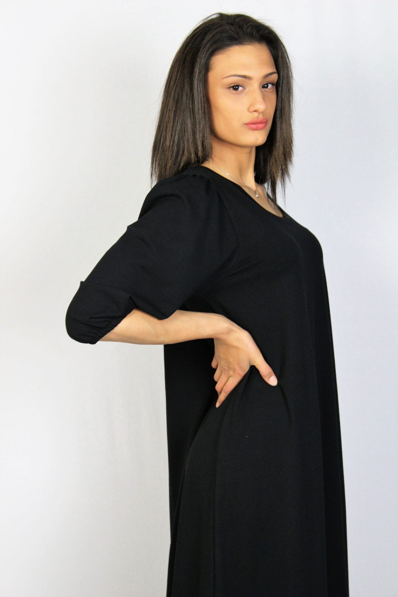 Асиметрична свободно падаща рокля с къдра., буфан ръкав ,който завършва с набран ластик за повече удобство.