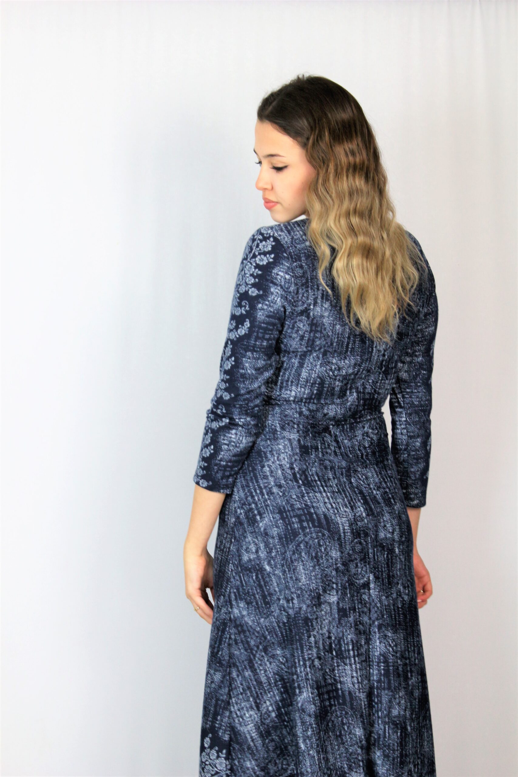 Разкроена рокля с обло деколте изработена от еластичен плат с красив принт.