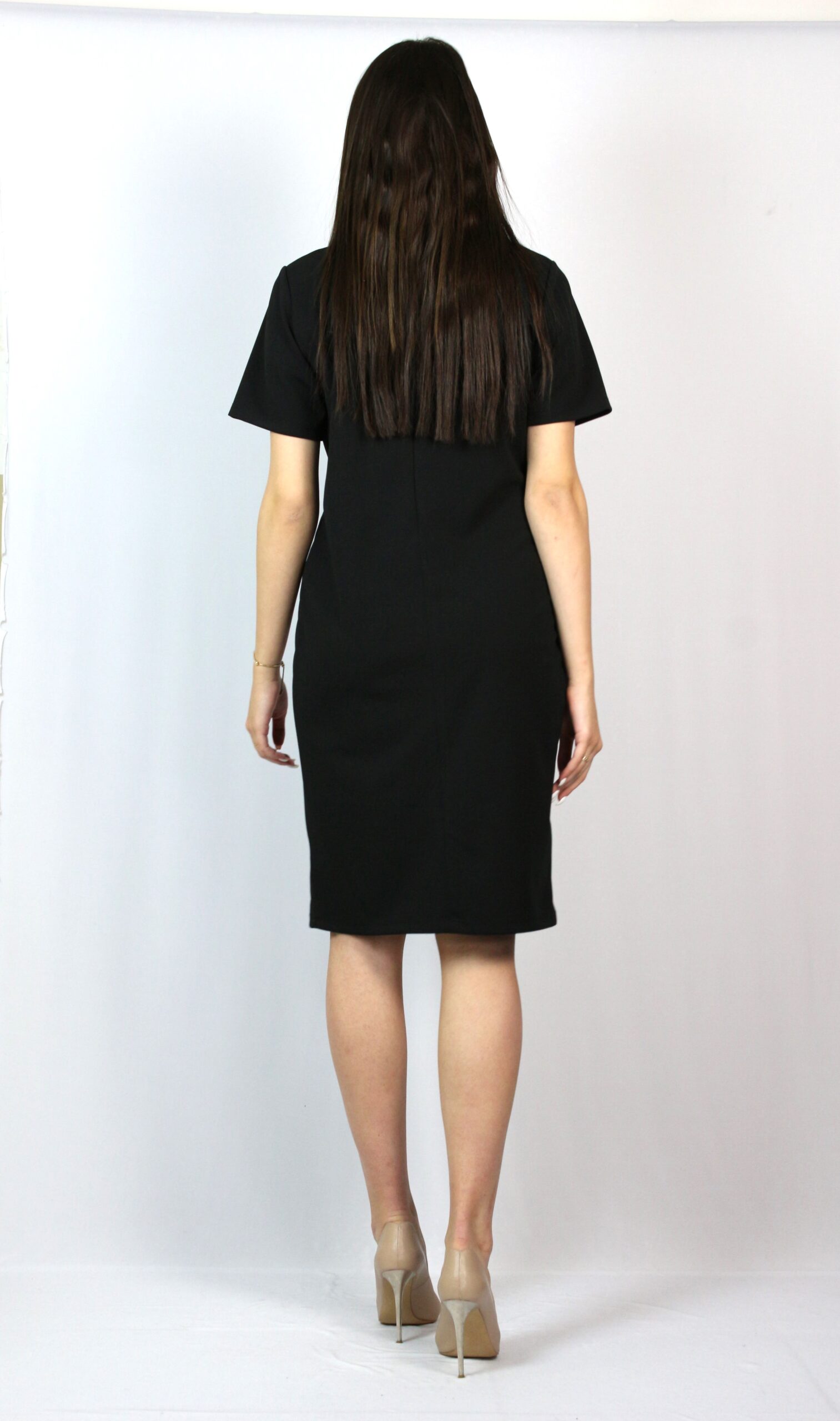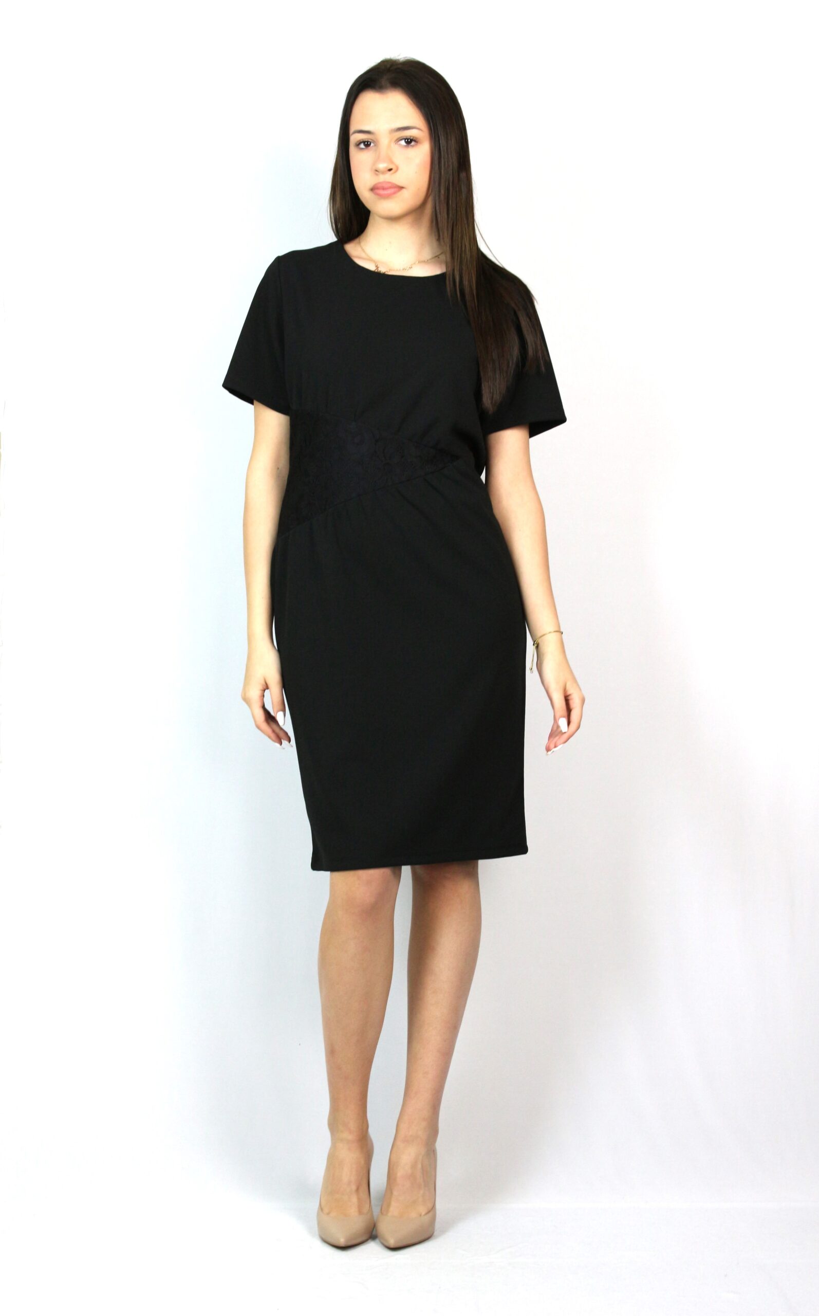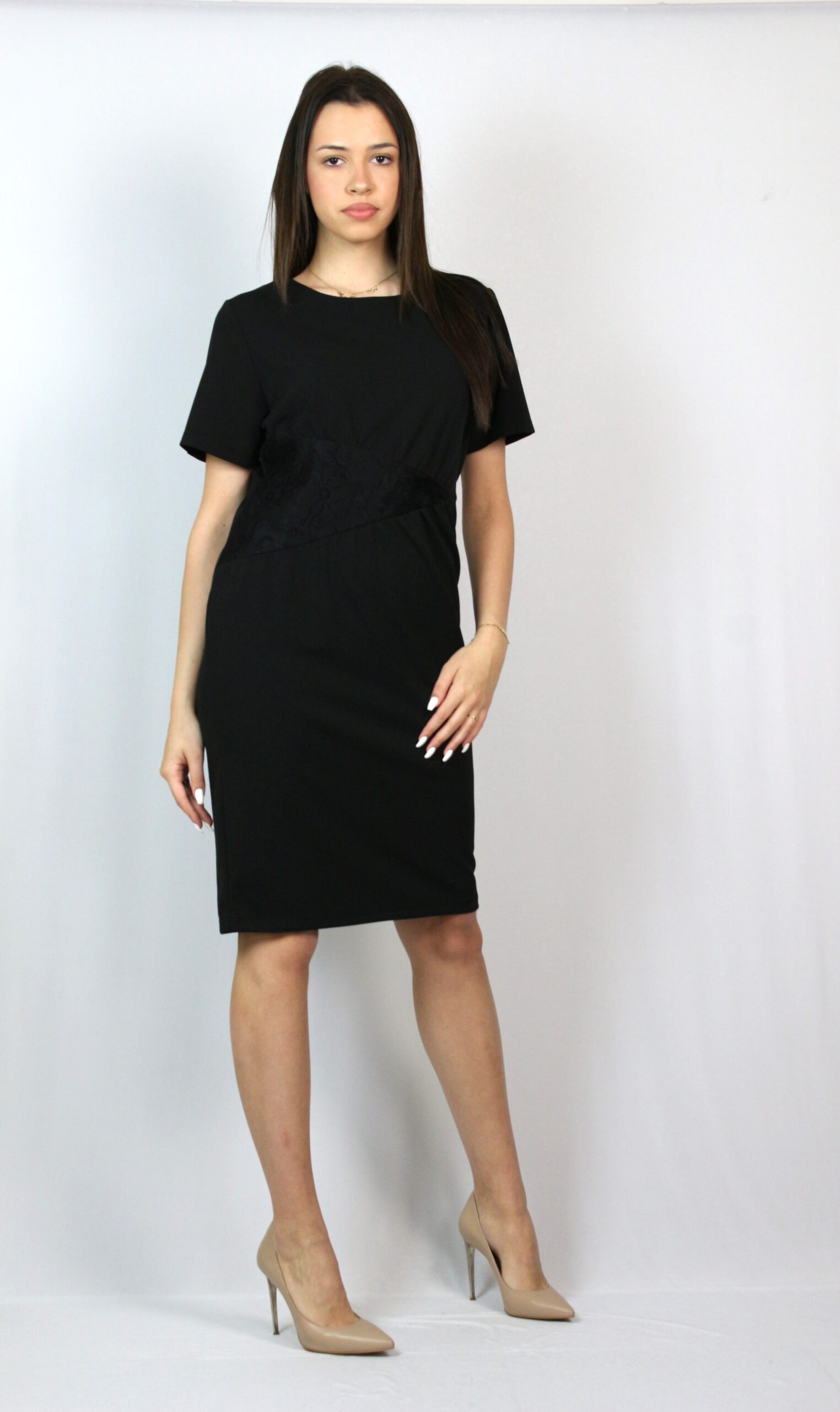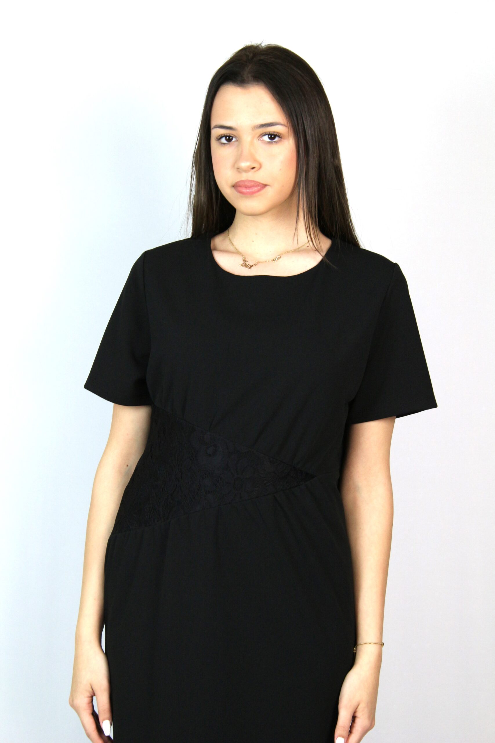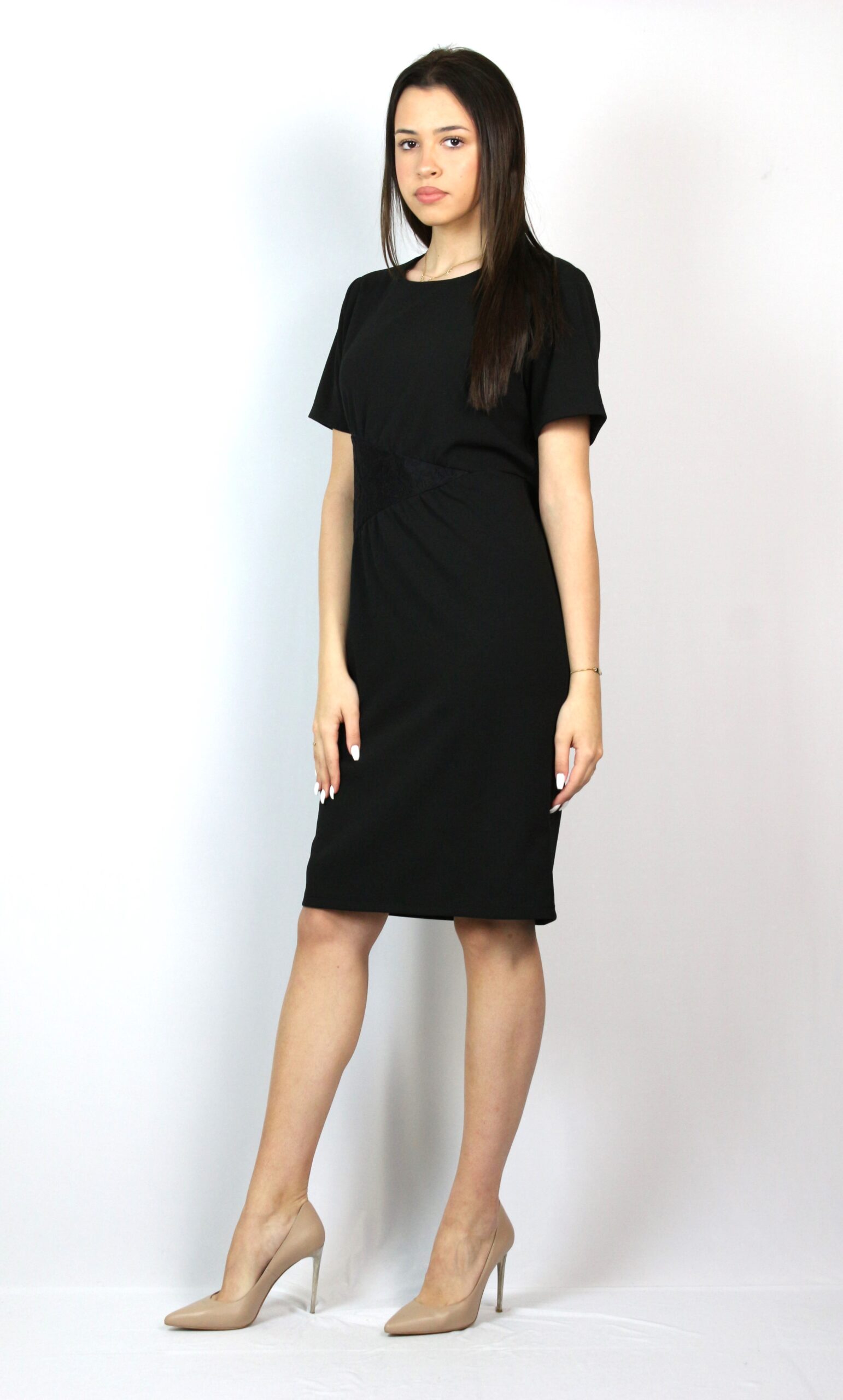 Рокля с обло деколте ,къс ръкав и триъгълник комбиниран с дантела.