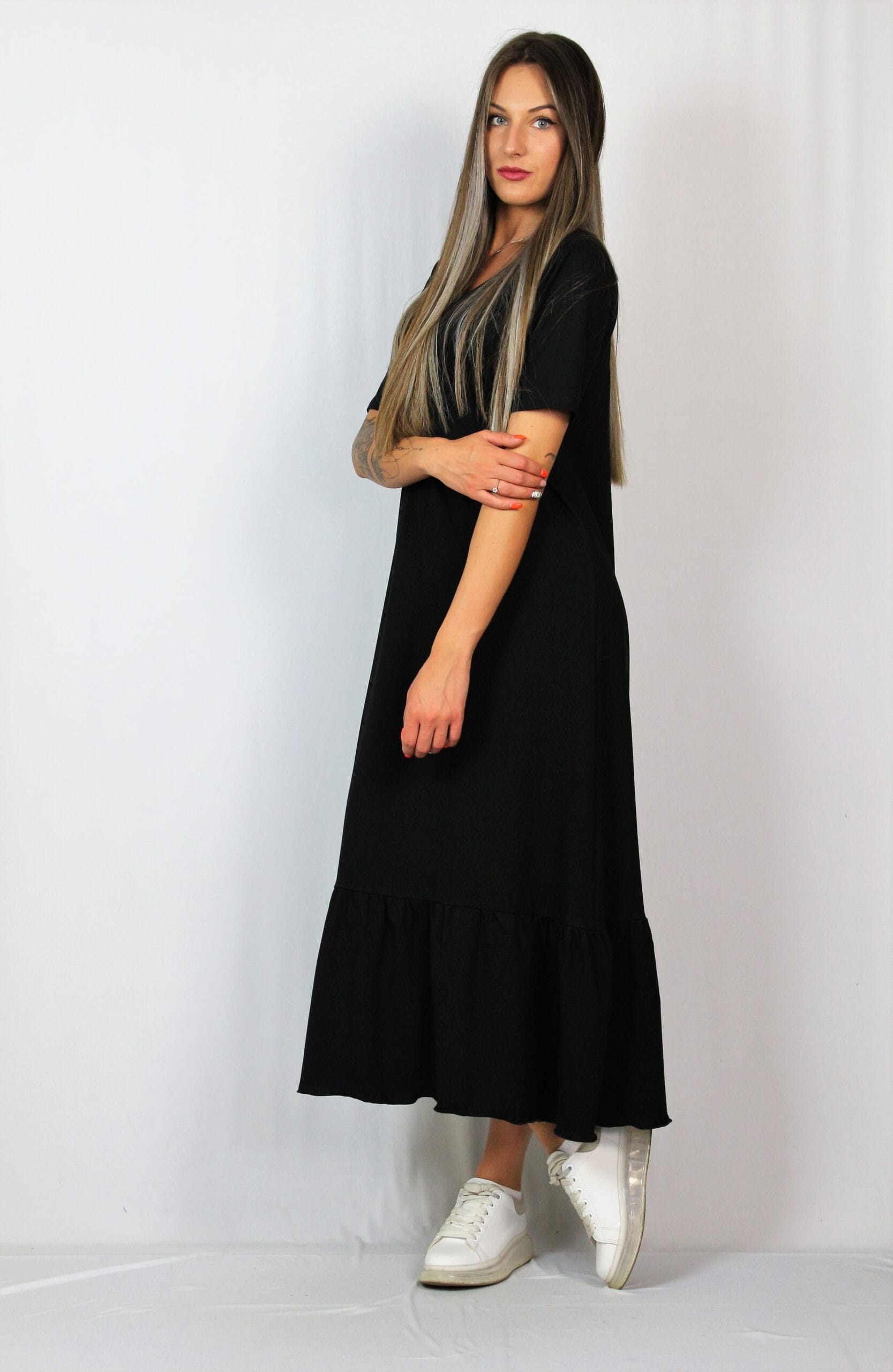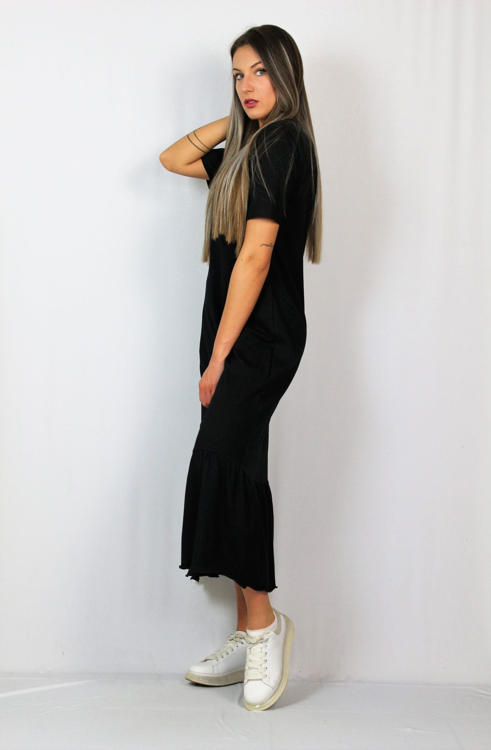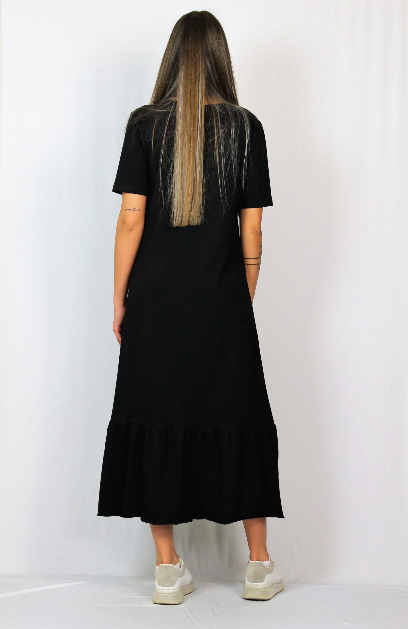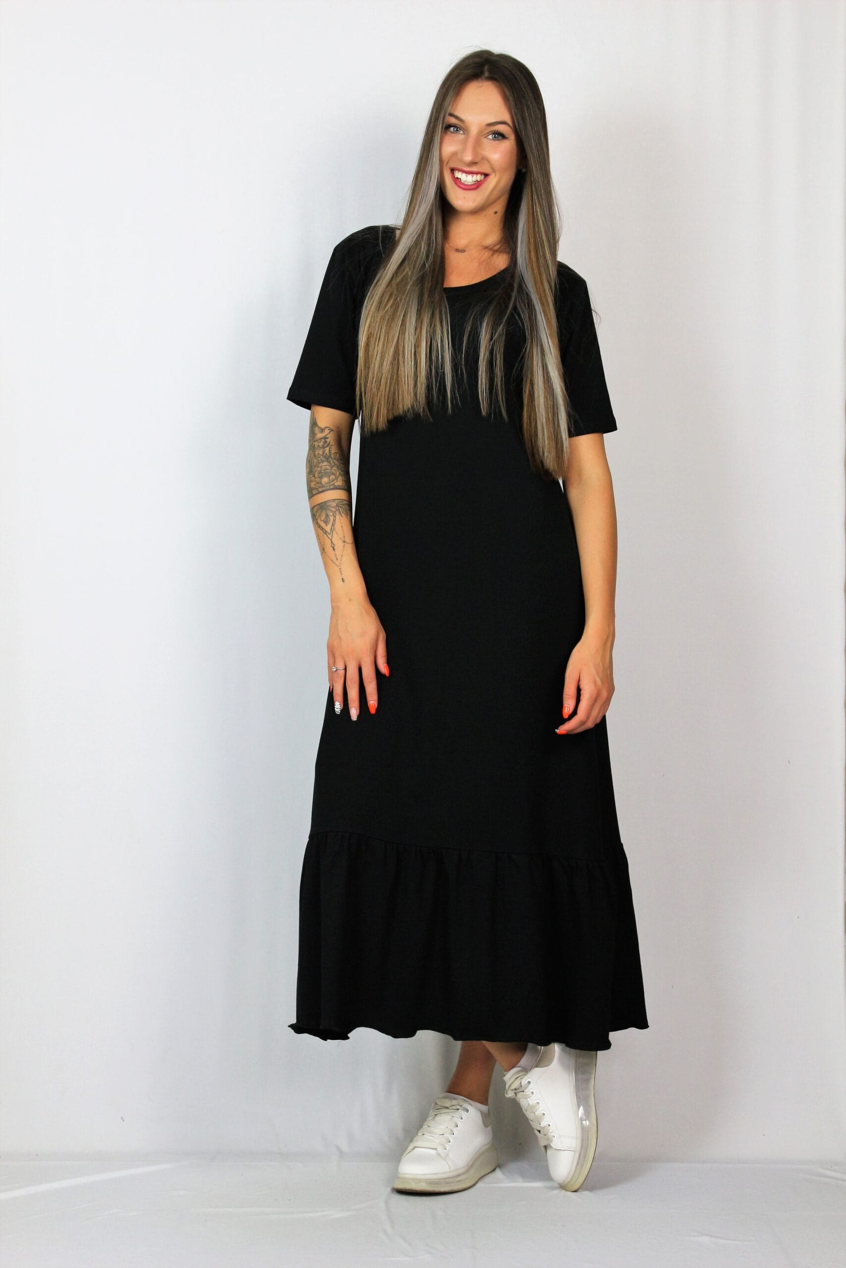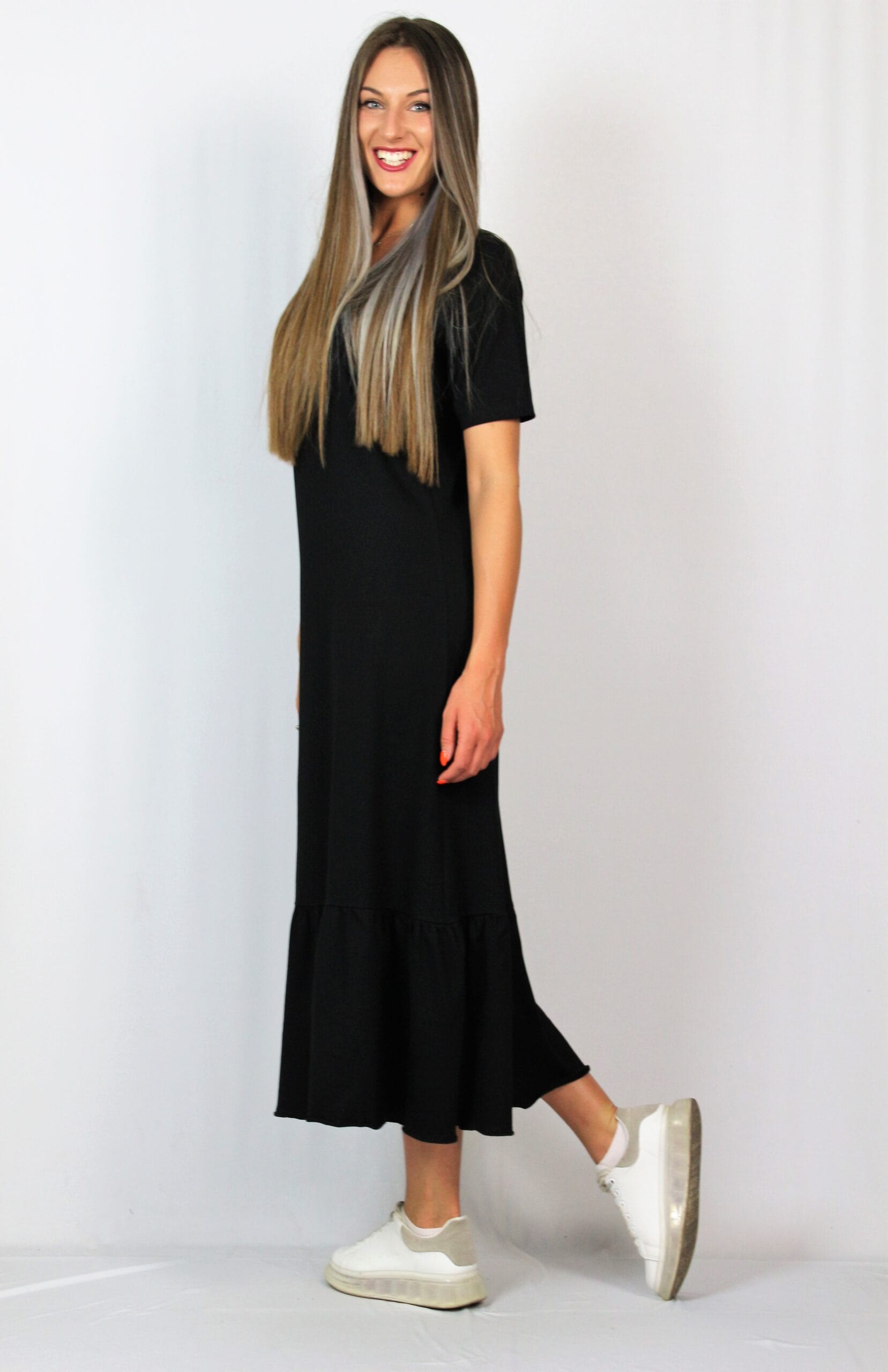 Рокля с къс ръкав и къдра в долната част .Изработена от памучно трико.