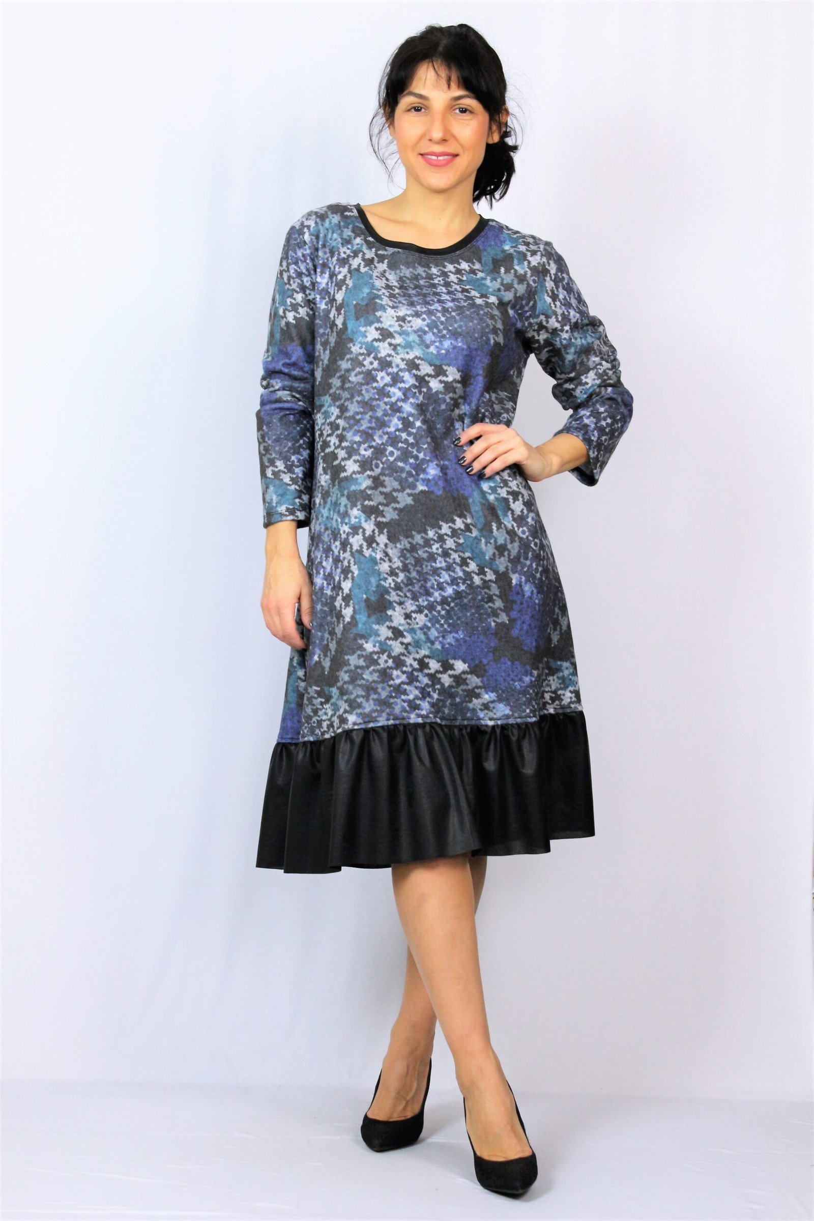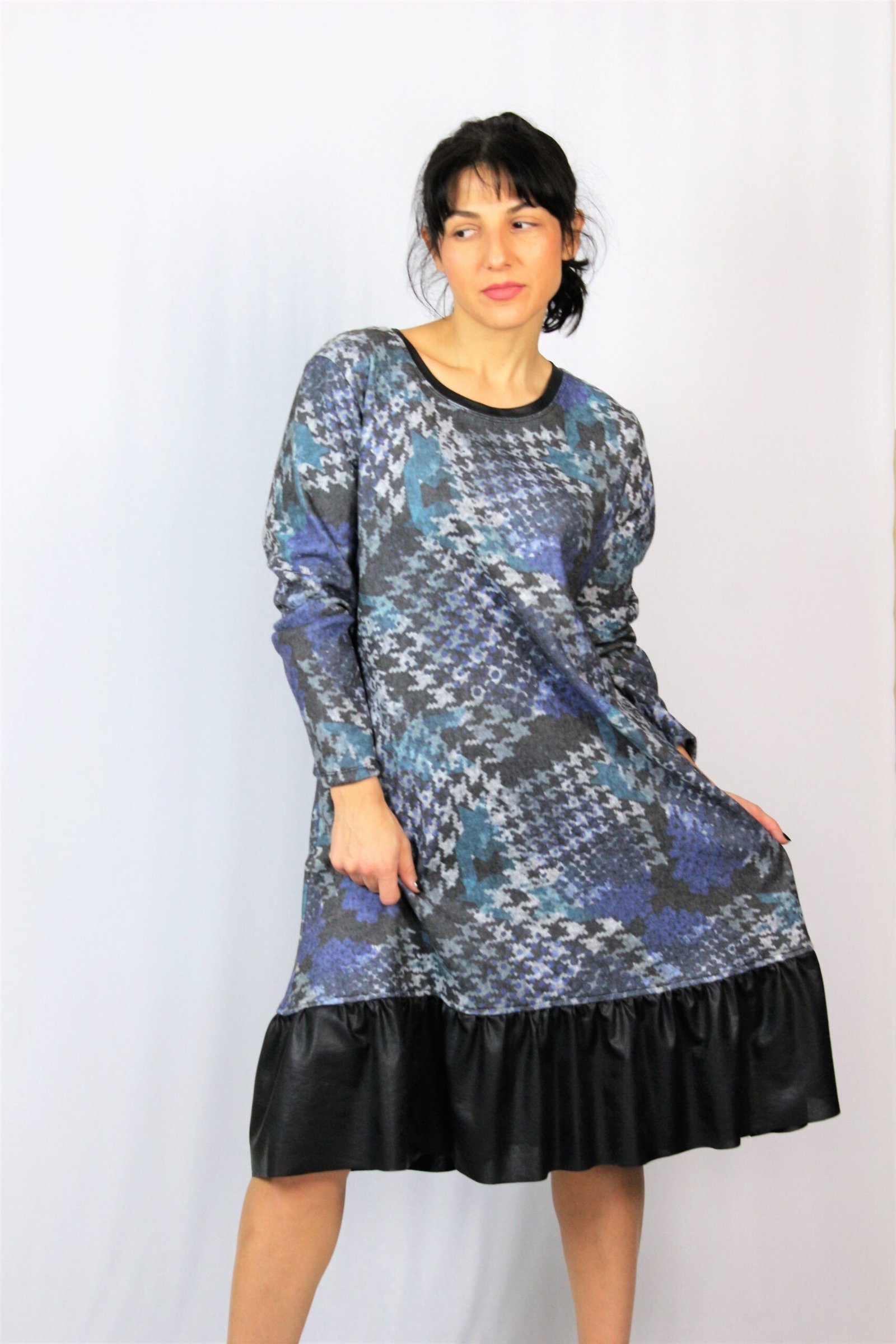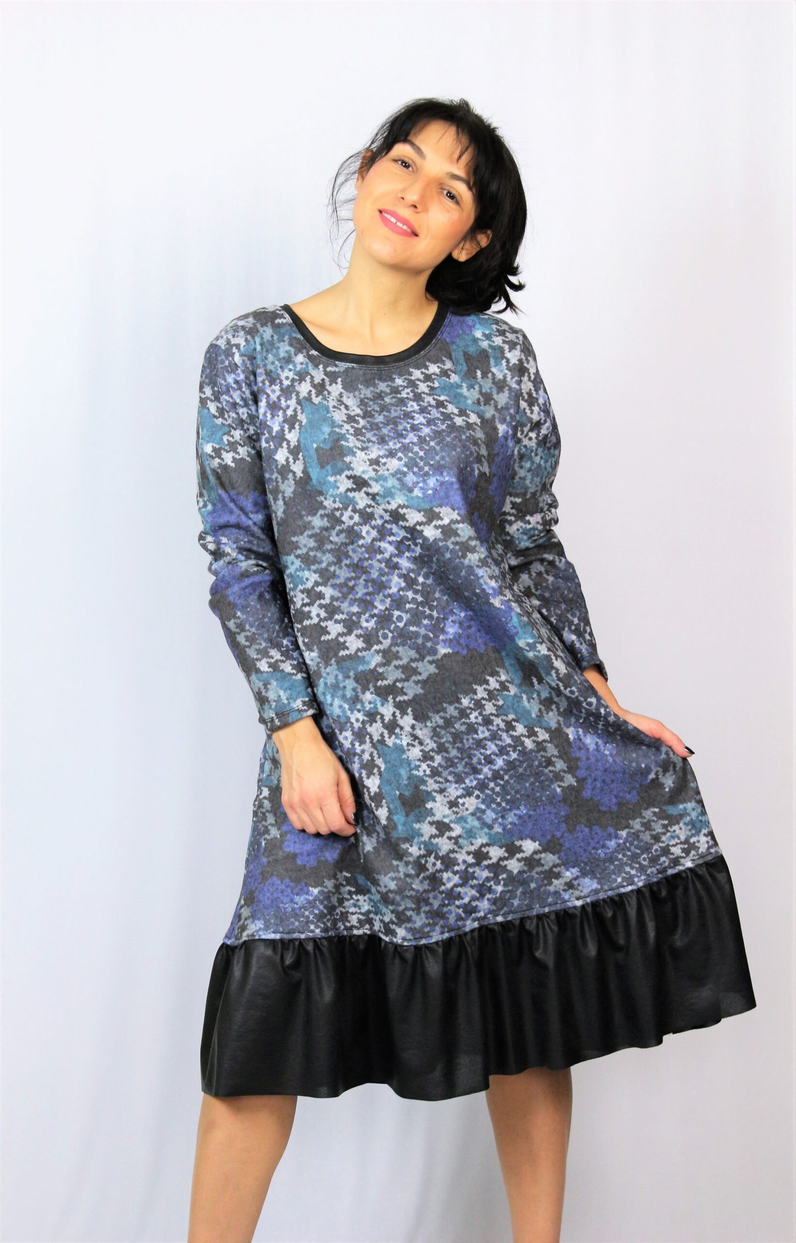 Рокля свободно падаща надолу с къдра от кожа в долната част . Изработена от плътен мек плат.