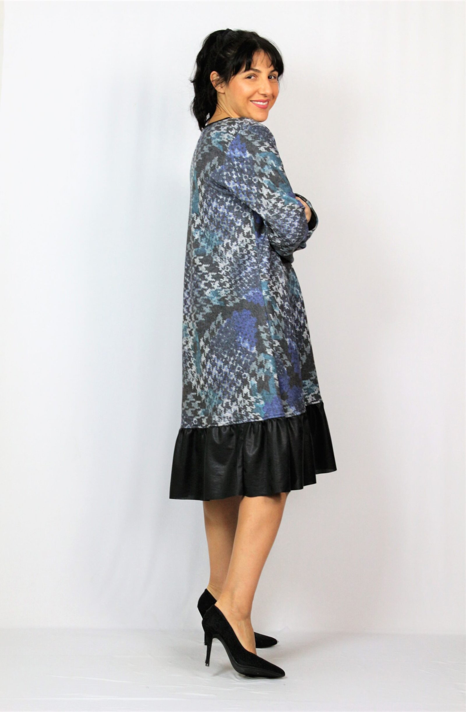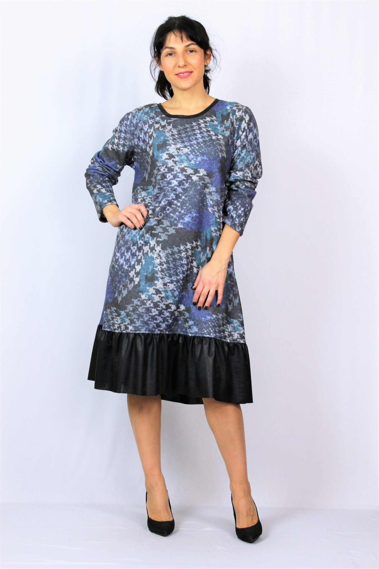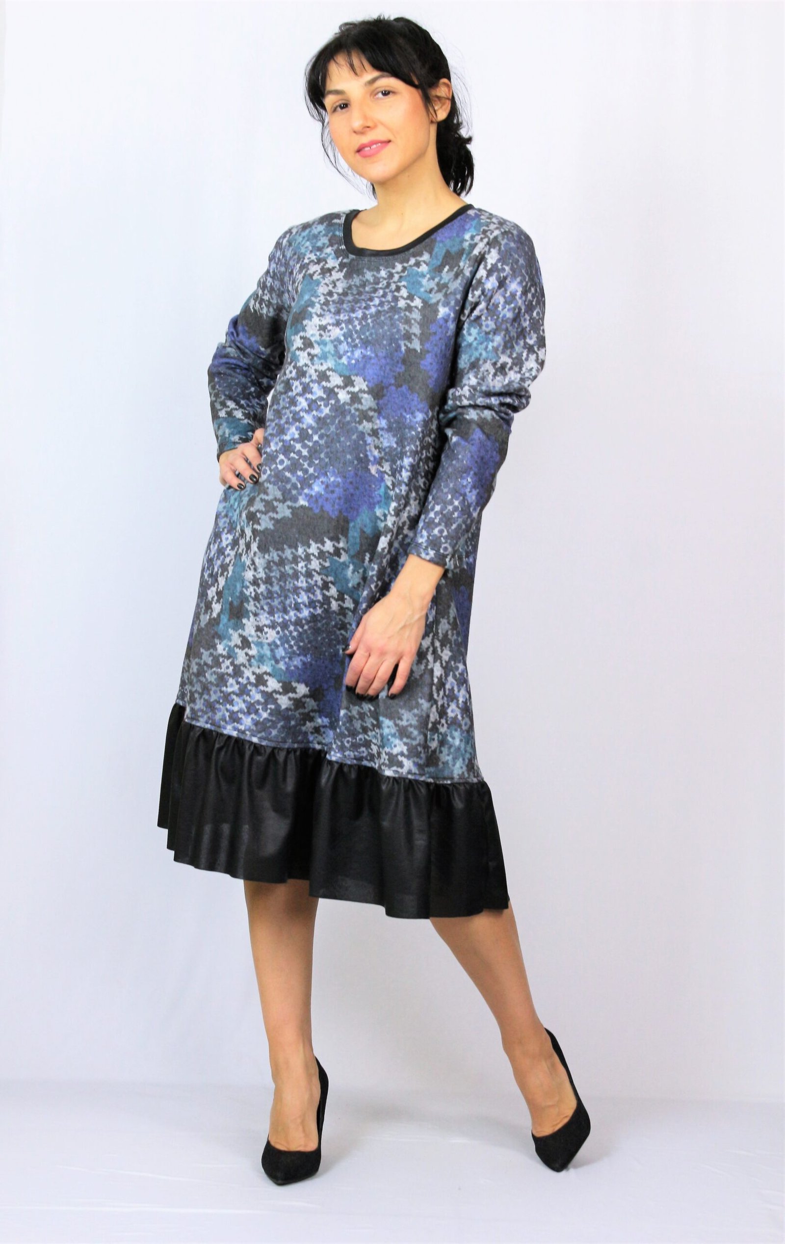 Рокля свободно падаща надолу с къдра от кожа в долната част . Изработена от плътен мек плат.