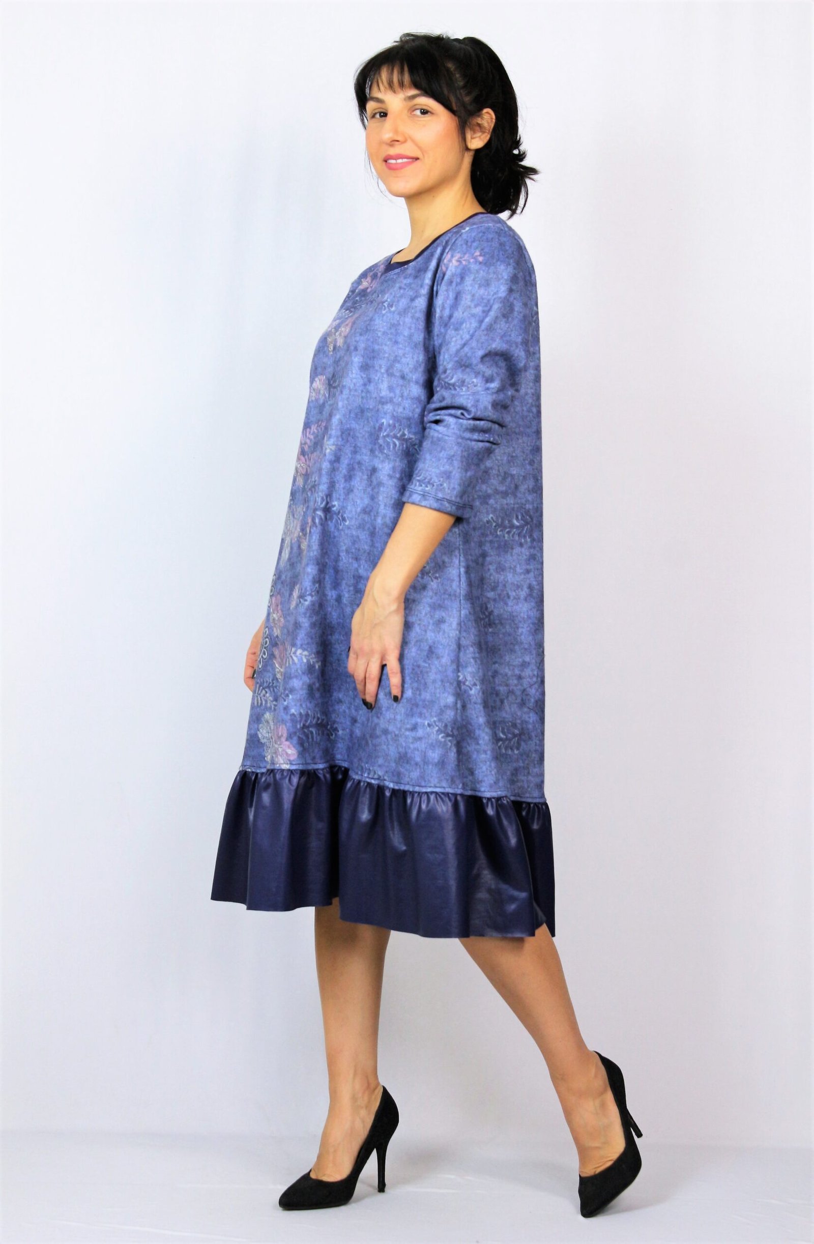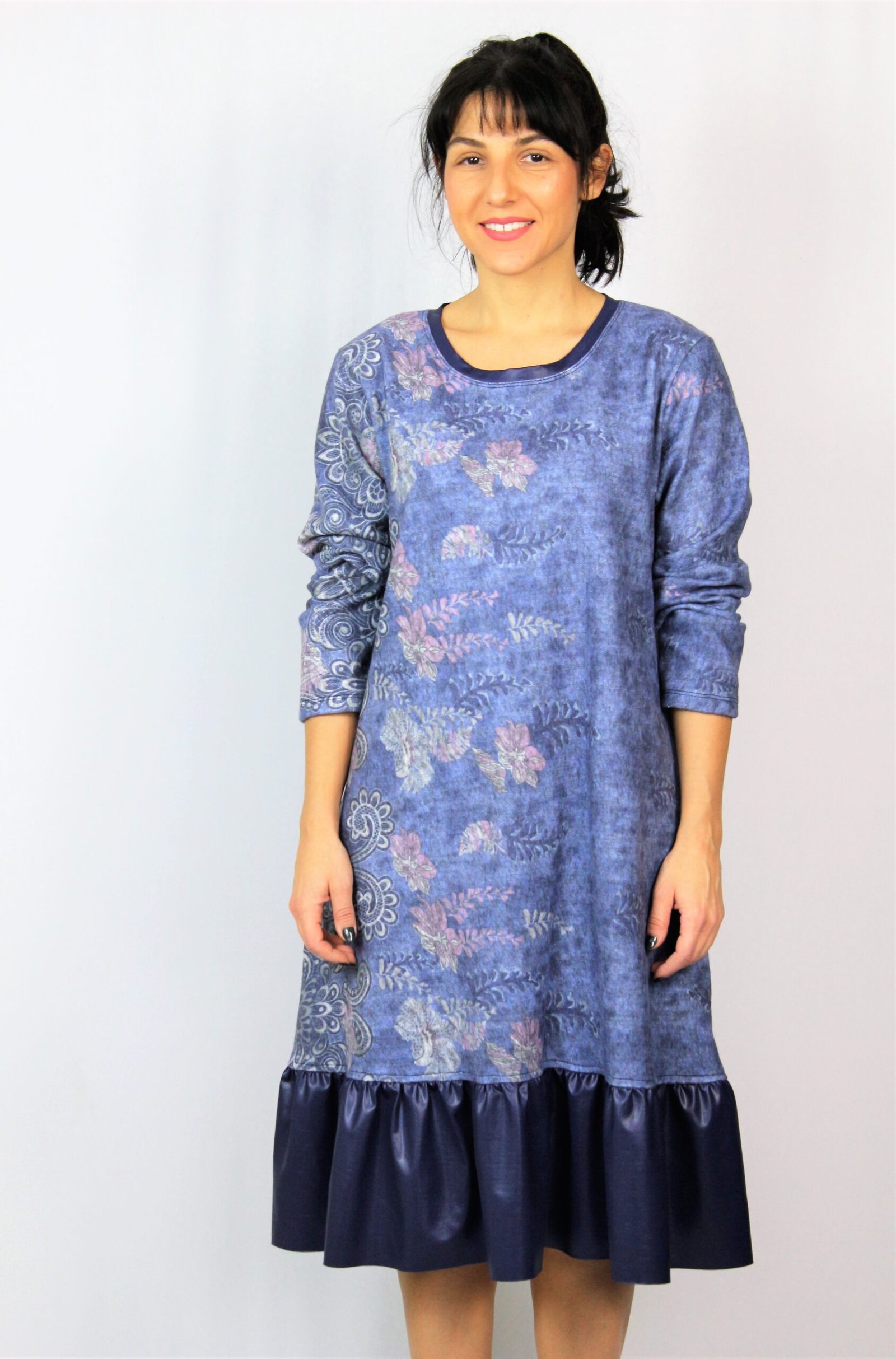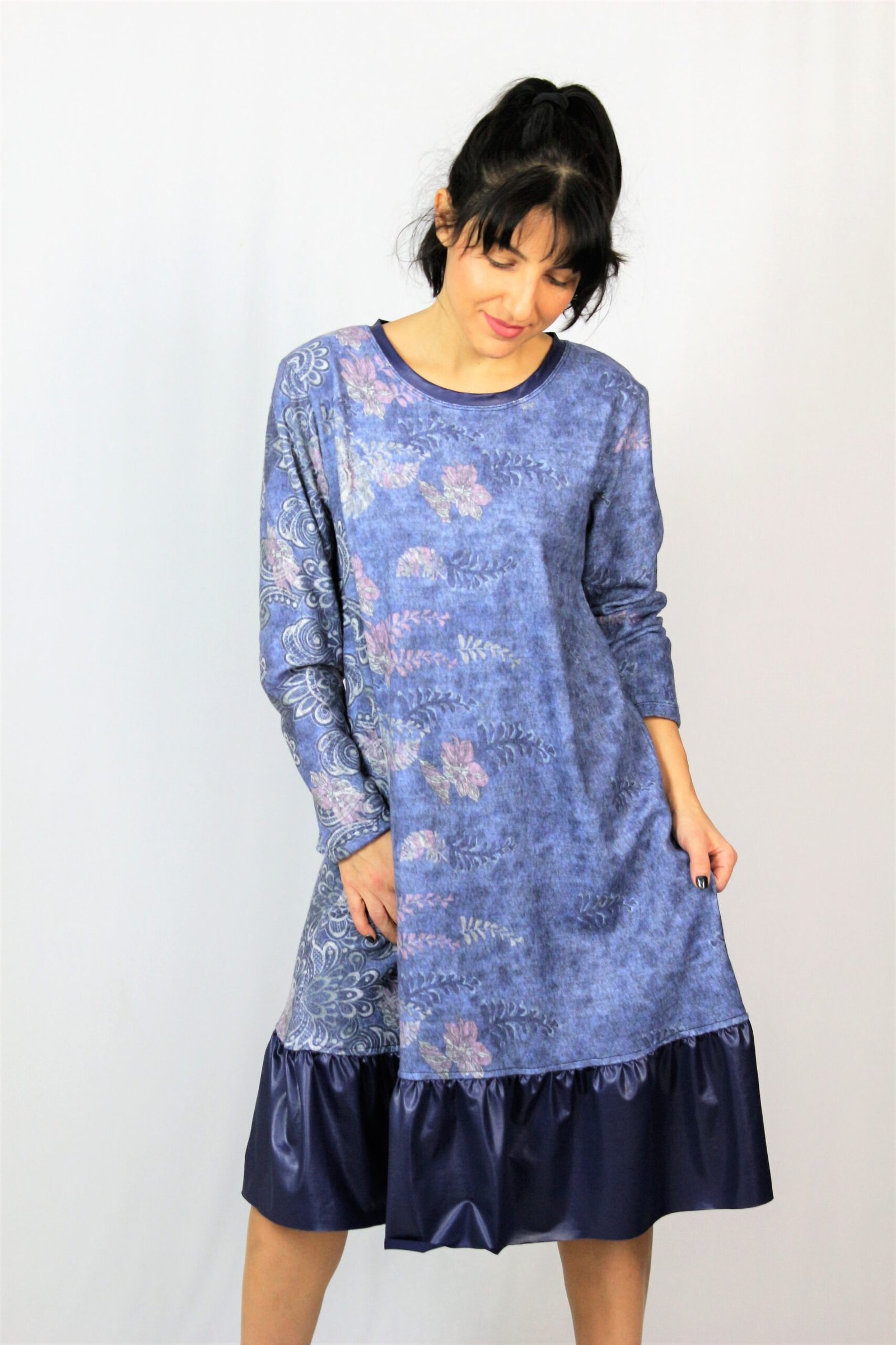 Рокля свободно падаща надолу с къдра от кожа в долната част . Изработена от плътен мек плат.