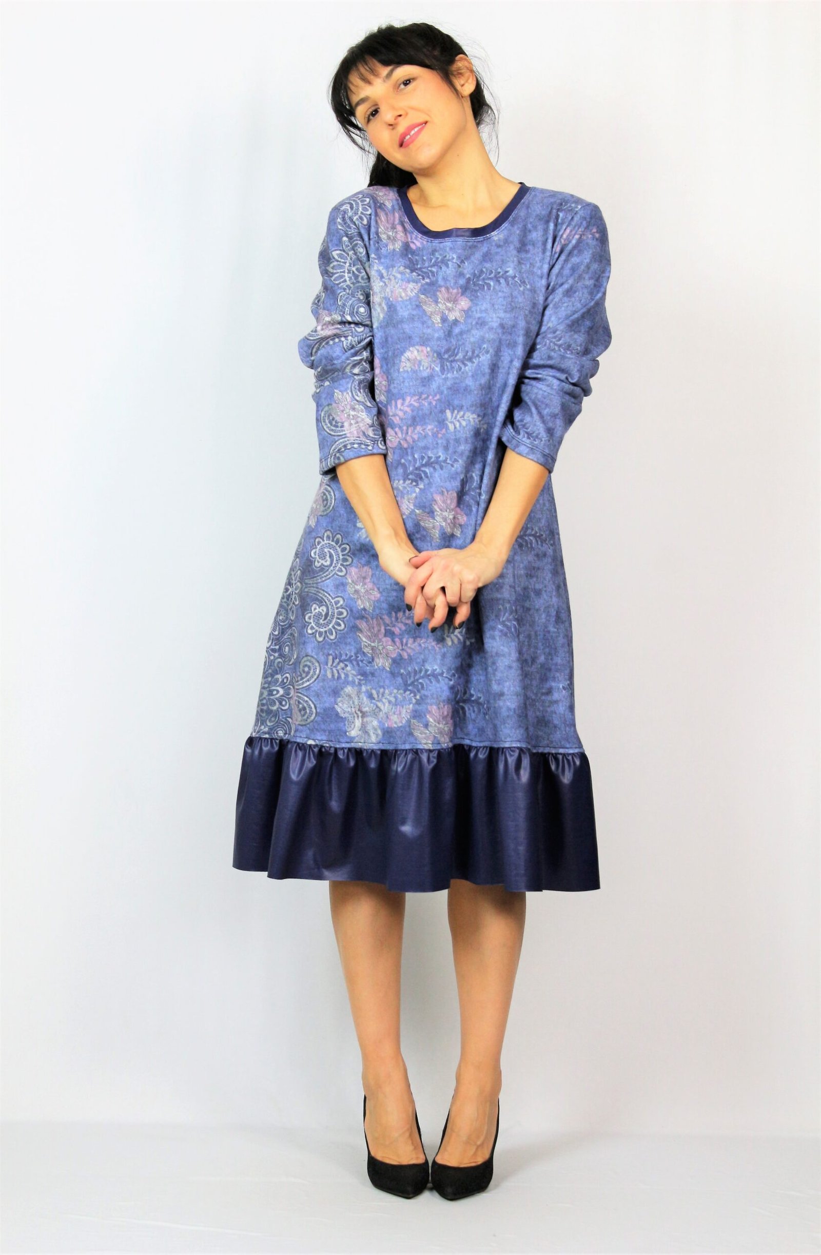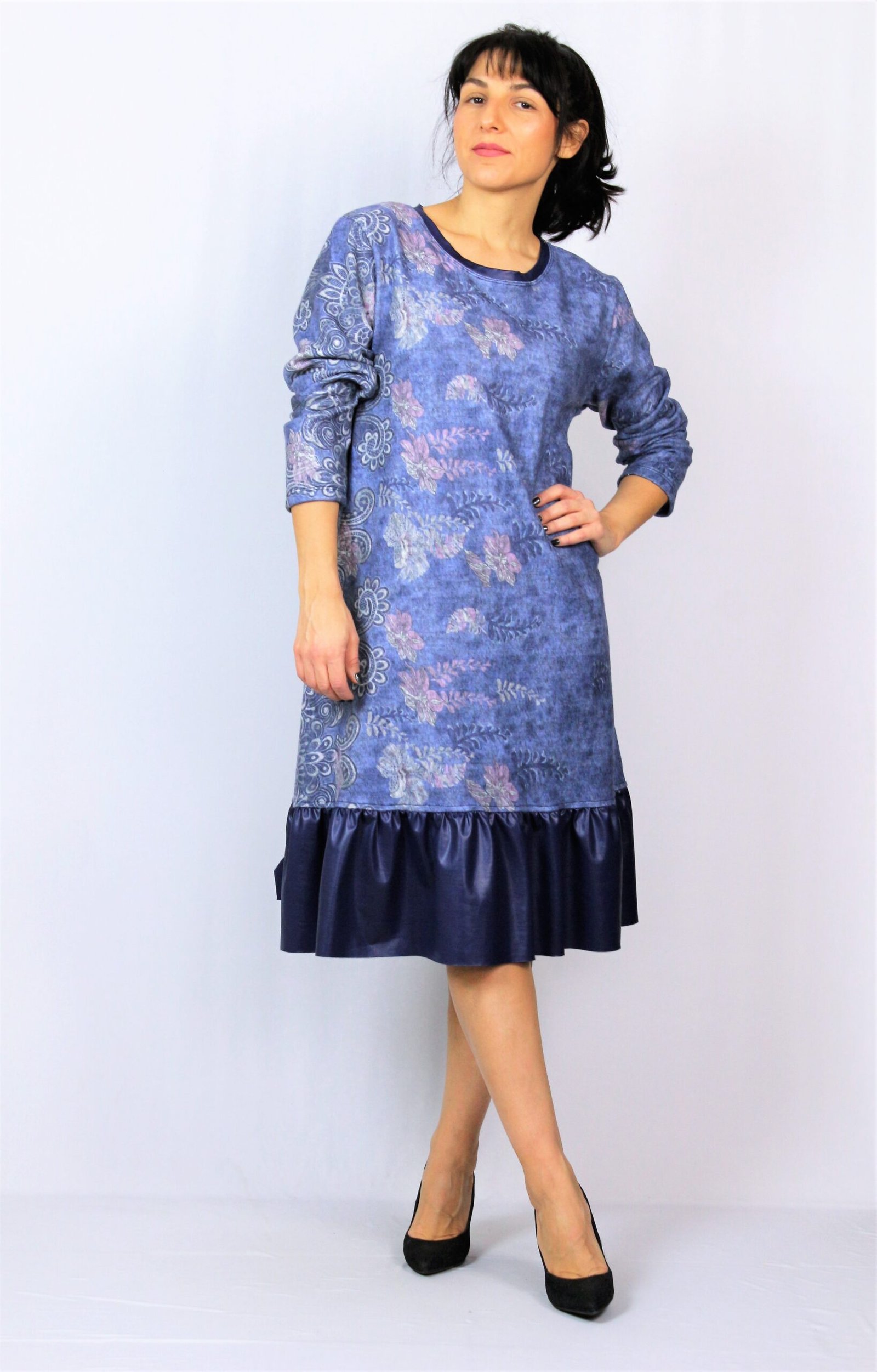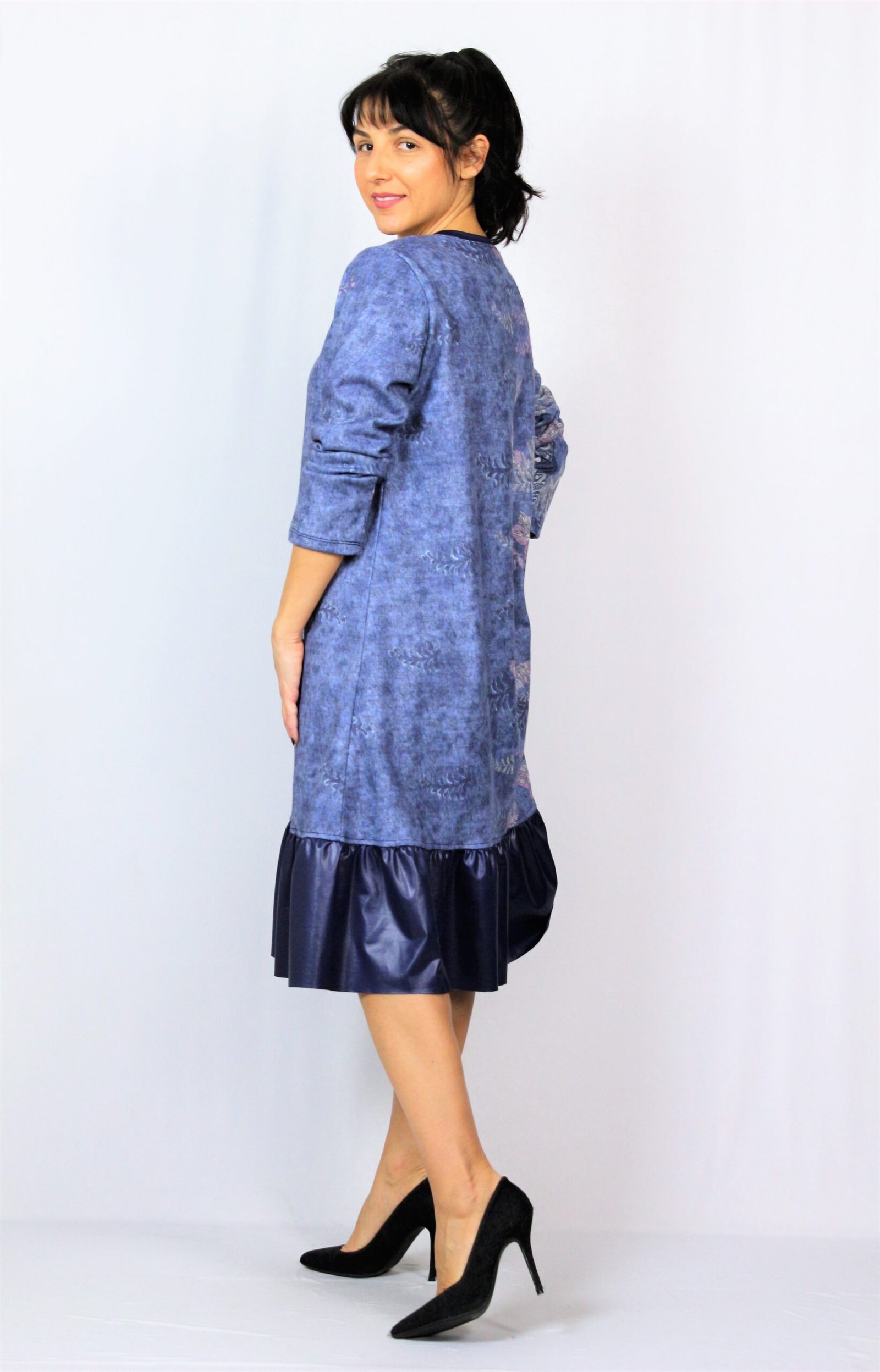 Рокля свободно падаща надолу с къдра от кожа в долната част . Изработена от плътен мек плат.