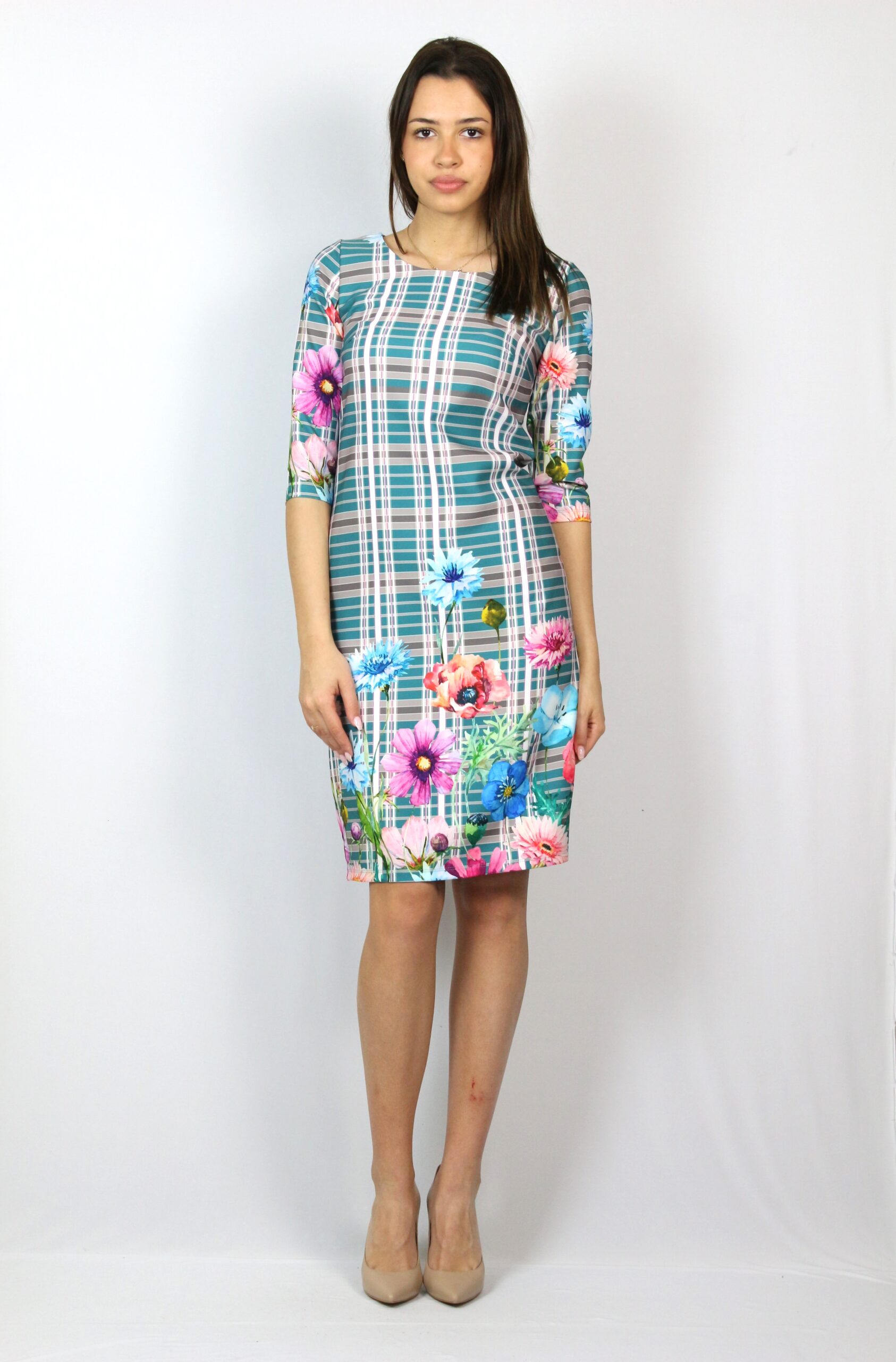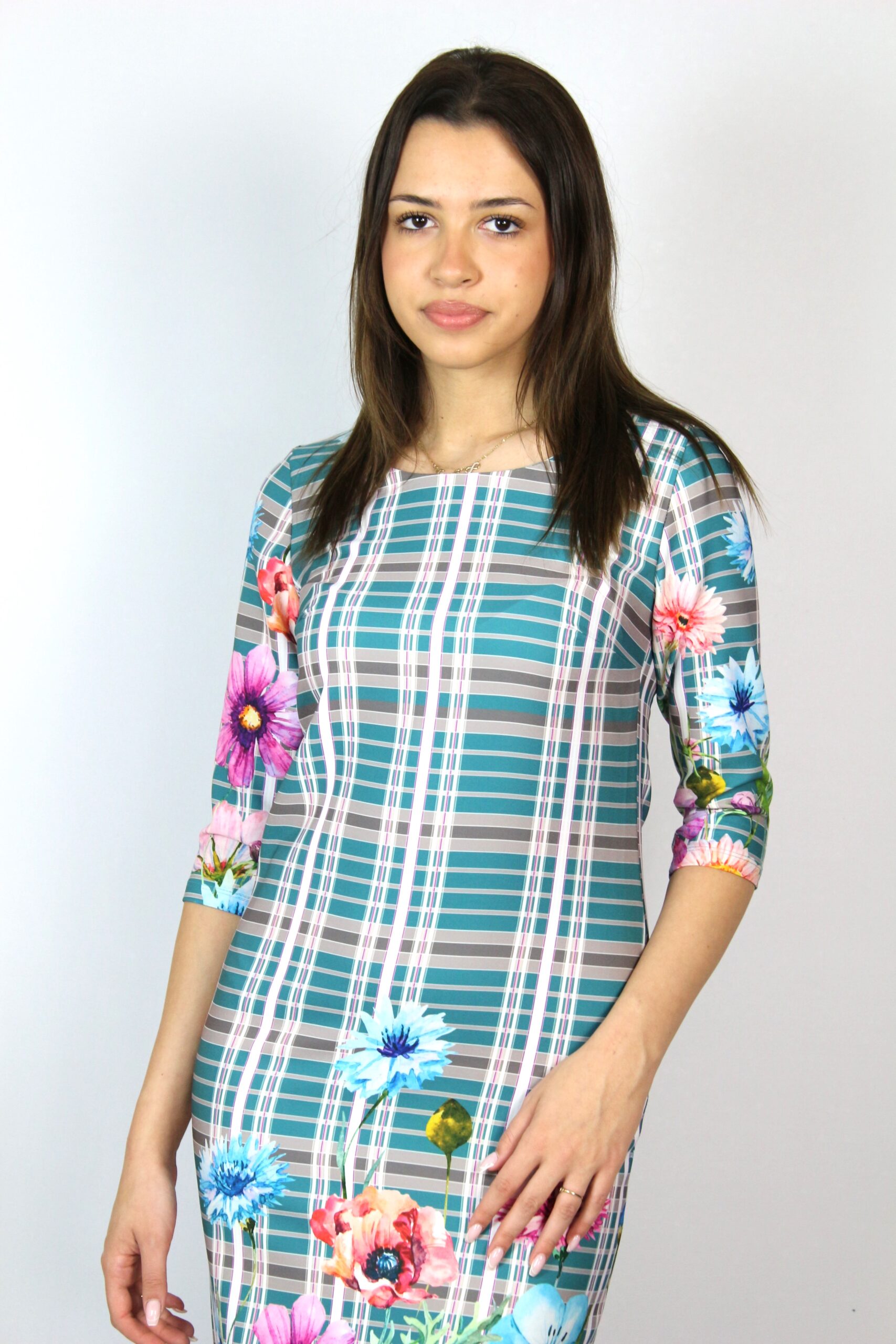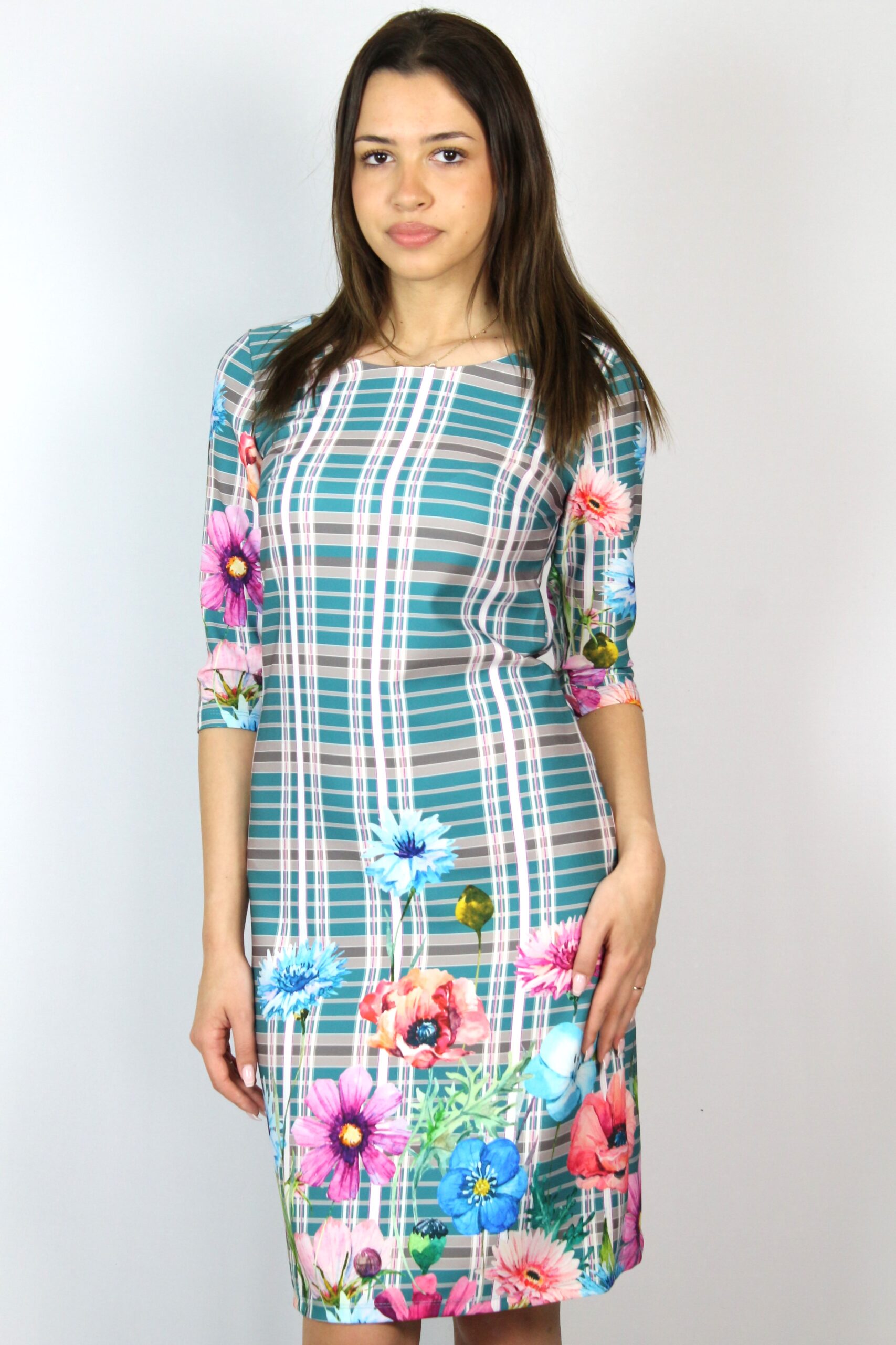 Рокля леко свободна кройка с три четвърт ръкав и обло декоте изработена от висококачествен плат дабъл фейс с малка еластичност ,мек и удобен за тялото.