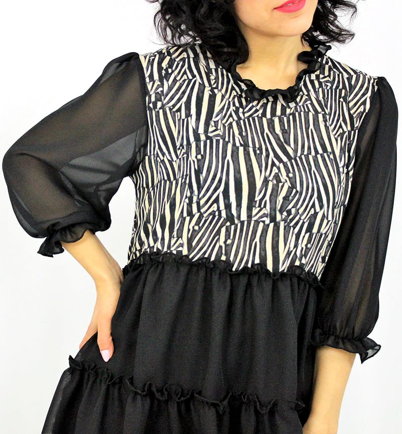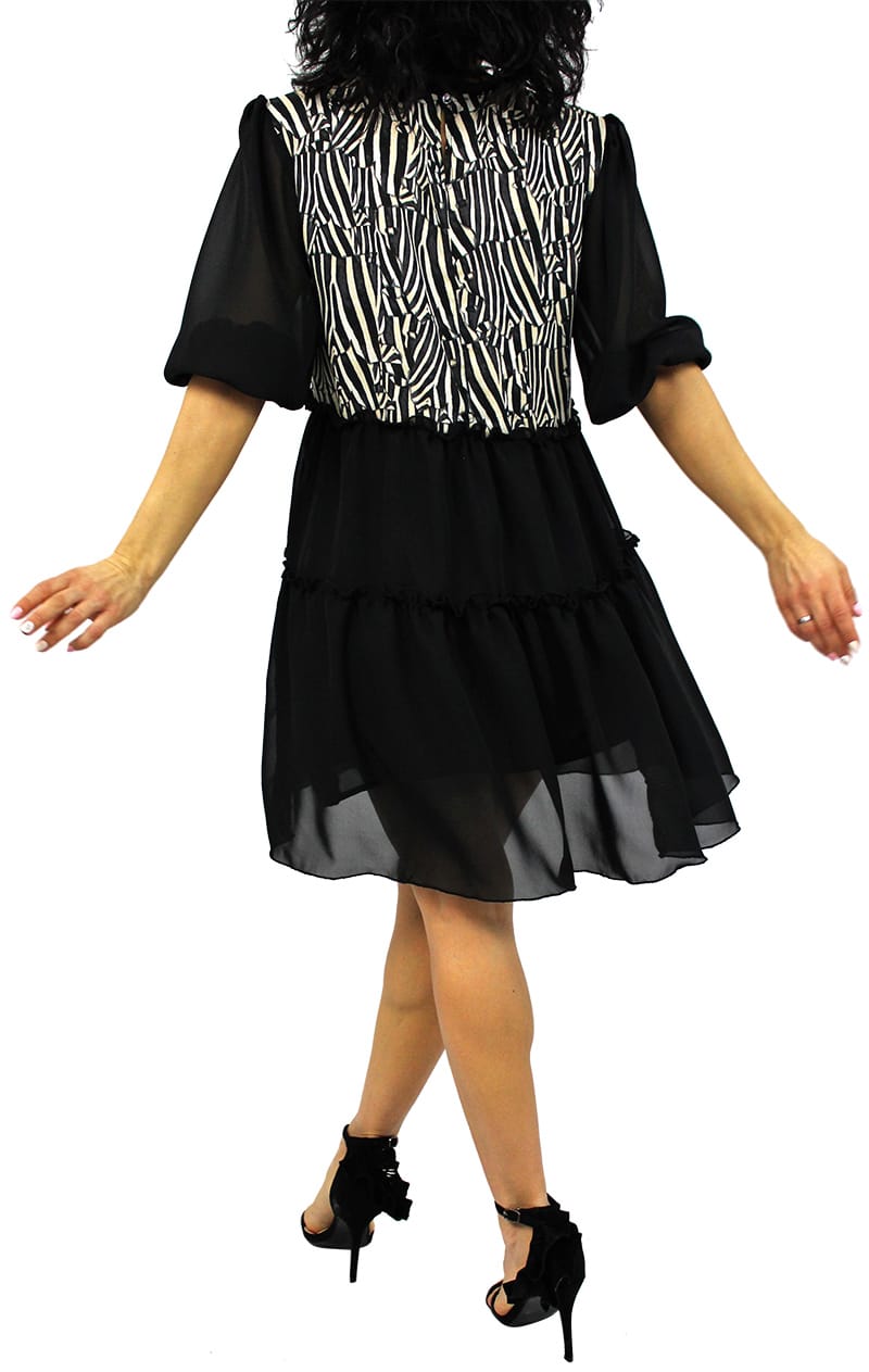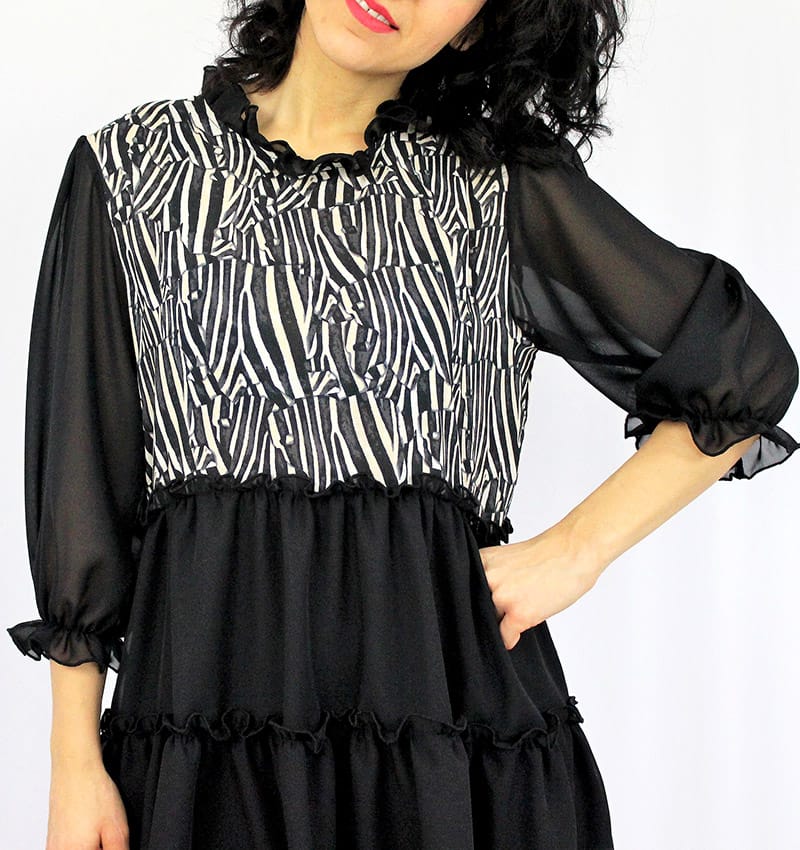 Туника свободно падаща надолу ,която може да се носи и като рокля с два волана и широк ръкав с ластик .Ръкава става и къс .Изработена е от вискоза и шифон ,от долу има подплата.