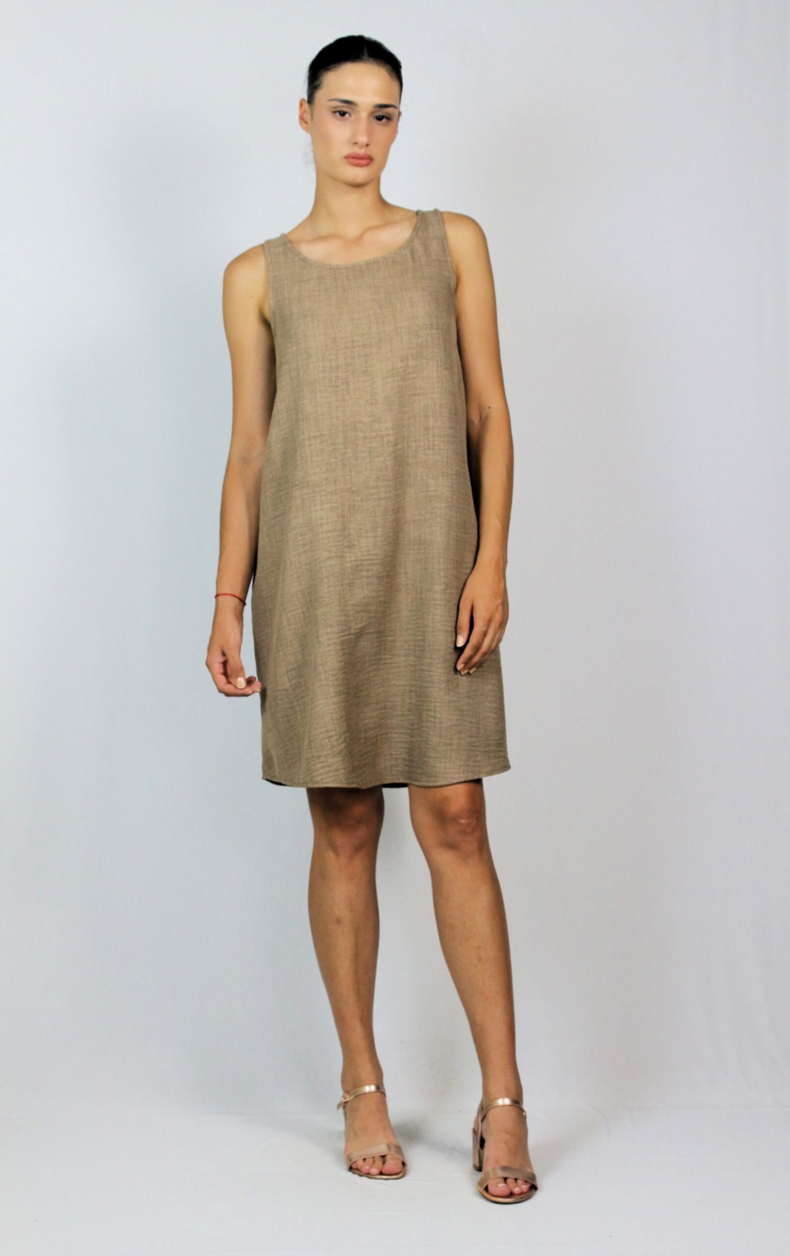 Рокля без ръкави с обло деколте. Разкроена долна част, лека тъкан и закопчаване с копче на гърба.