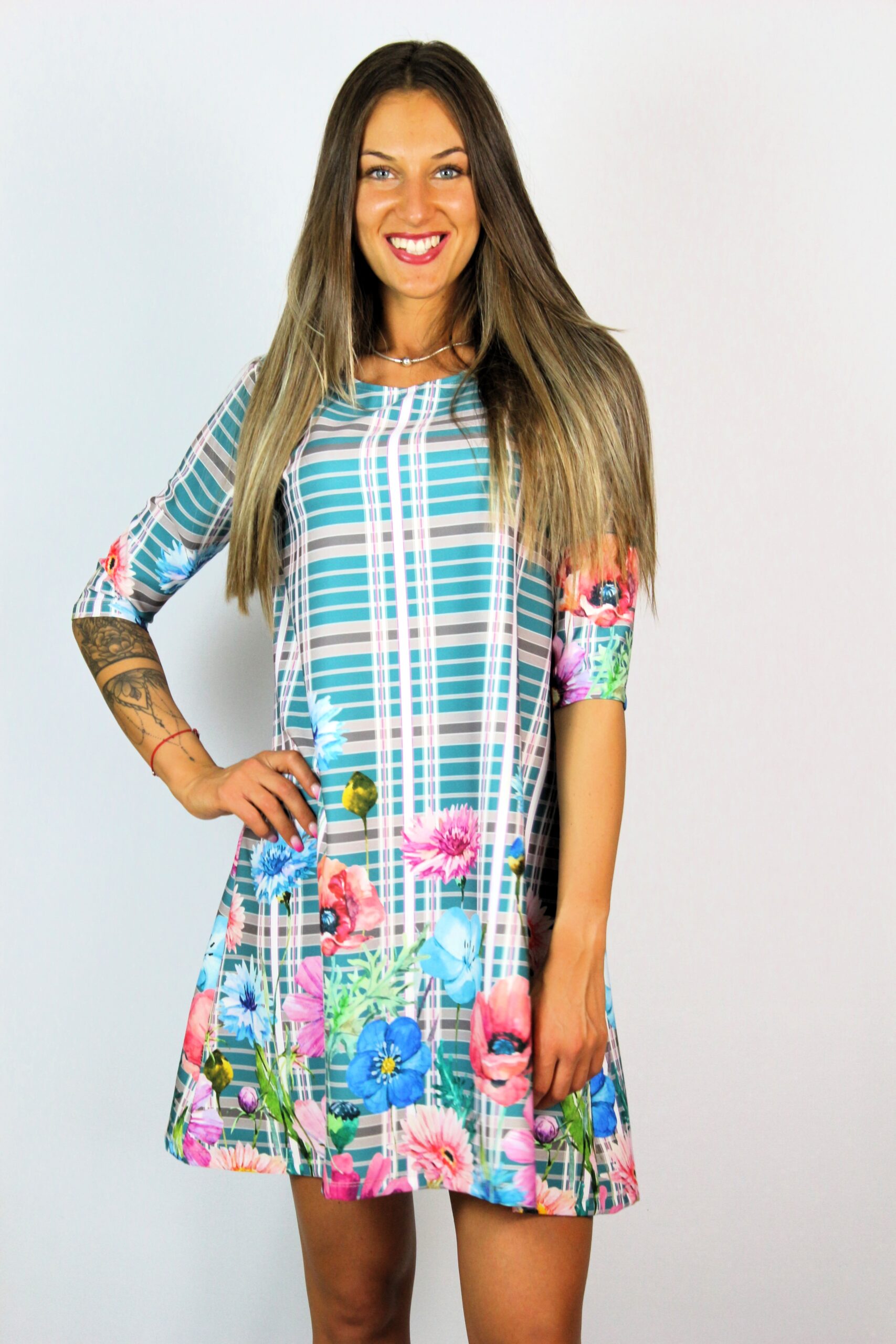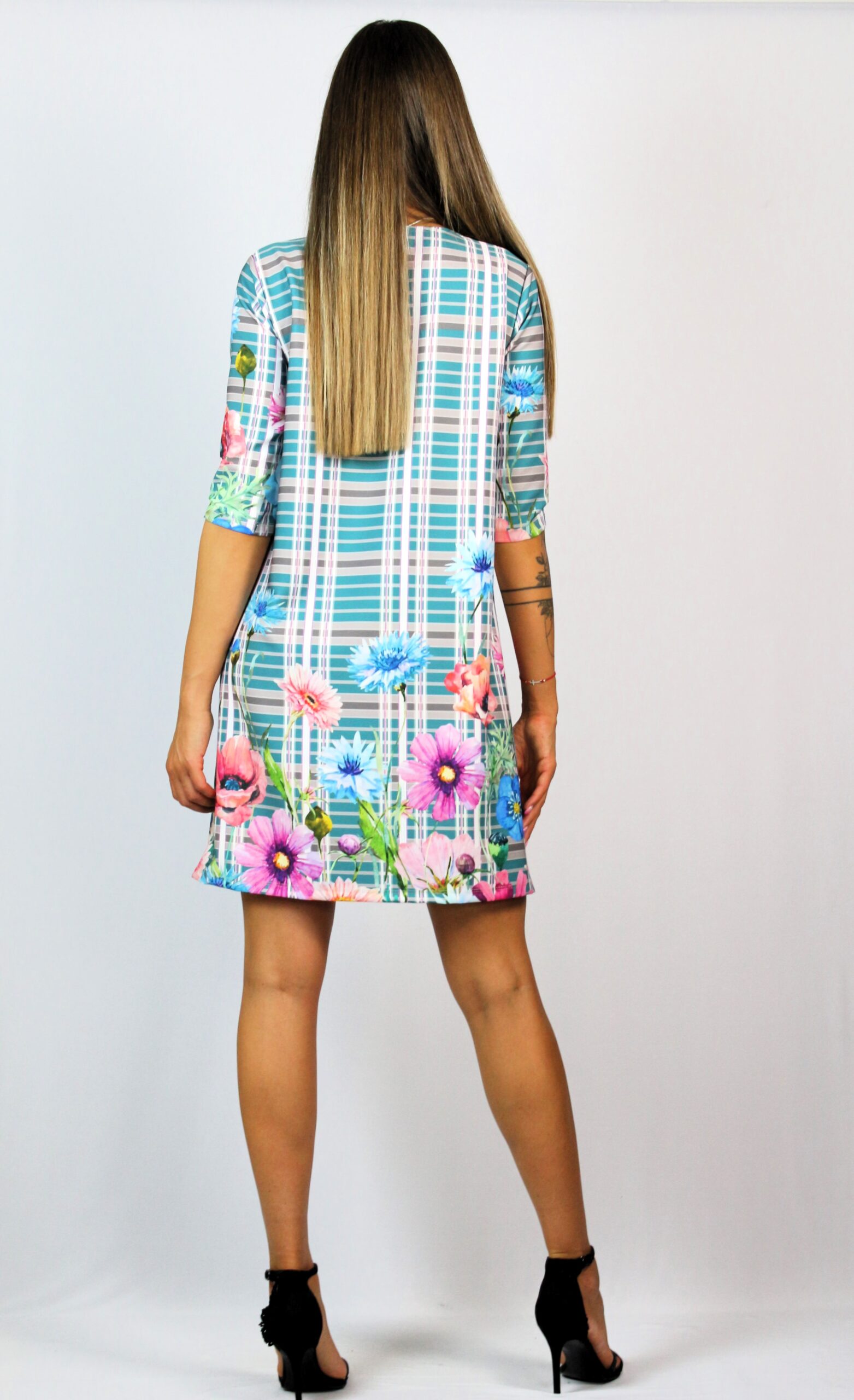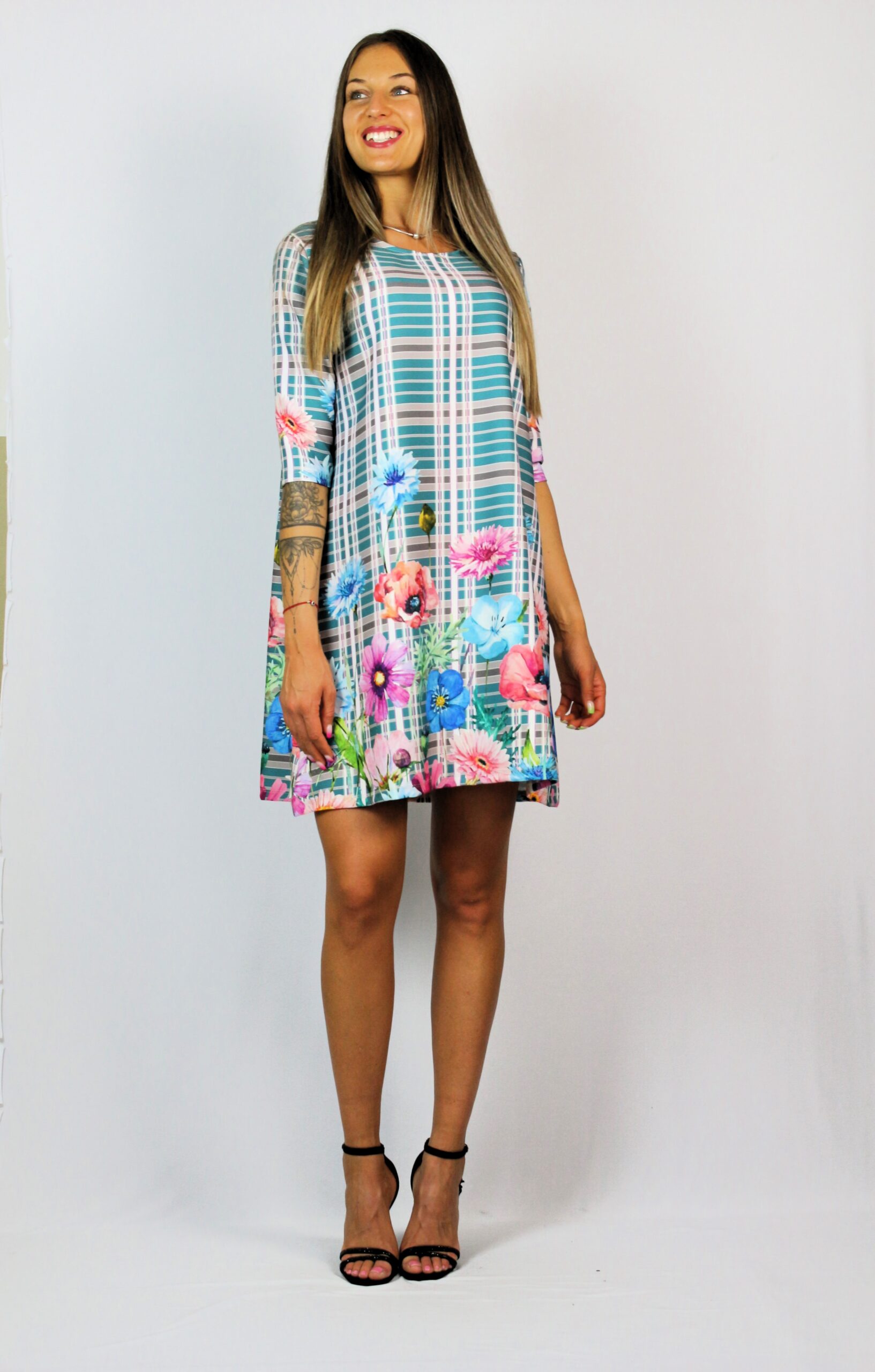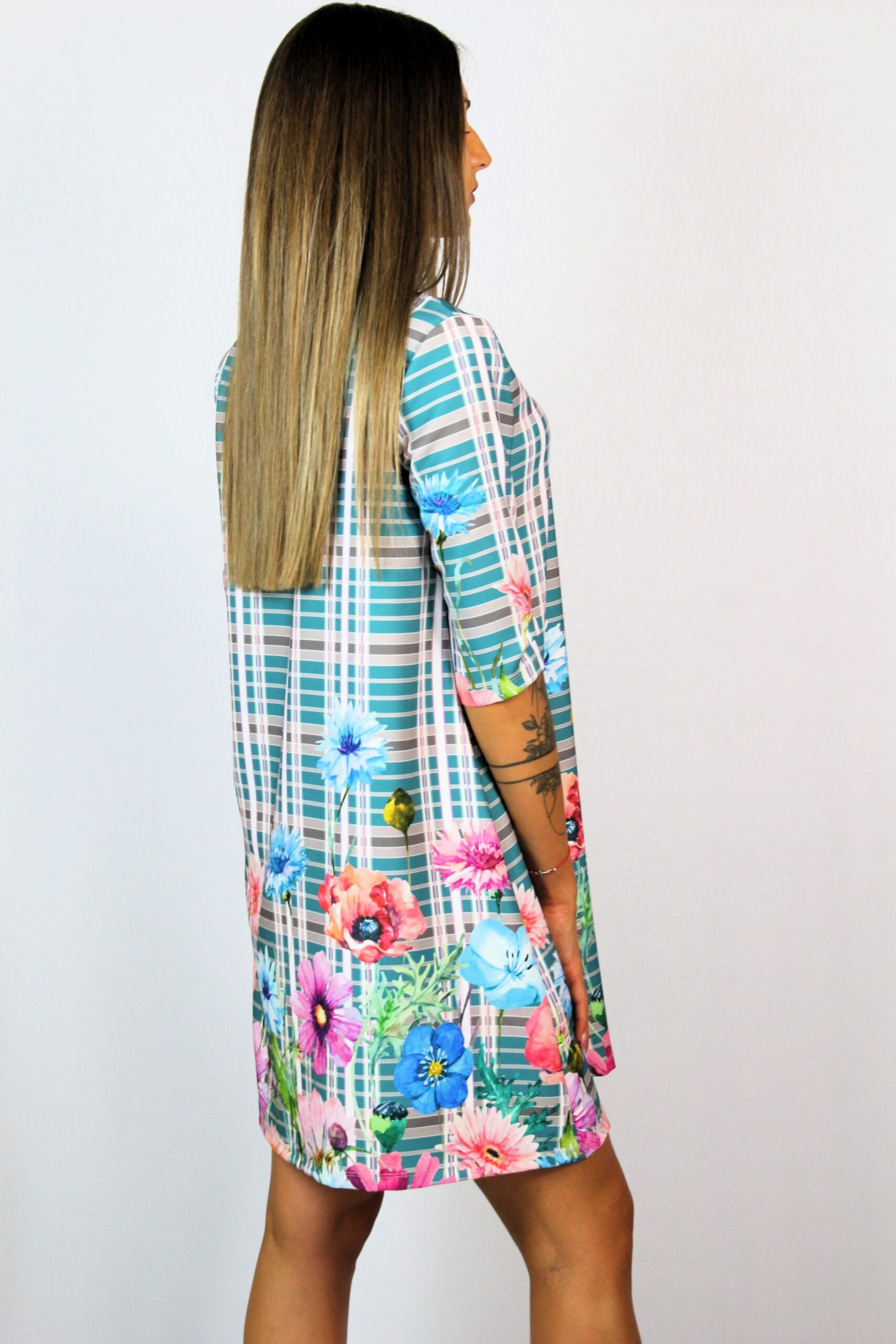 Свободно падаща рокля с три-четвърт ръкави обло деколте.