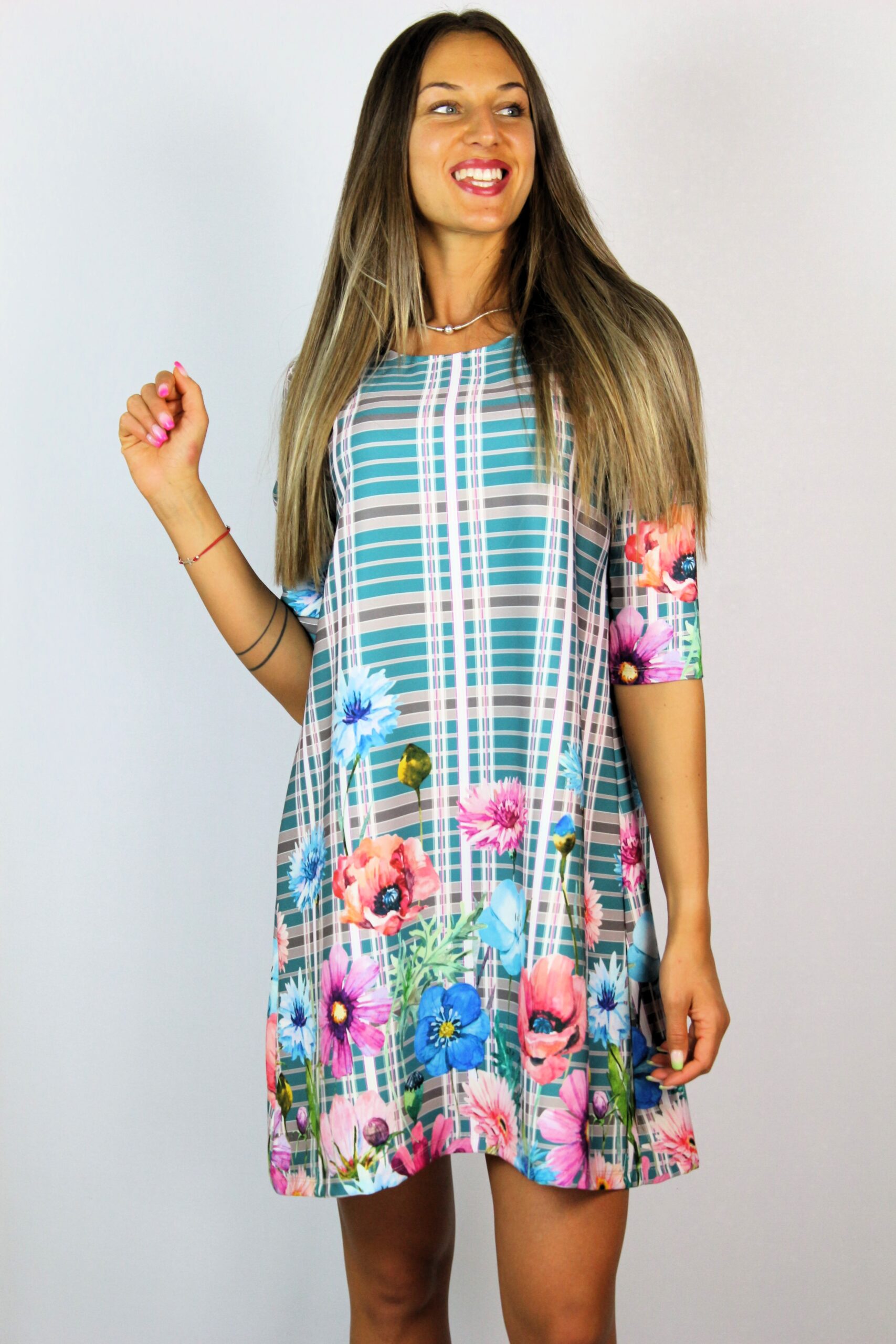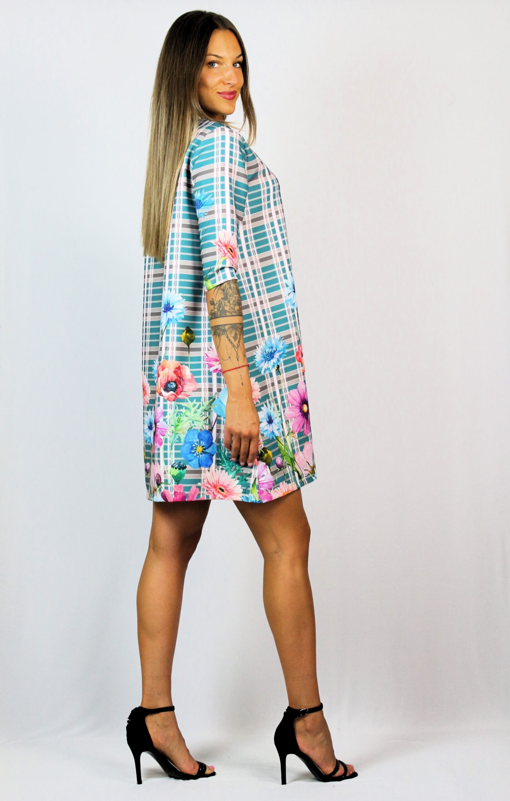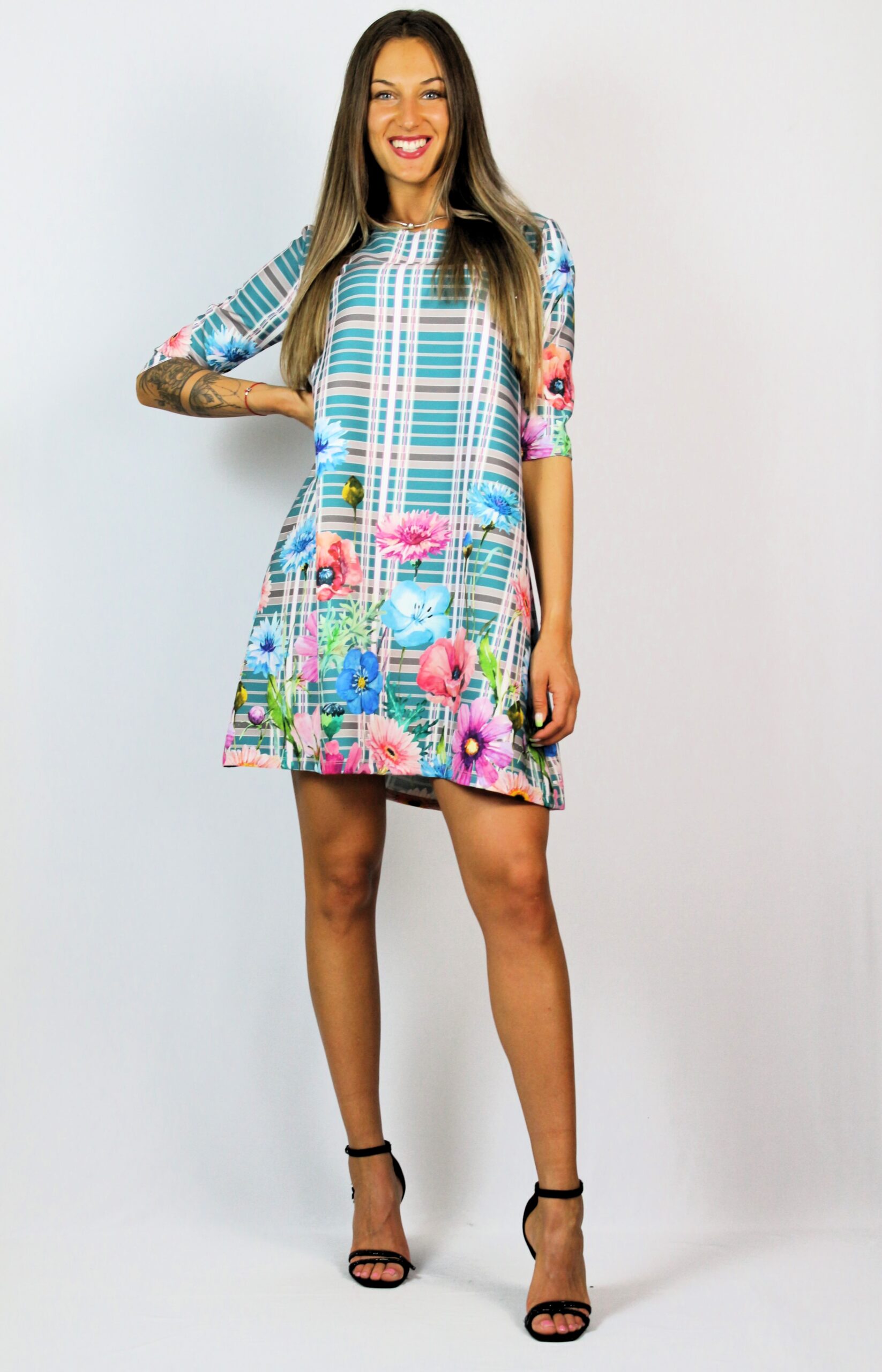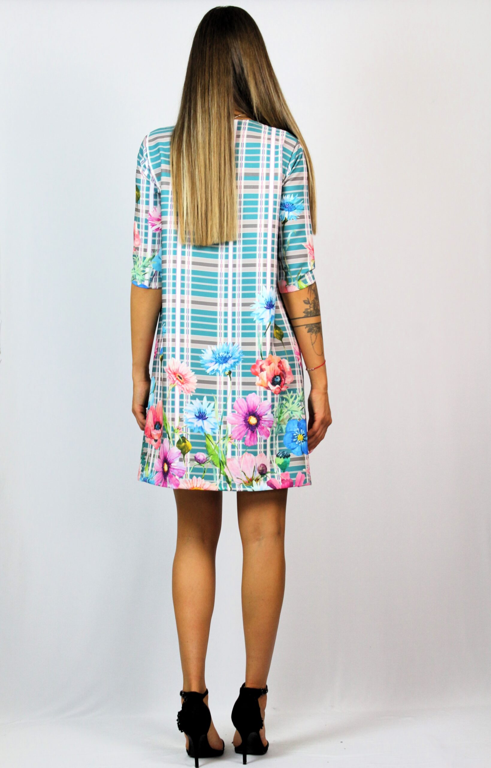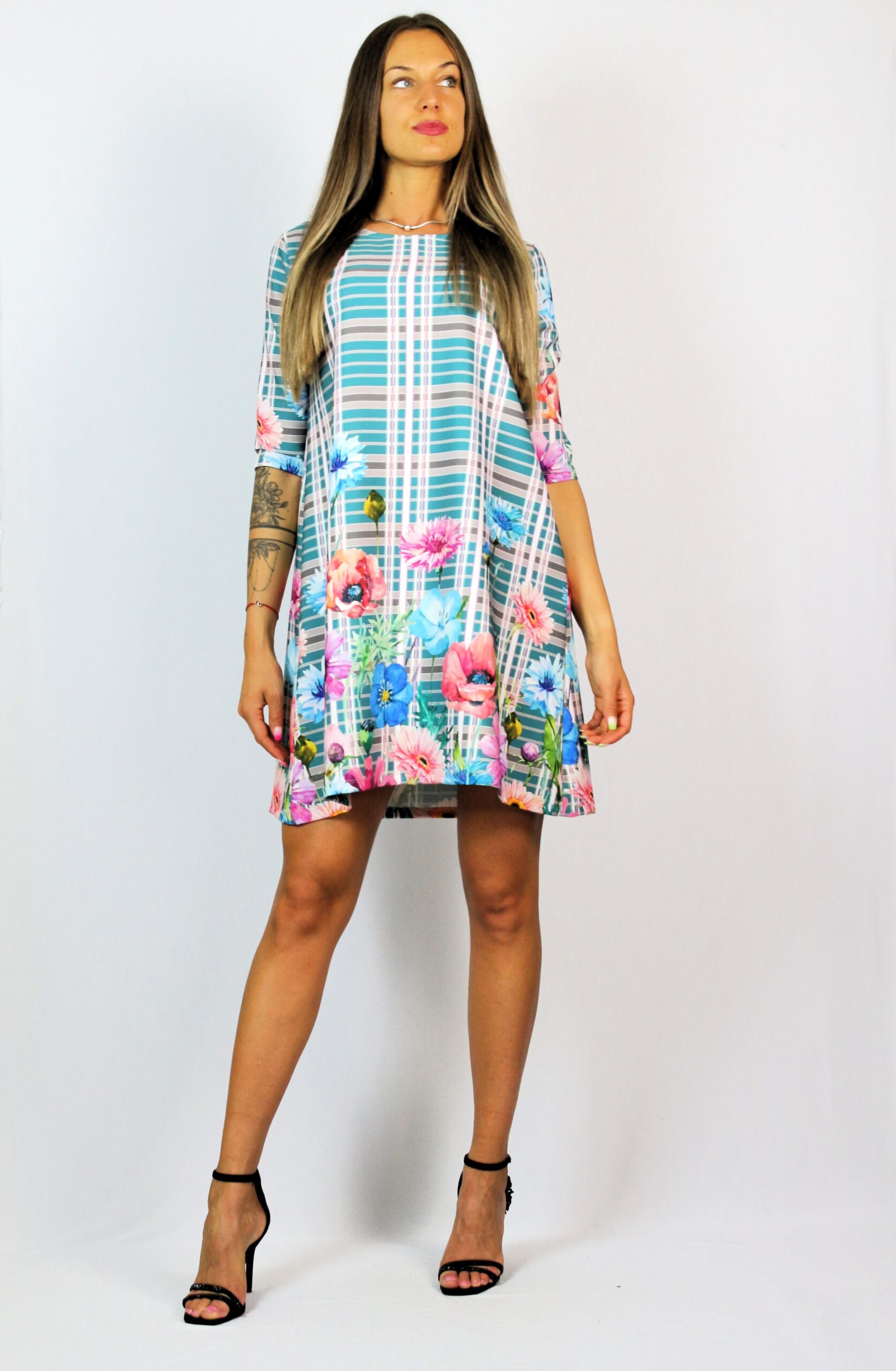 Свободно падаща рокля с три-четвърт ръкави обло деколте.