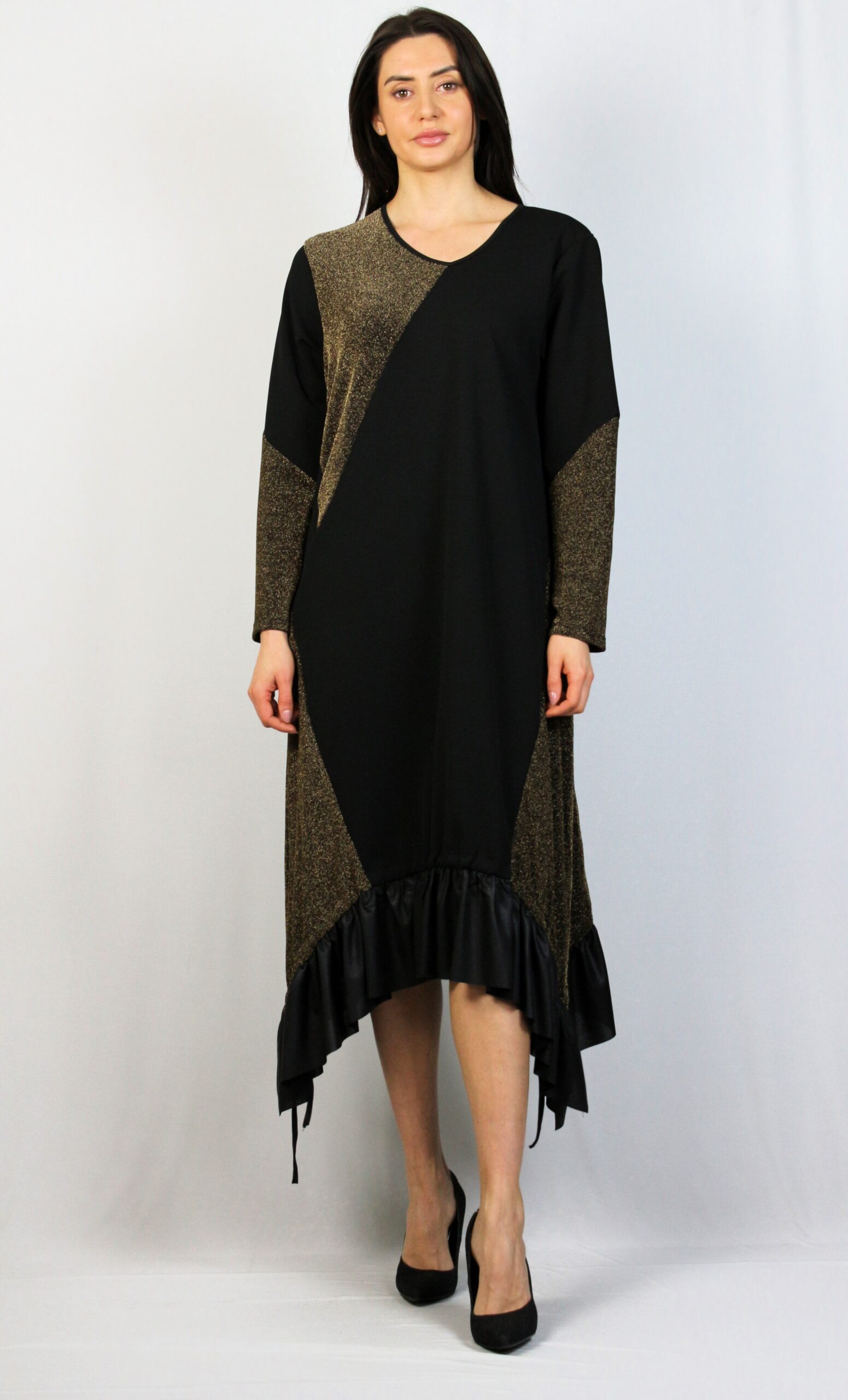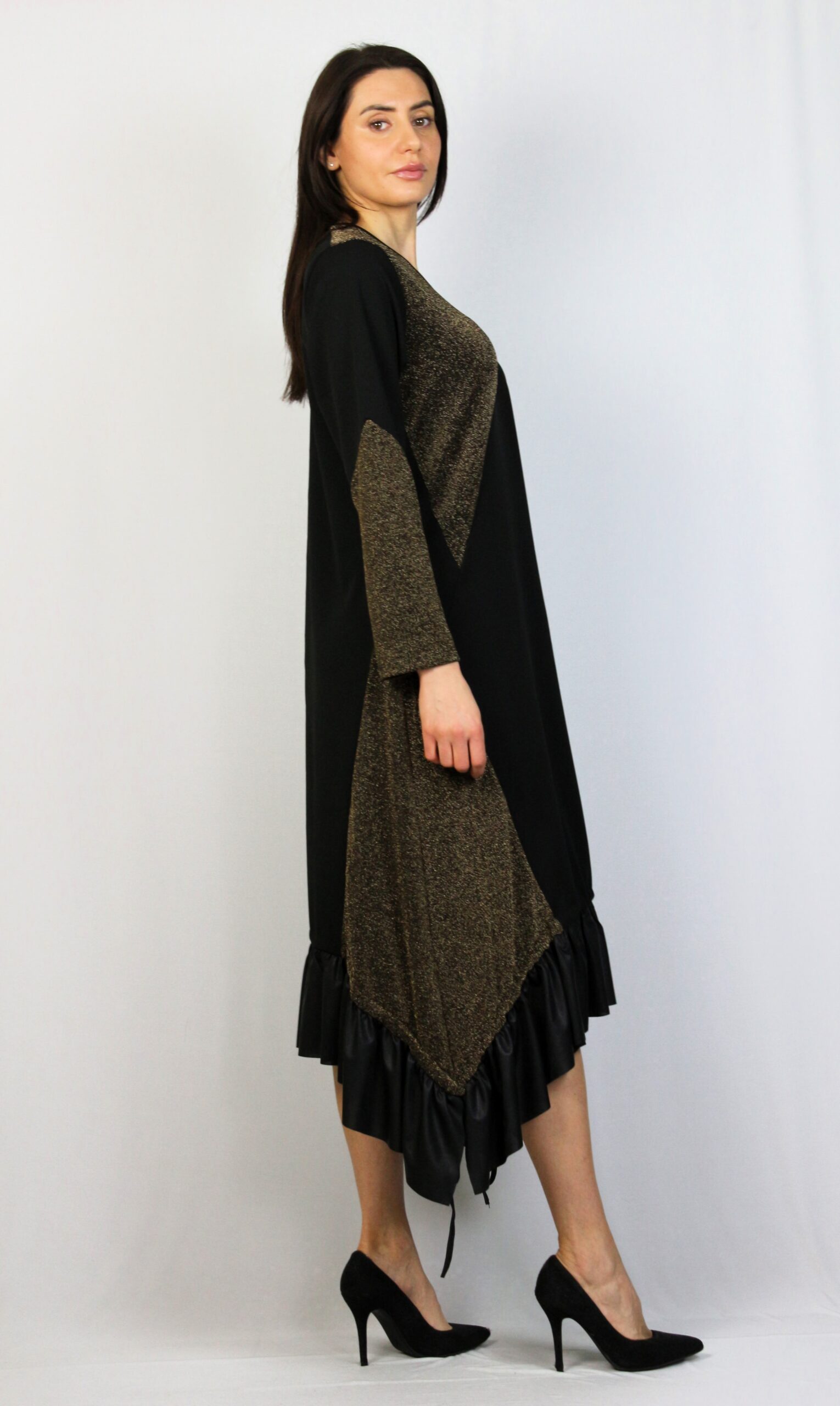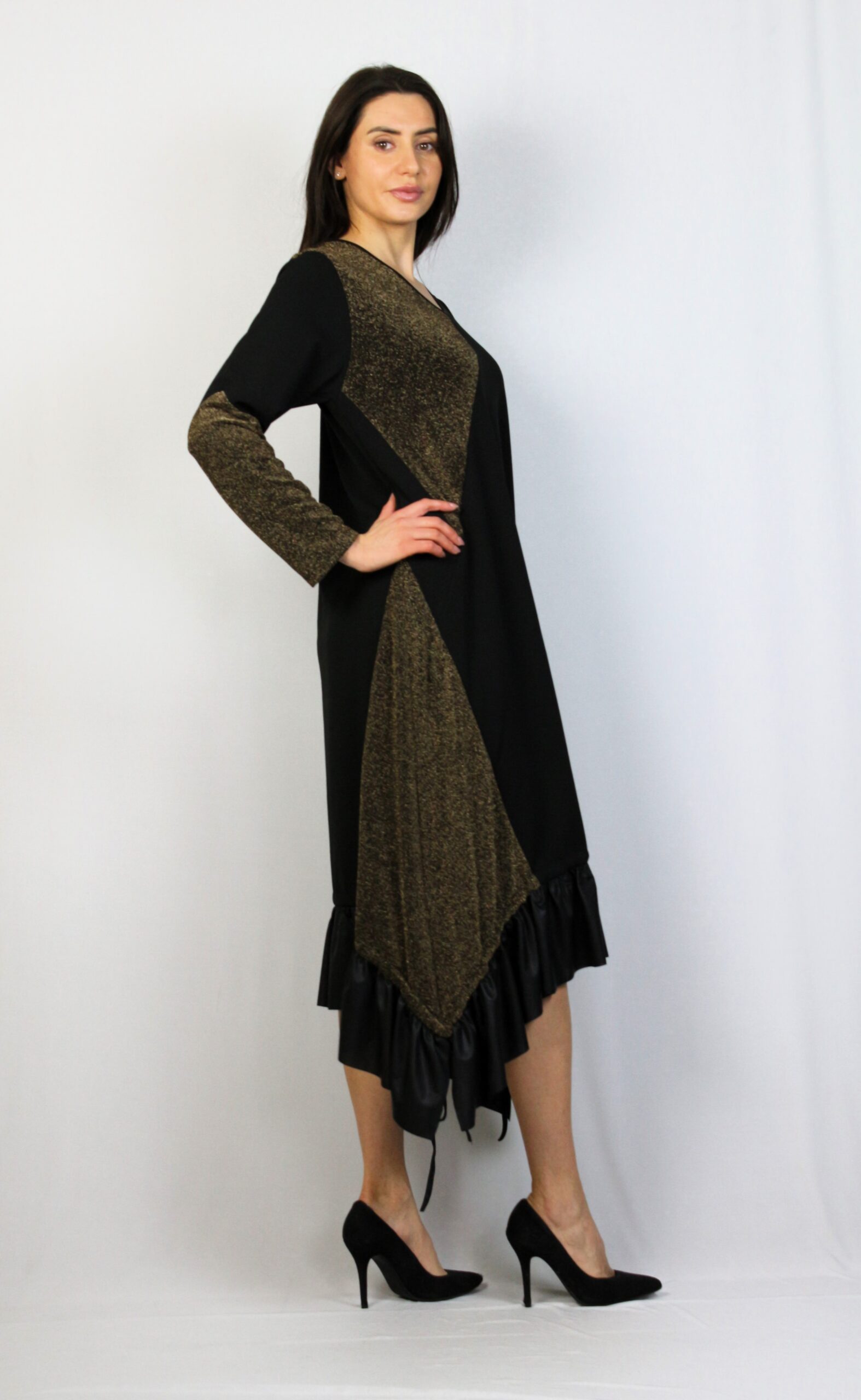 Свободно падаща рокля комбинирана с триъгълни парчета, с обло деколте и дълъг ръкав . В долната част завършва с къдра от кожа и връзки ,които служат да се кореагира ширината на роклята,