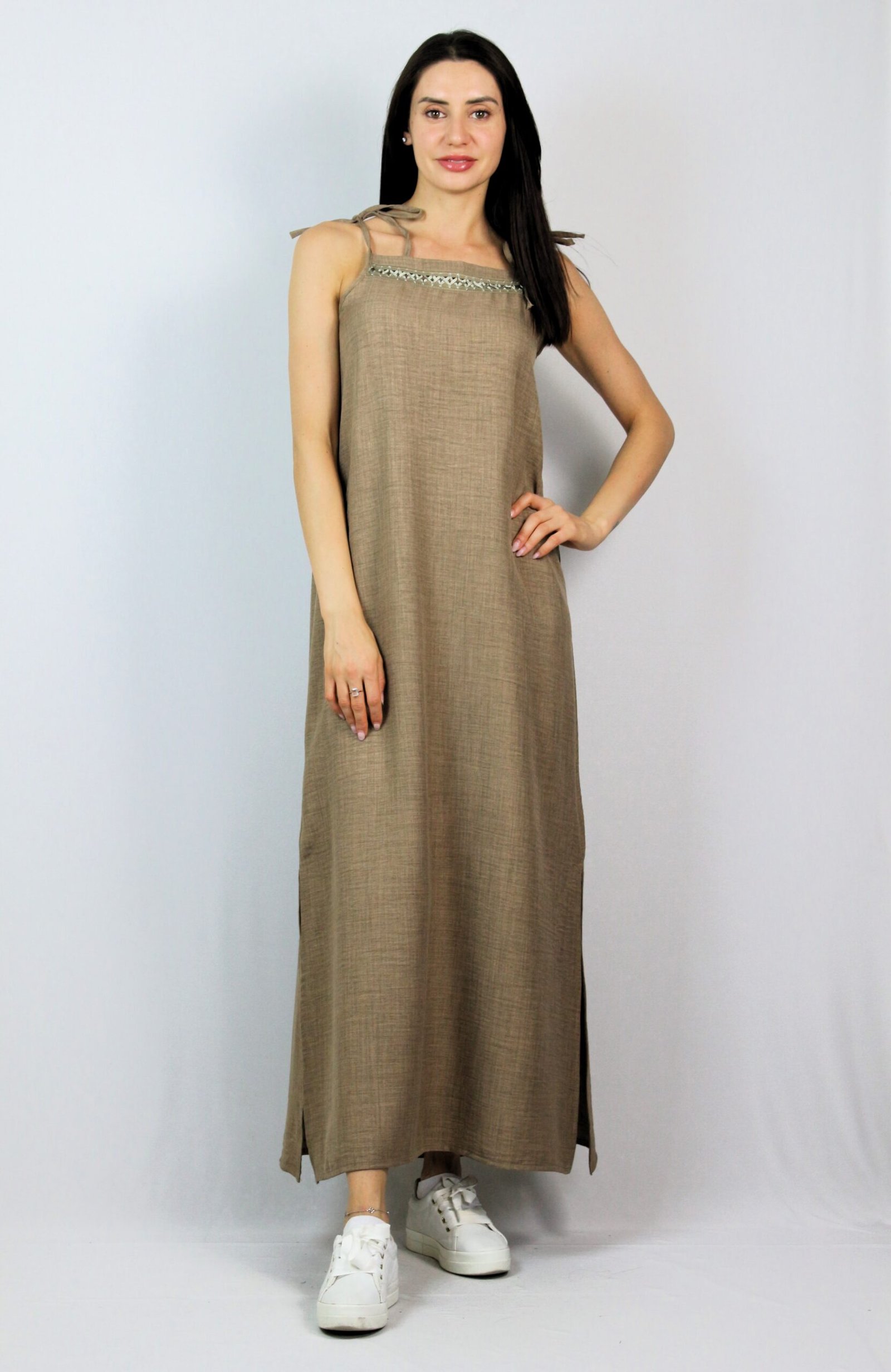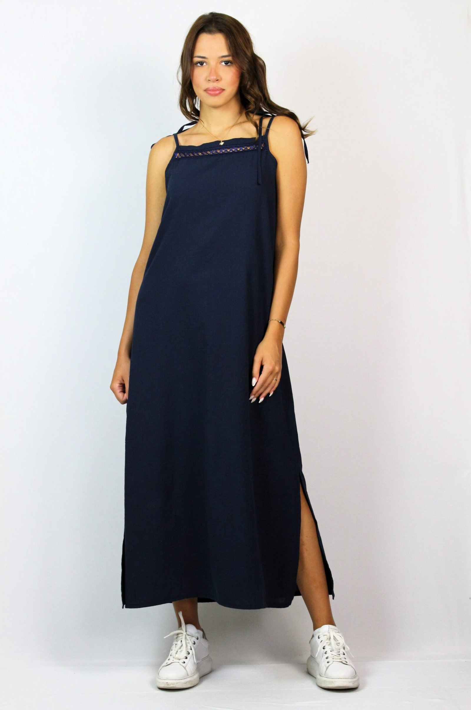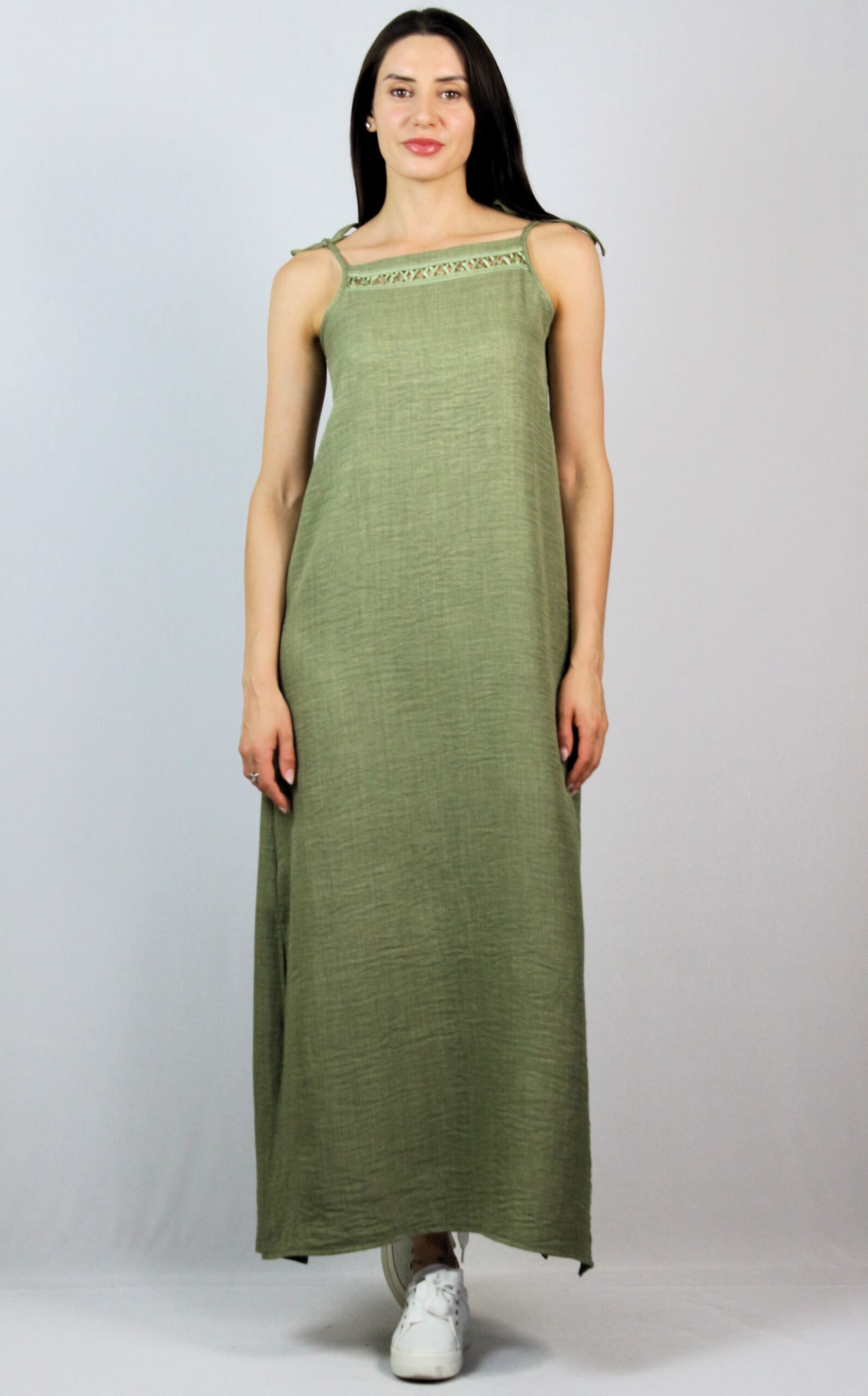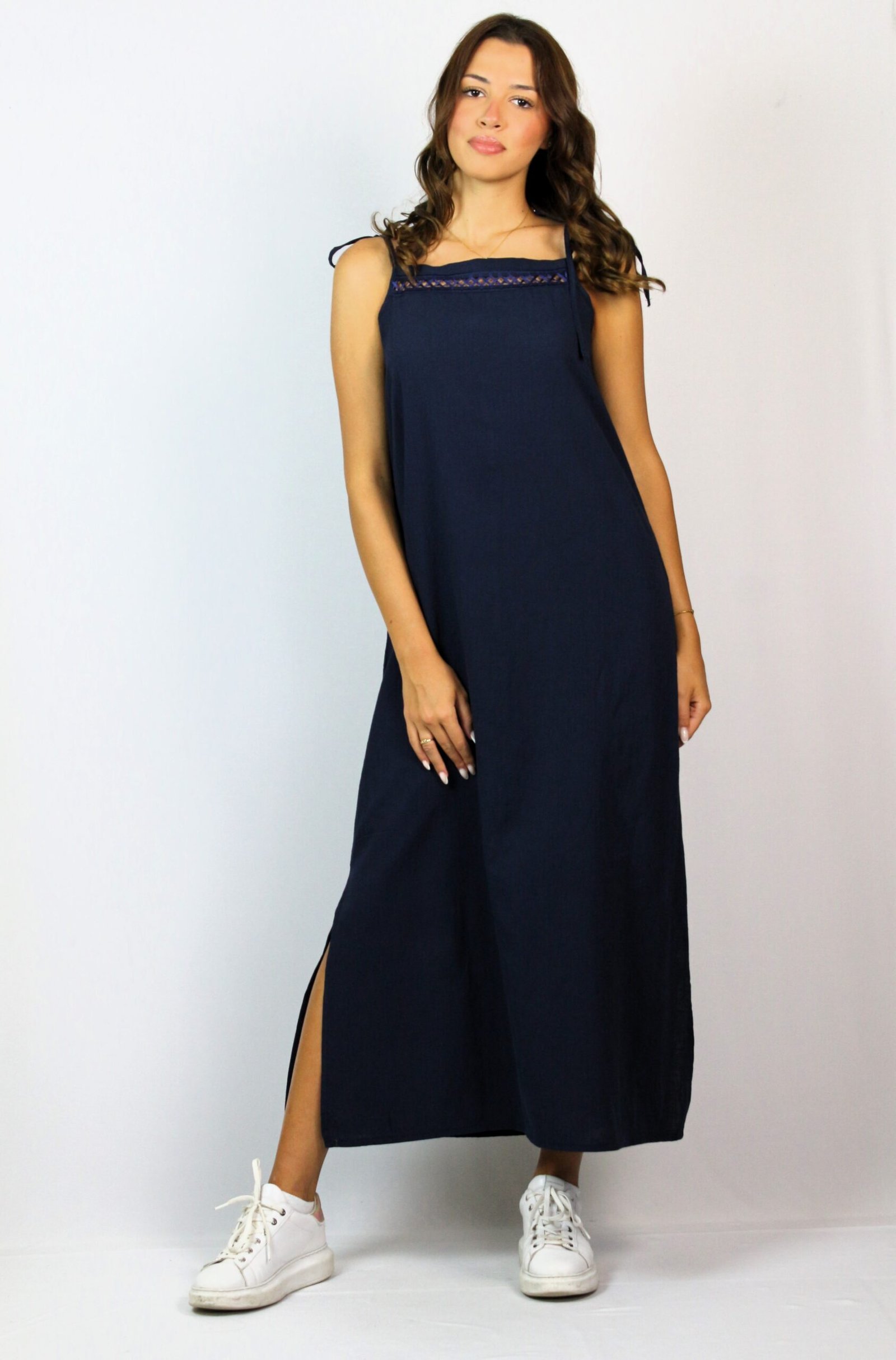 Свободна рокля с тънки презрамки , които се връзват на панделки и две странични цепки . Изработена от памучна тъкан.