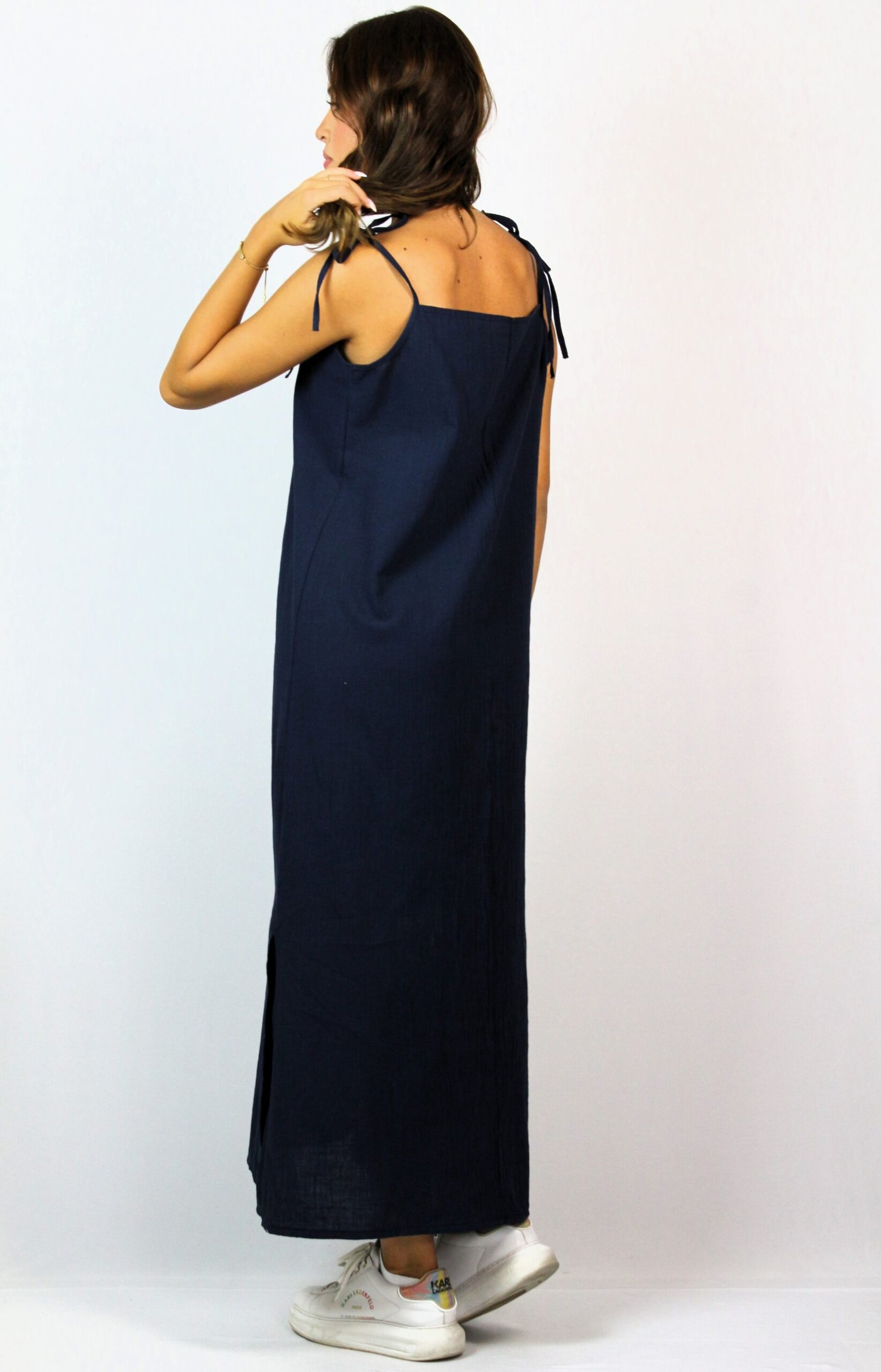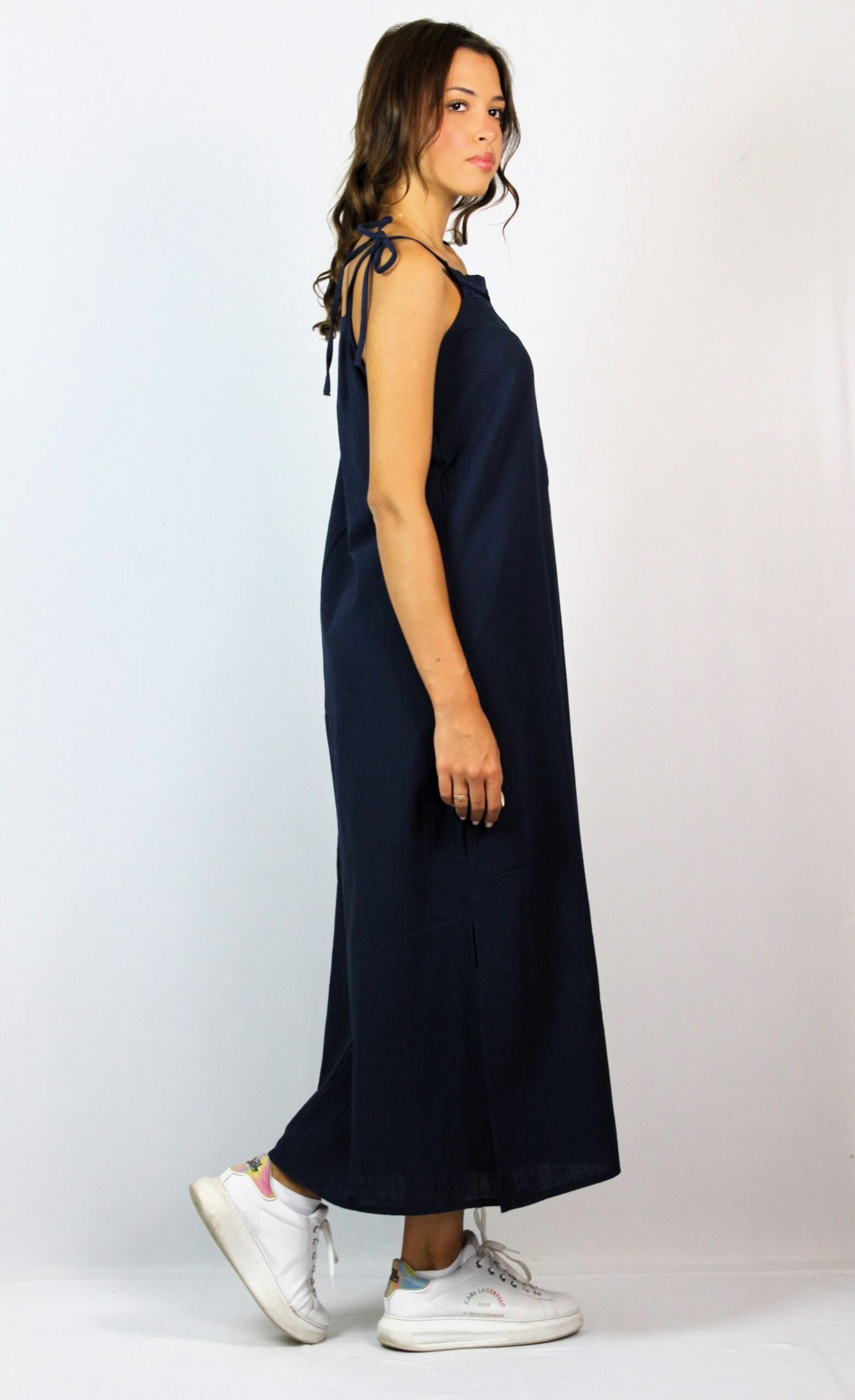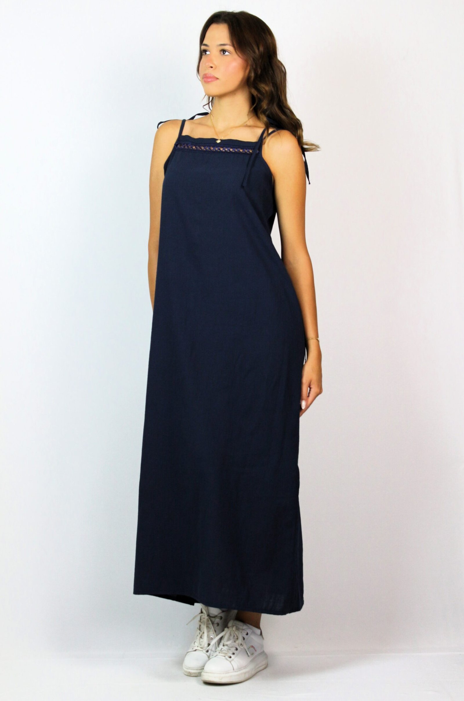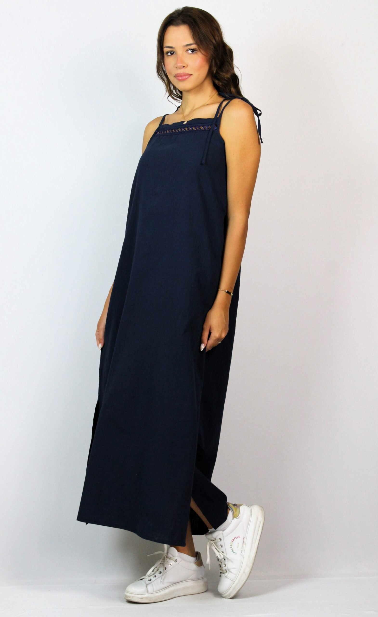 Свободна рокля с тънки презрамки , които се връзват на панделки и две странични цепки . Изработена от памучна тъкан.