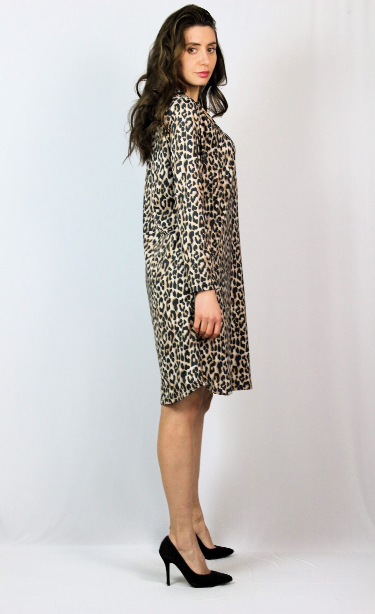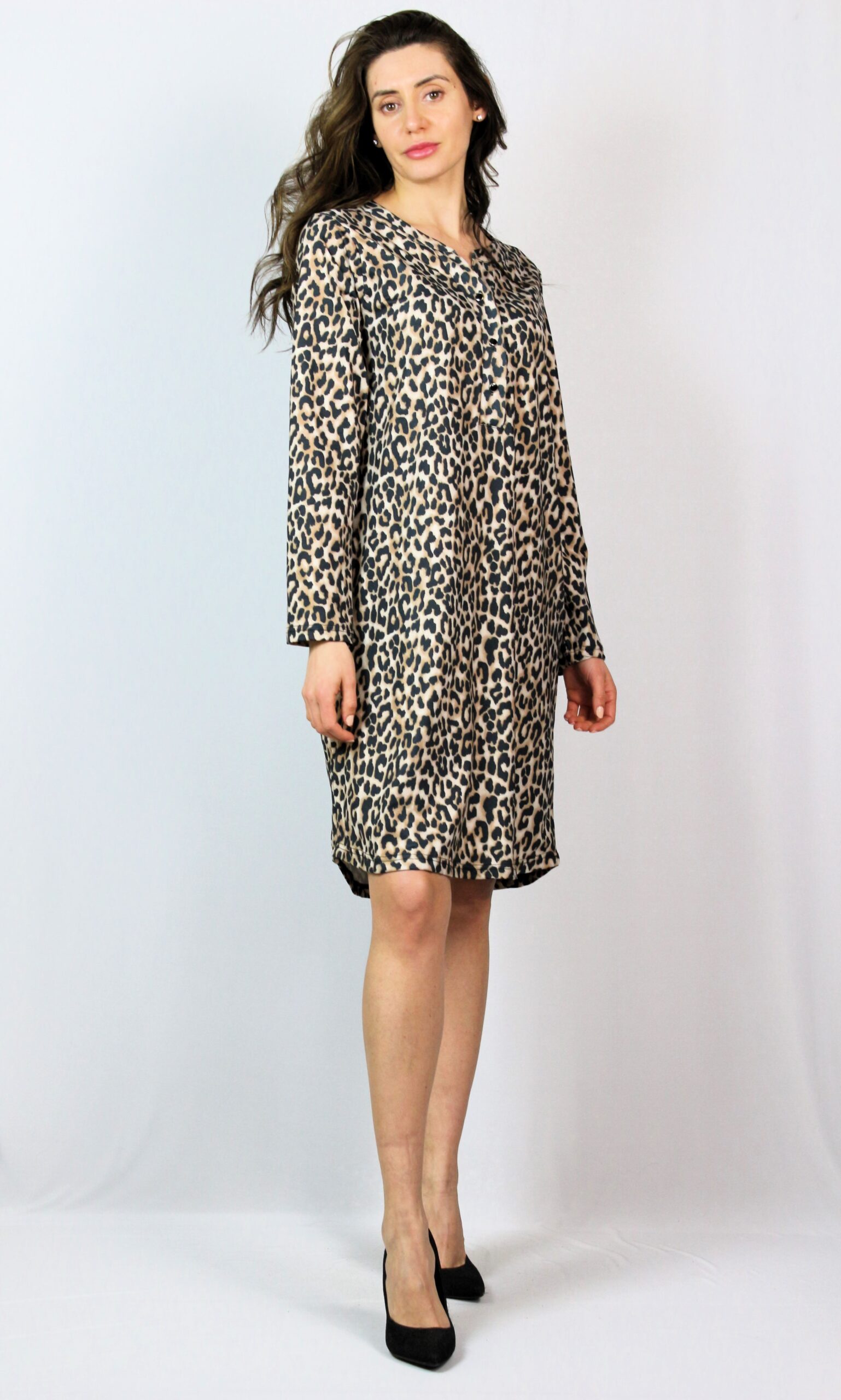 Свободна рокля с два вътрешни джоба и шпиц деколте с копчета.