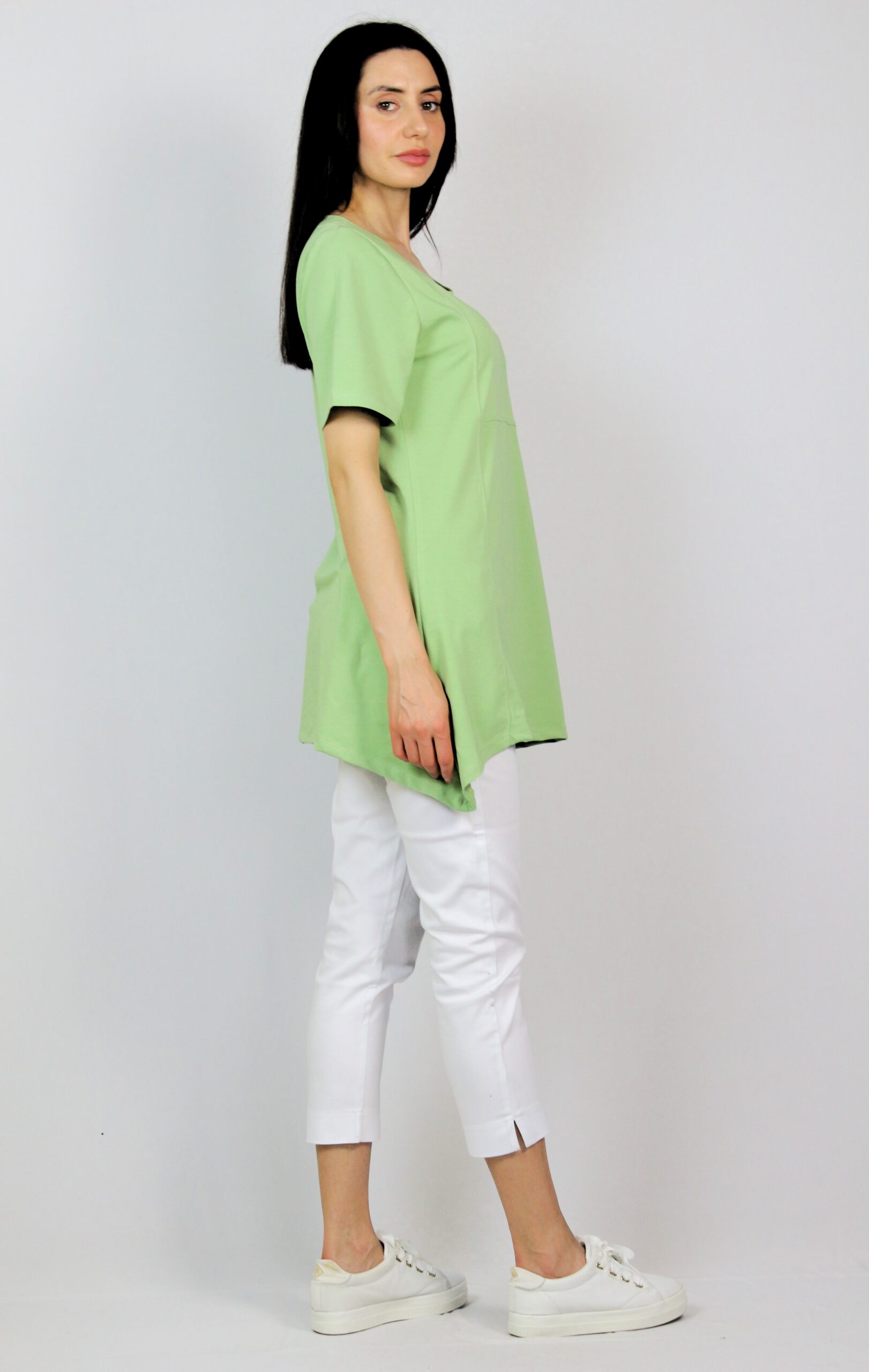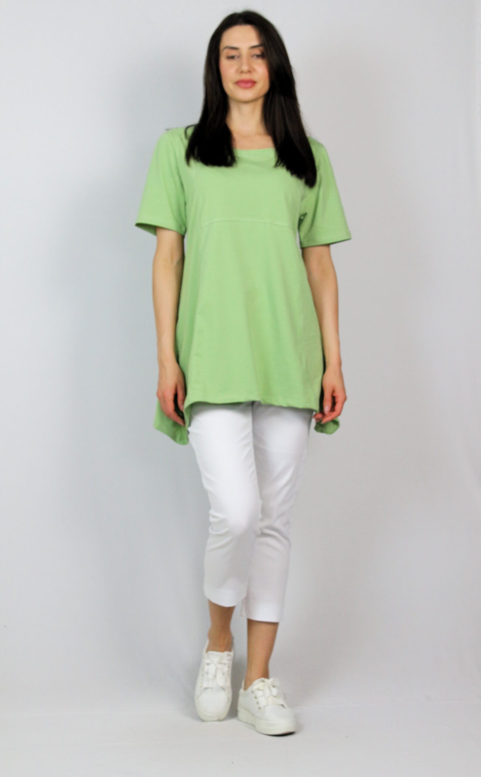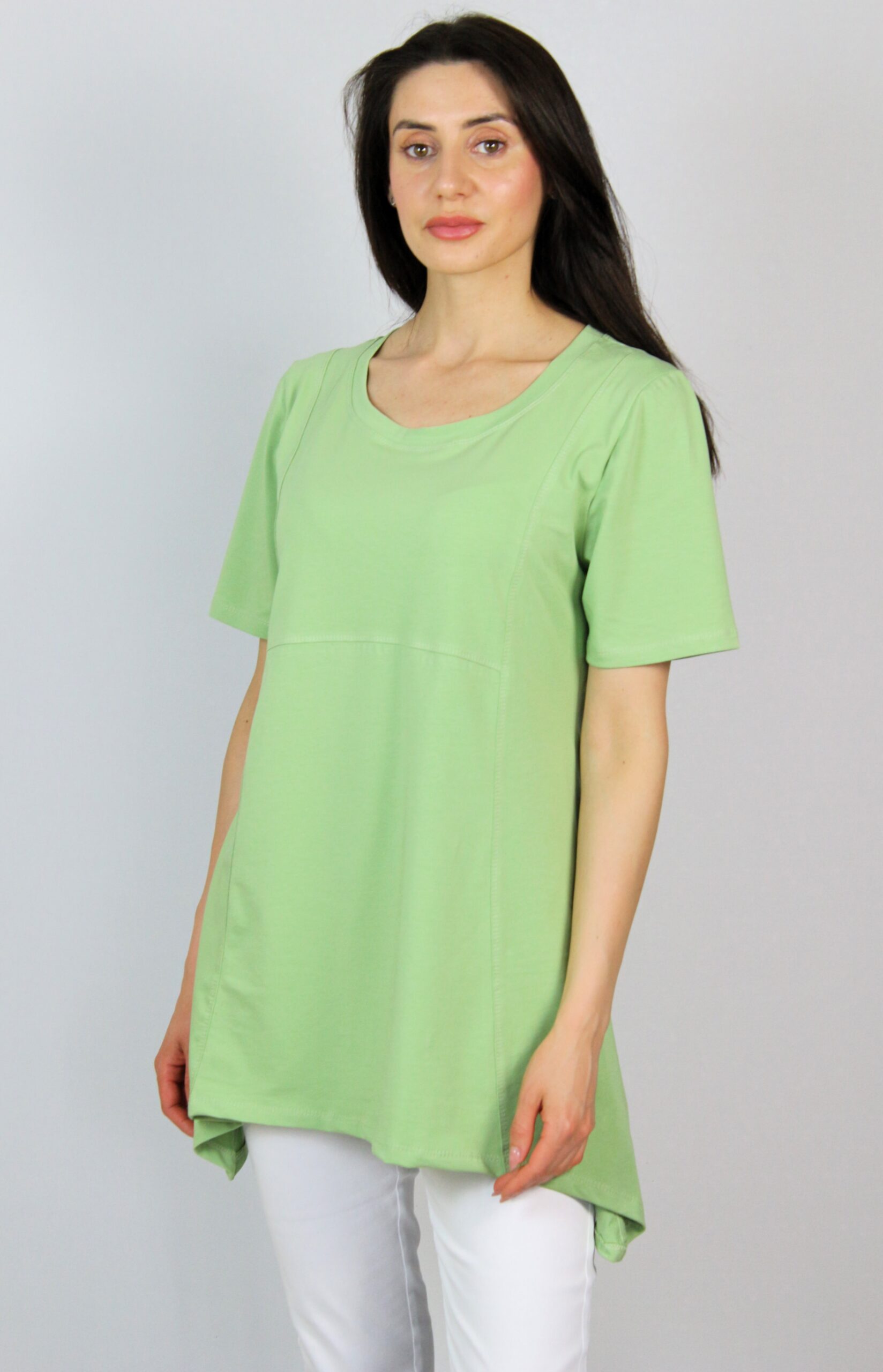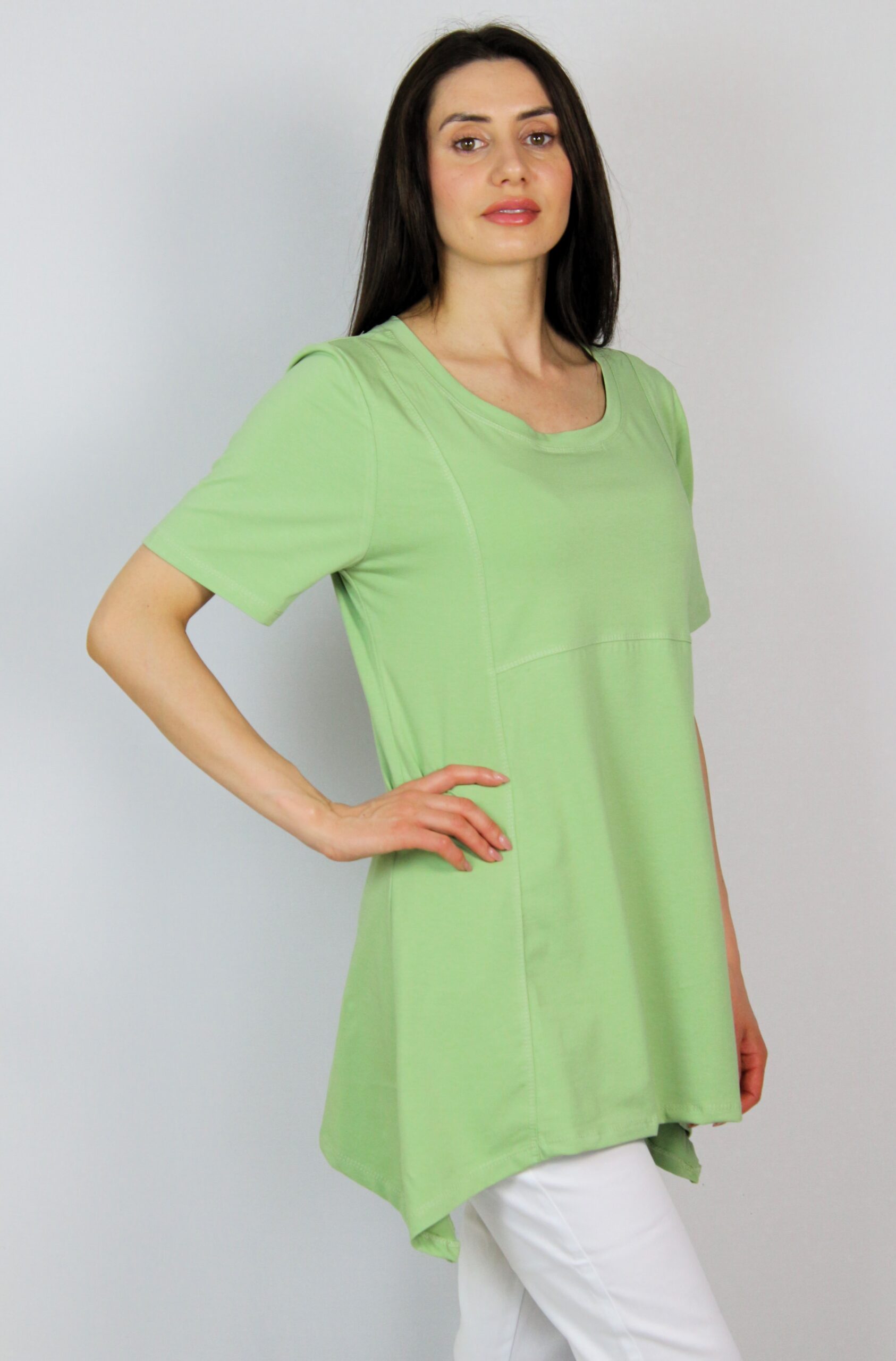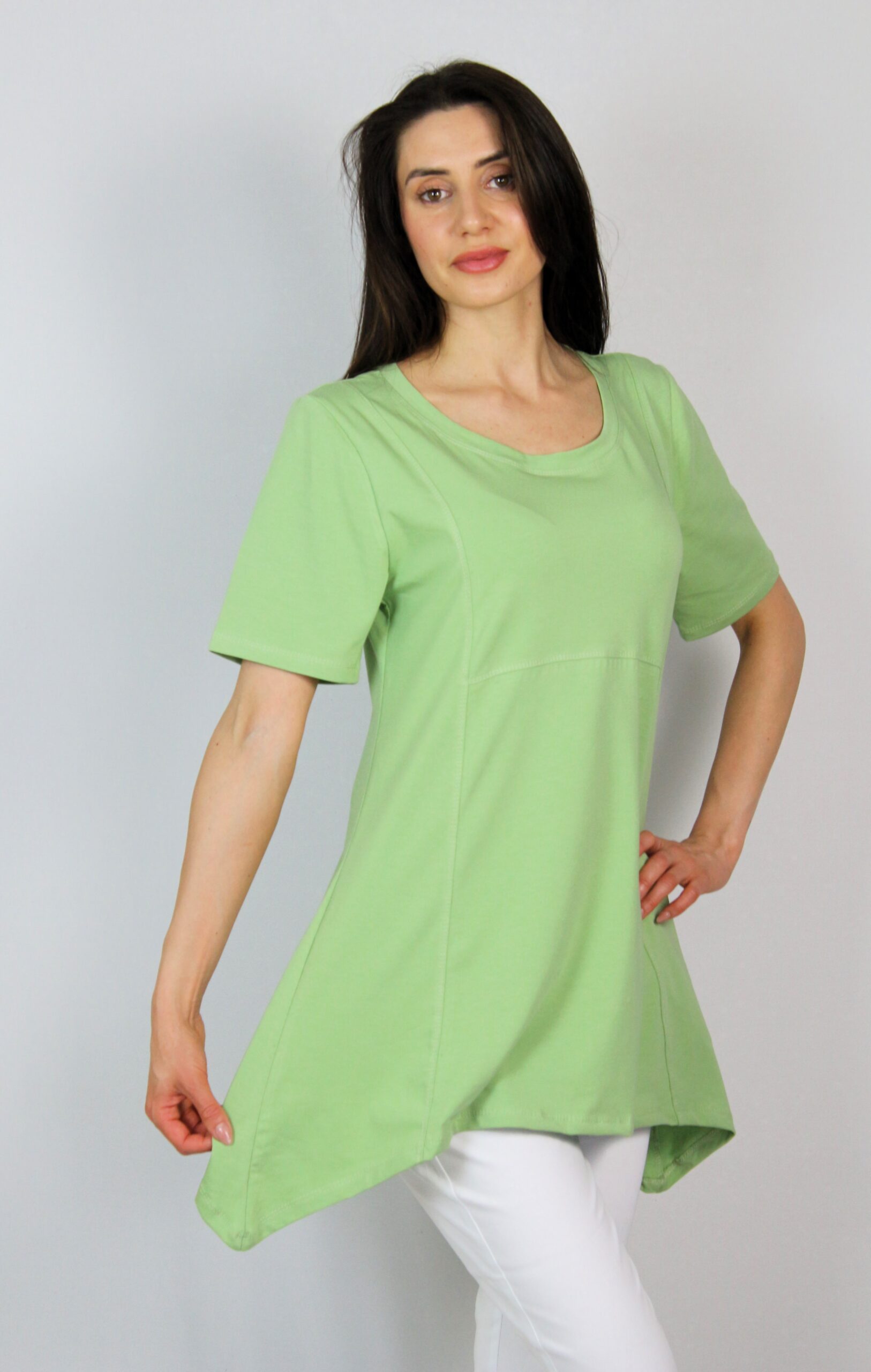 Памучна туника с обло деколте , къс ръкав и асиметрична дължина .