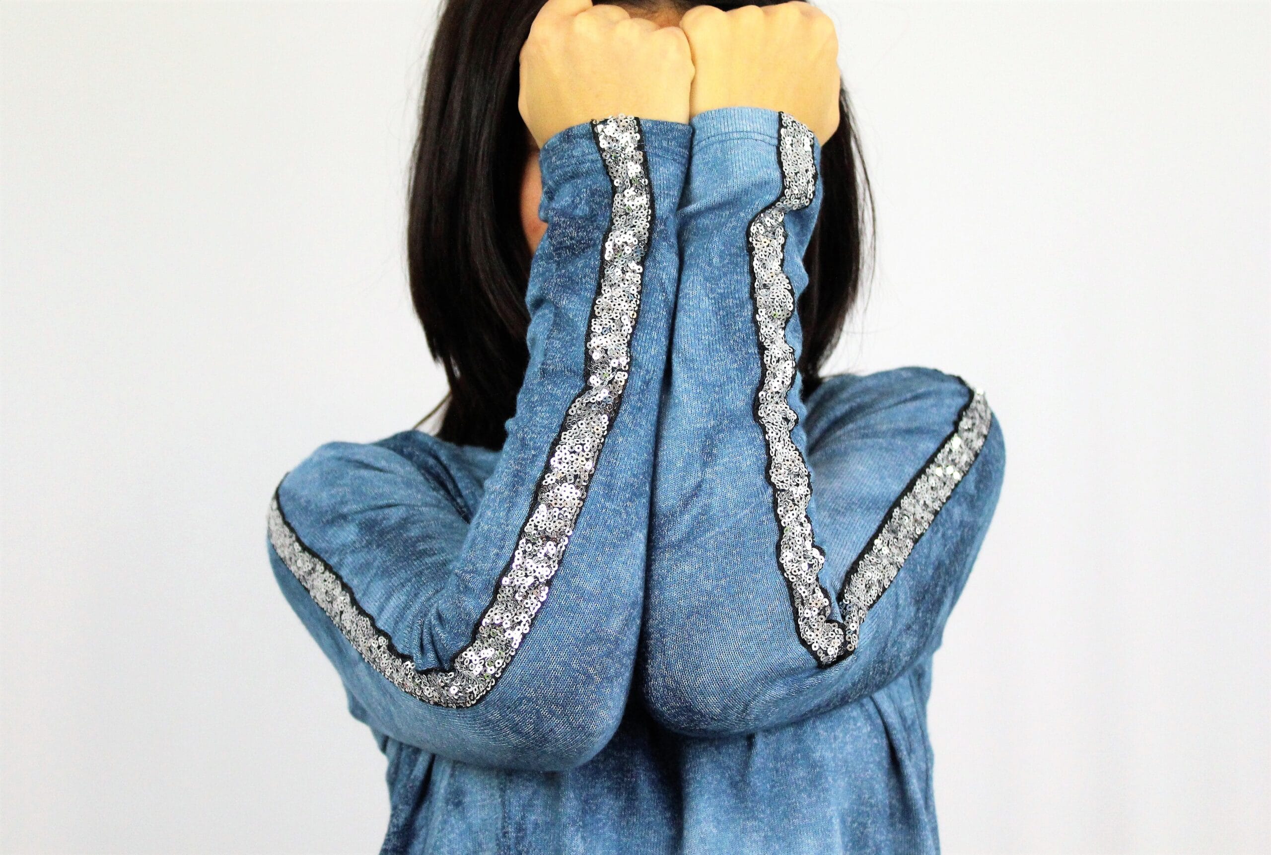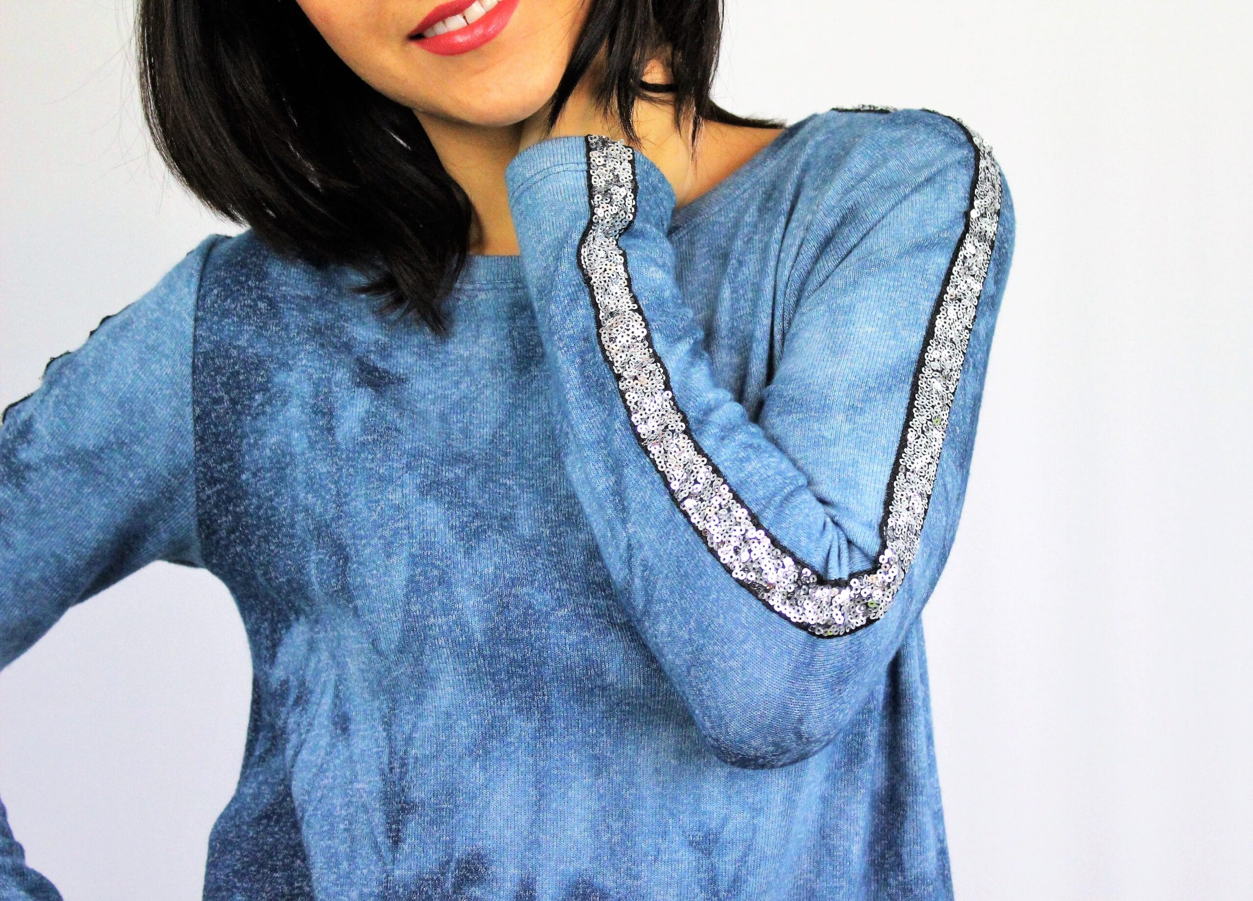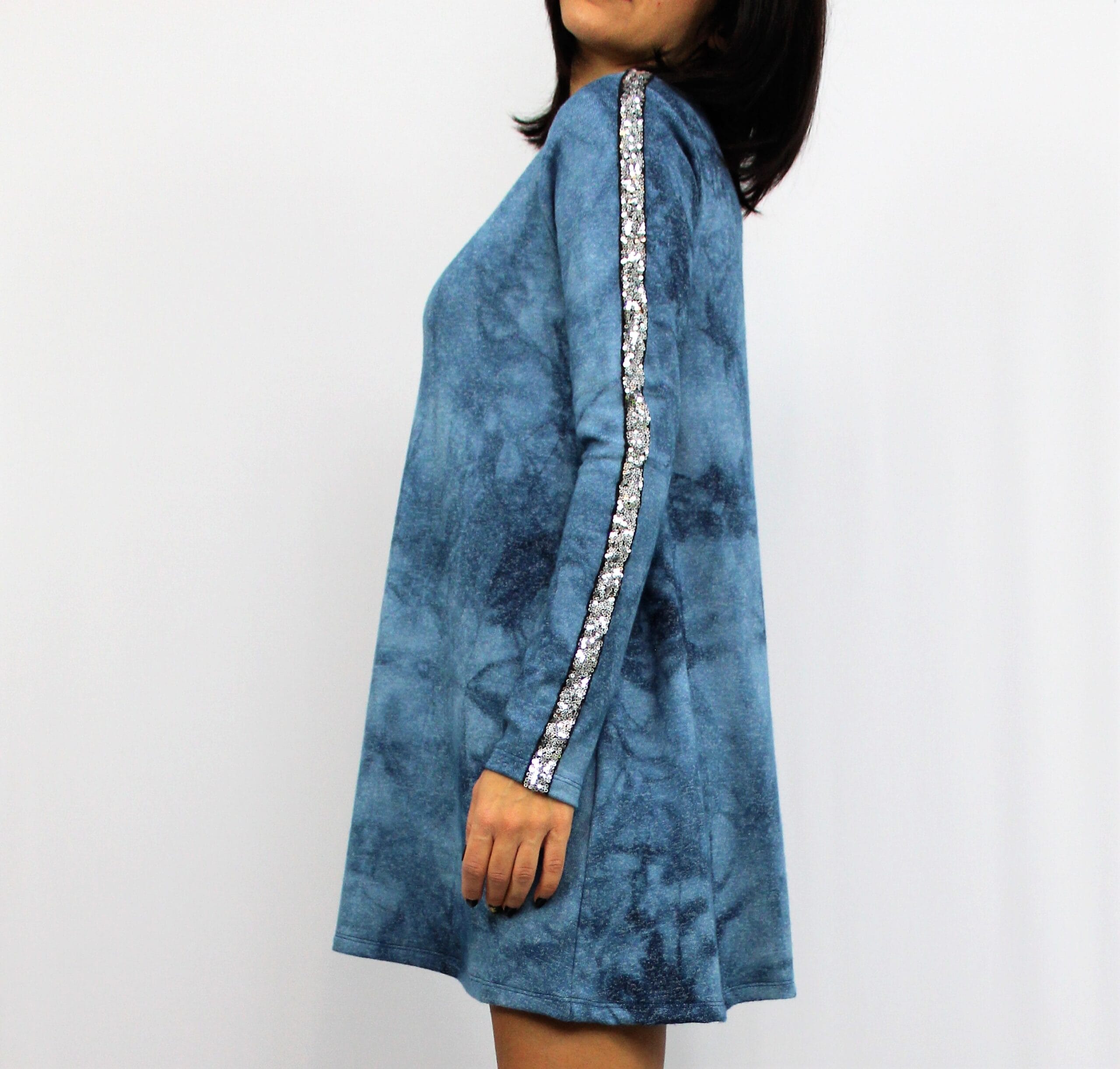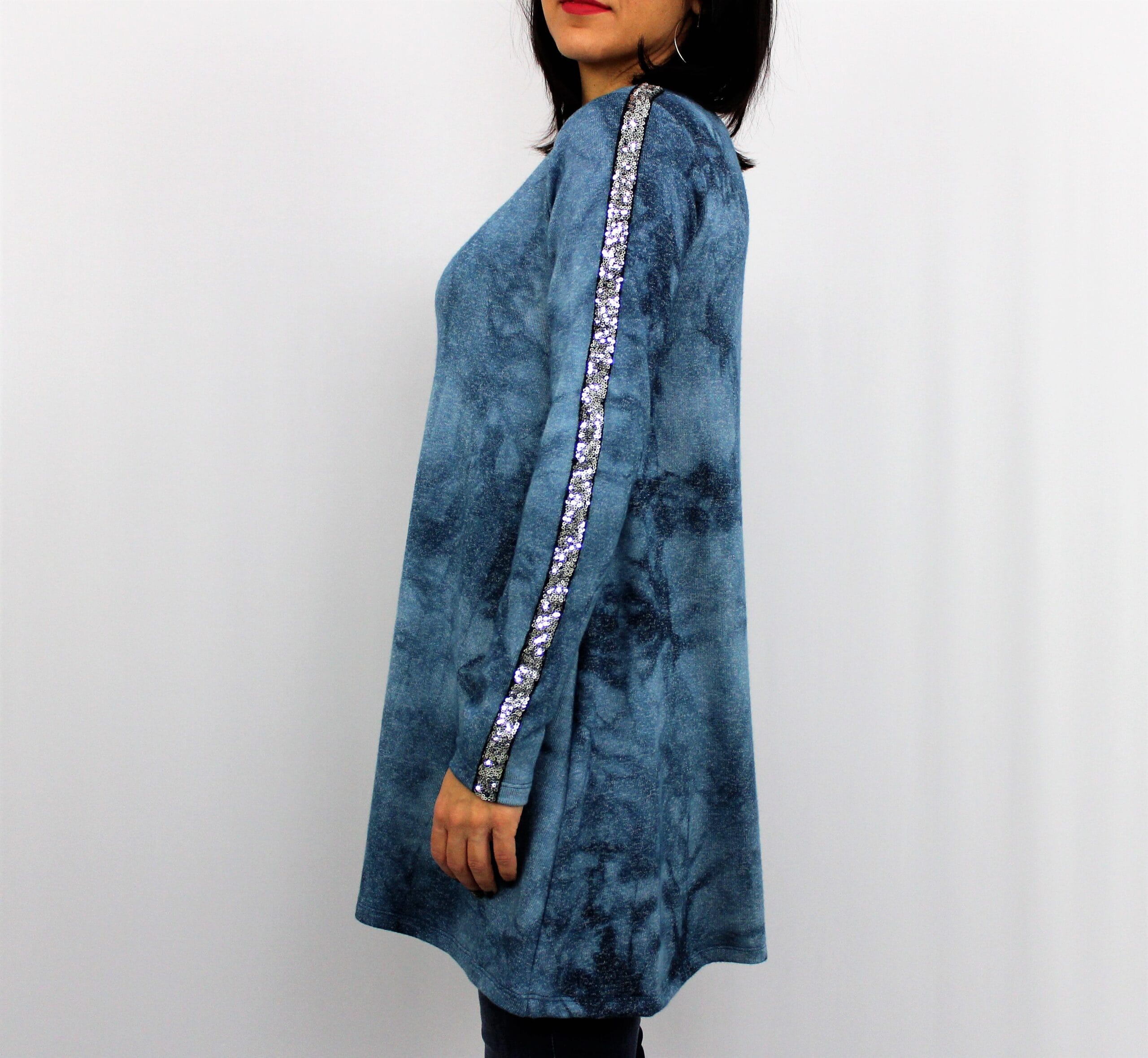 Туника разкроена, свободно падаща надолу с красив кант на ръкава от паети. Дължината позволява да се носи и като къса рокля. Изработена е от меко и плътно много еластично вискозно трико.