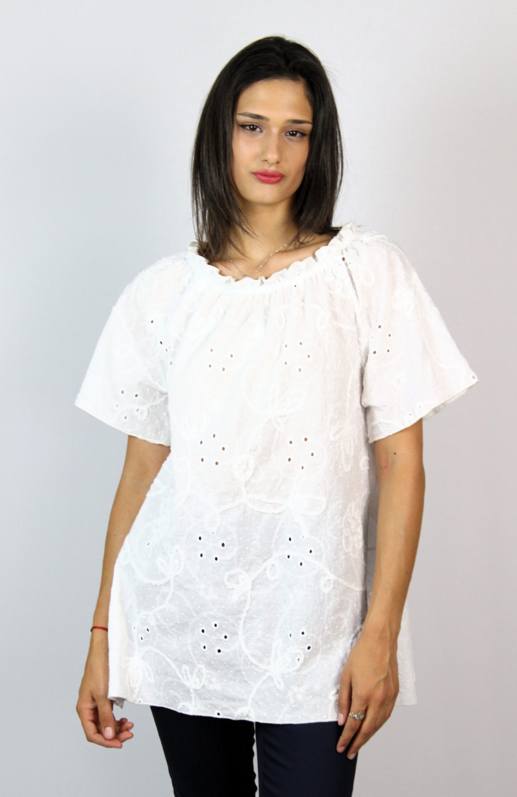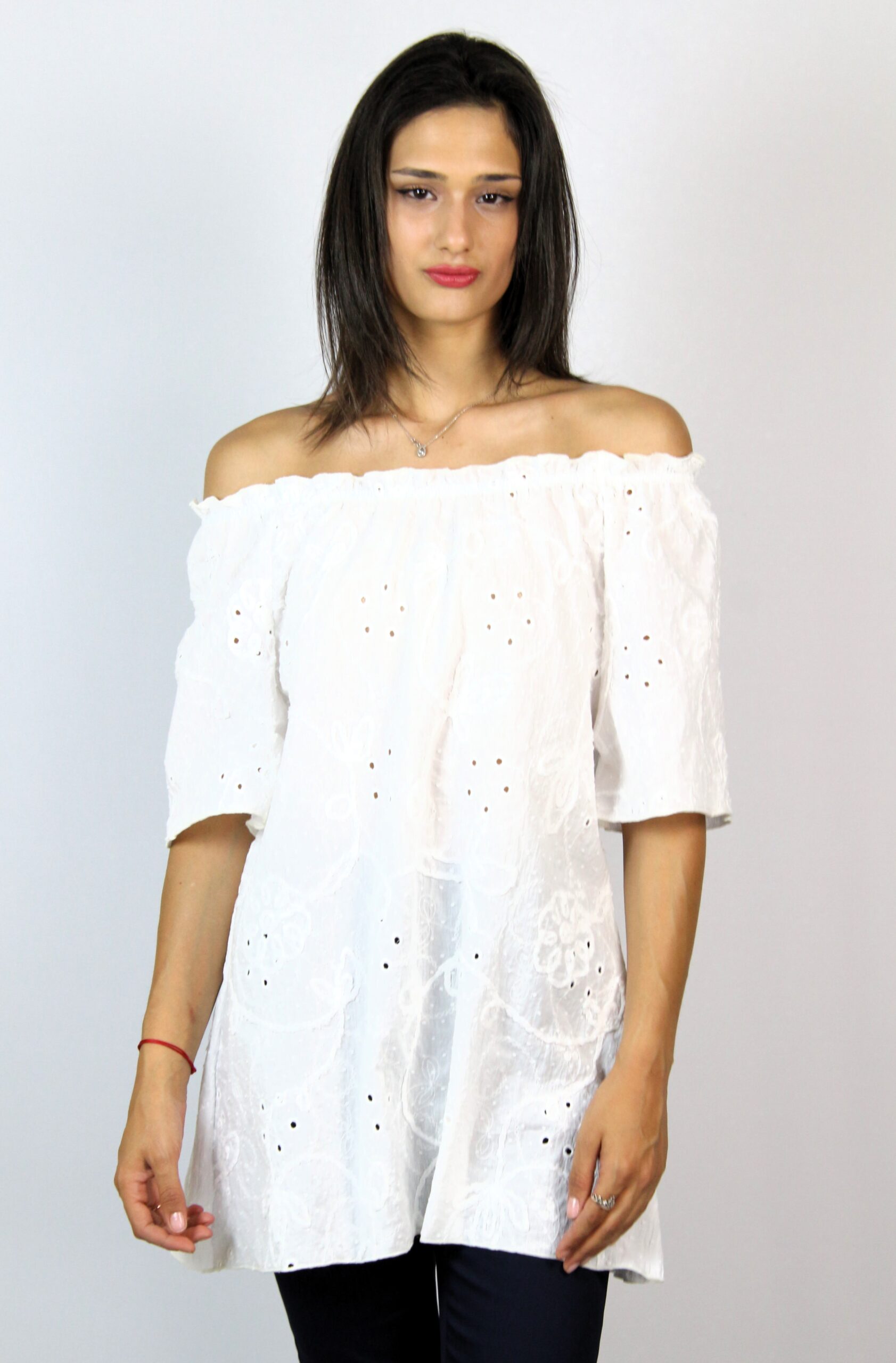 Свободно падаща туника с ластик на деколтето ,който позволява да се смъква надолу.