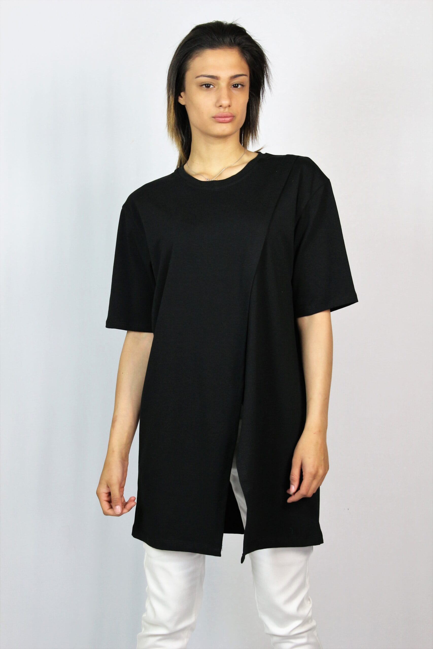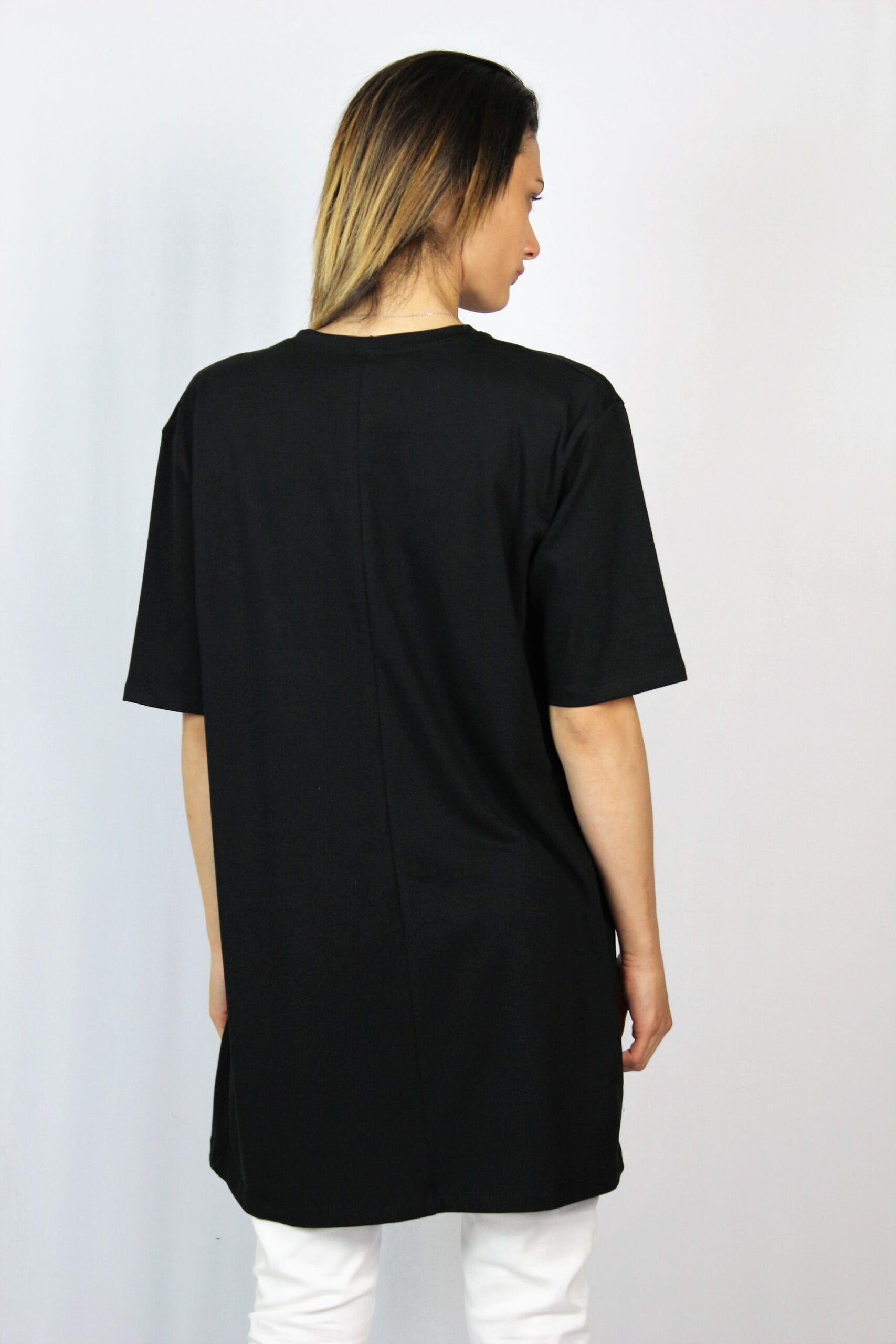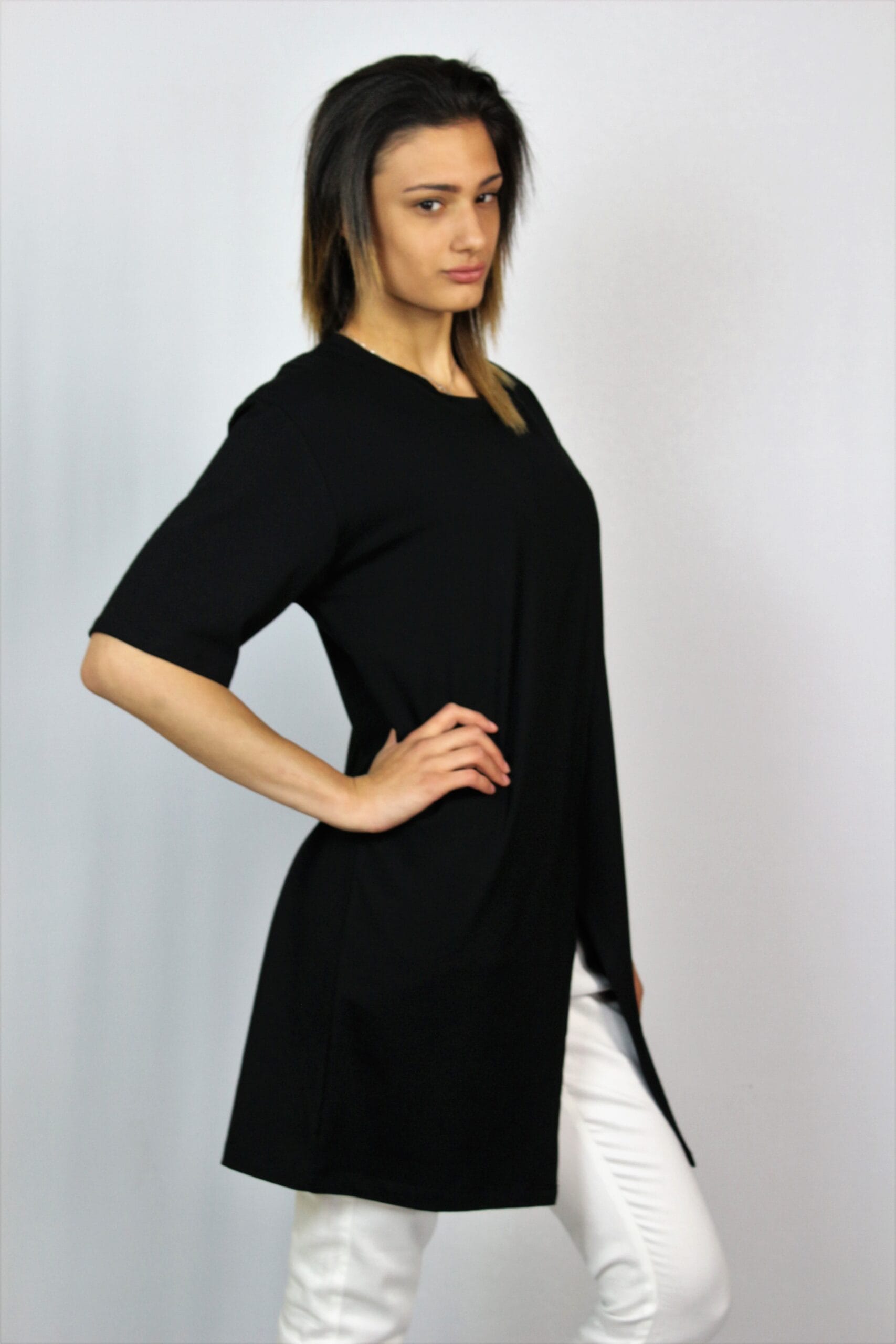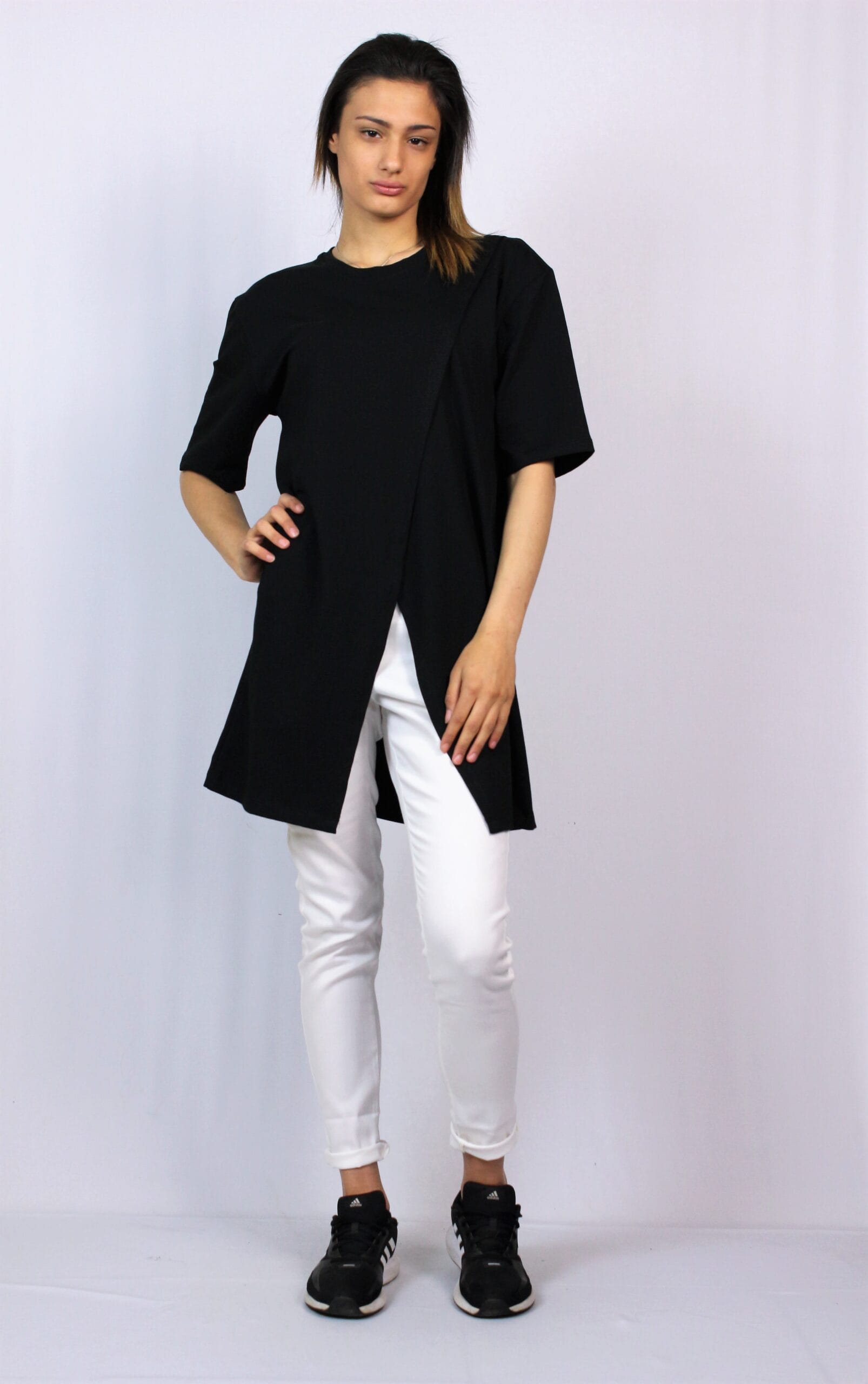 Свободна туника с асиметрична предна част изработена от памучно трико.