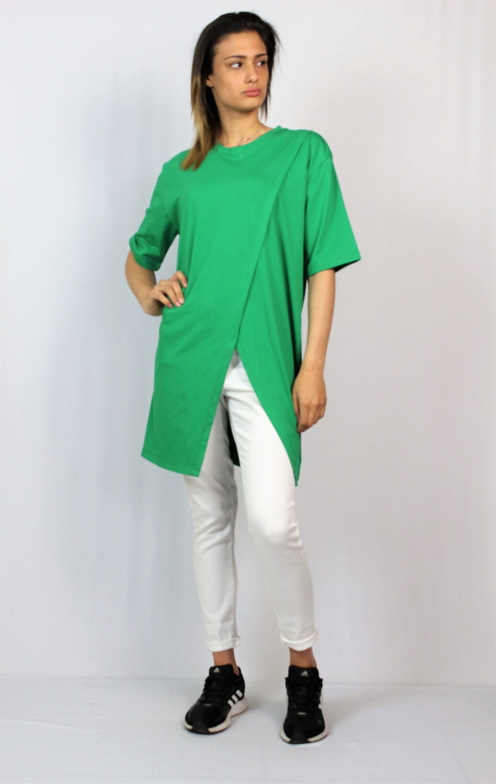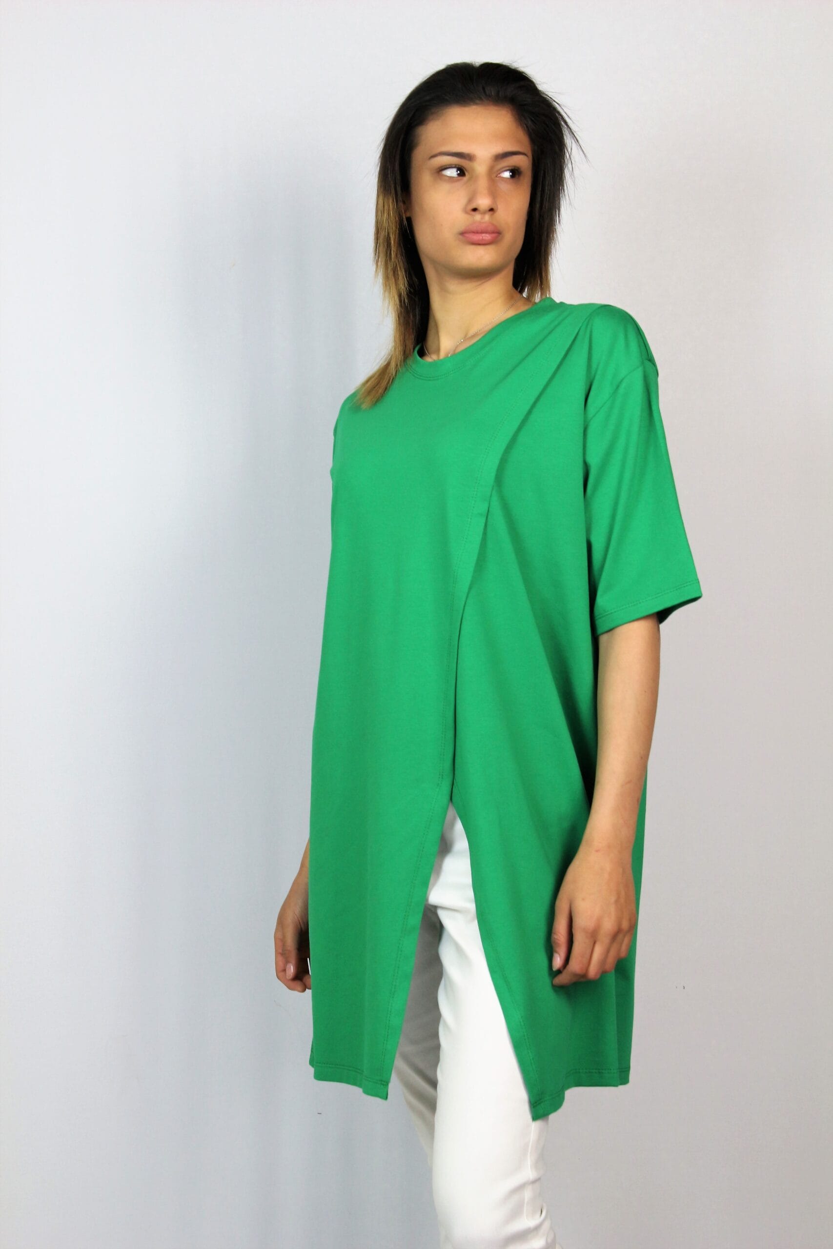Свободна туника с асиметрична предна част изработена от памучно трико.
