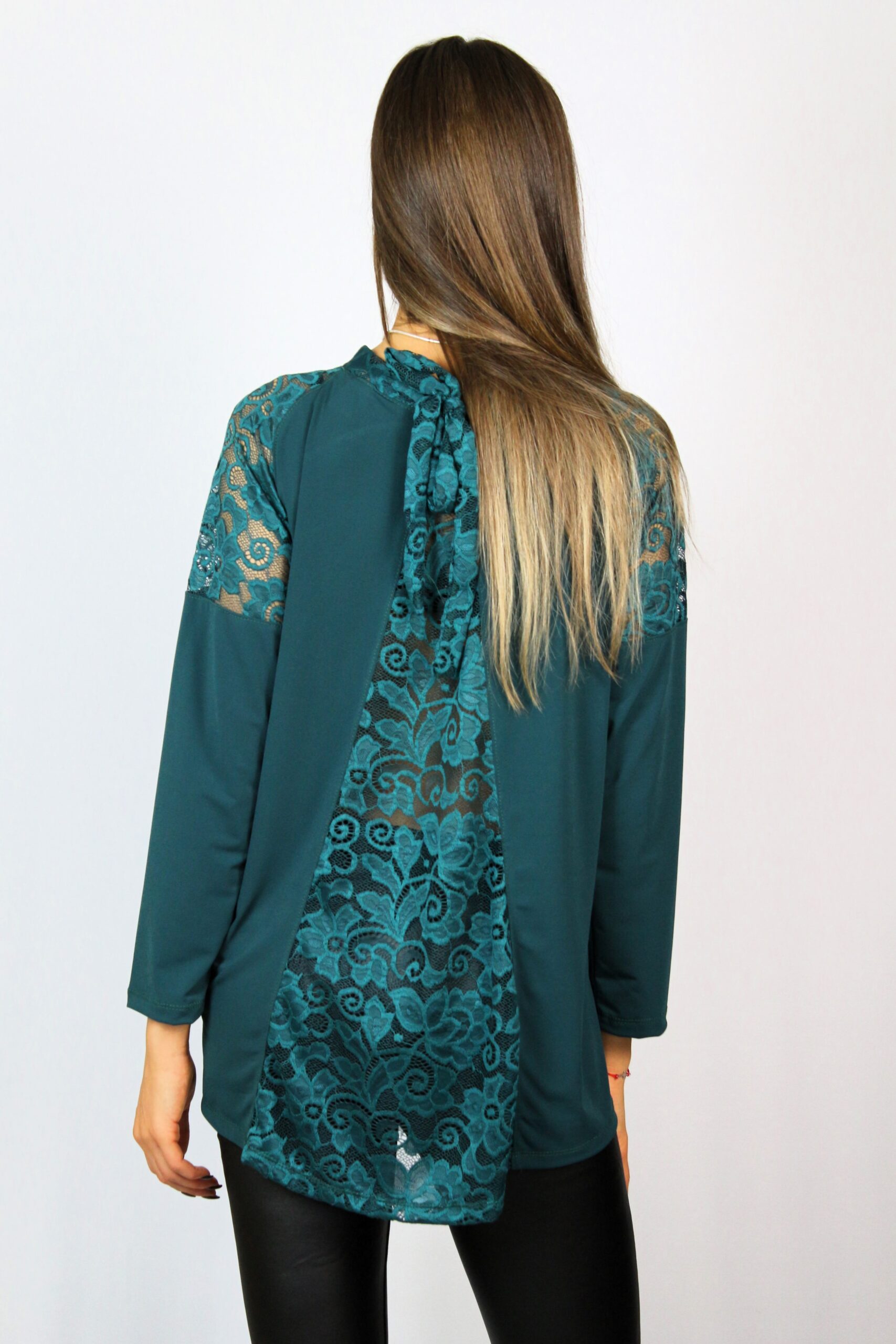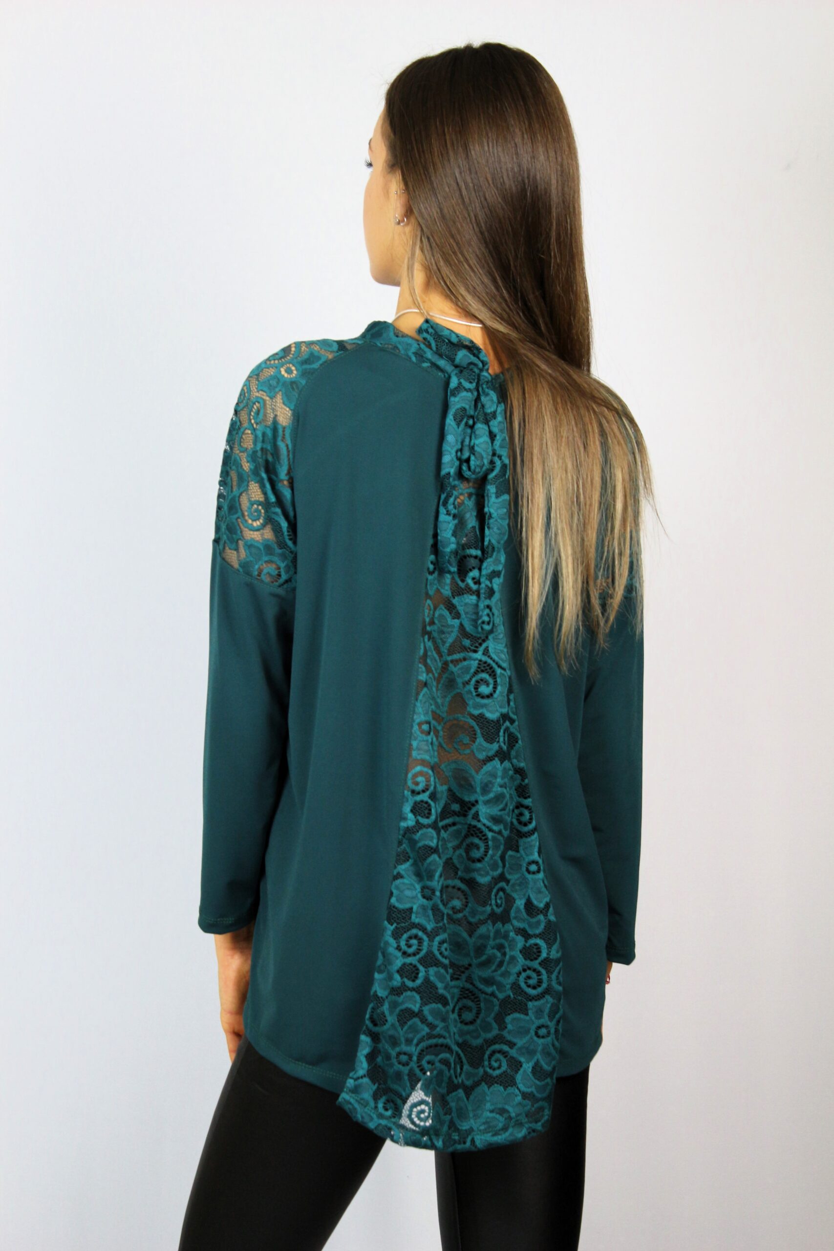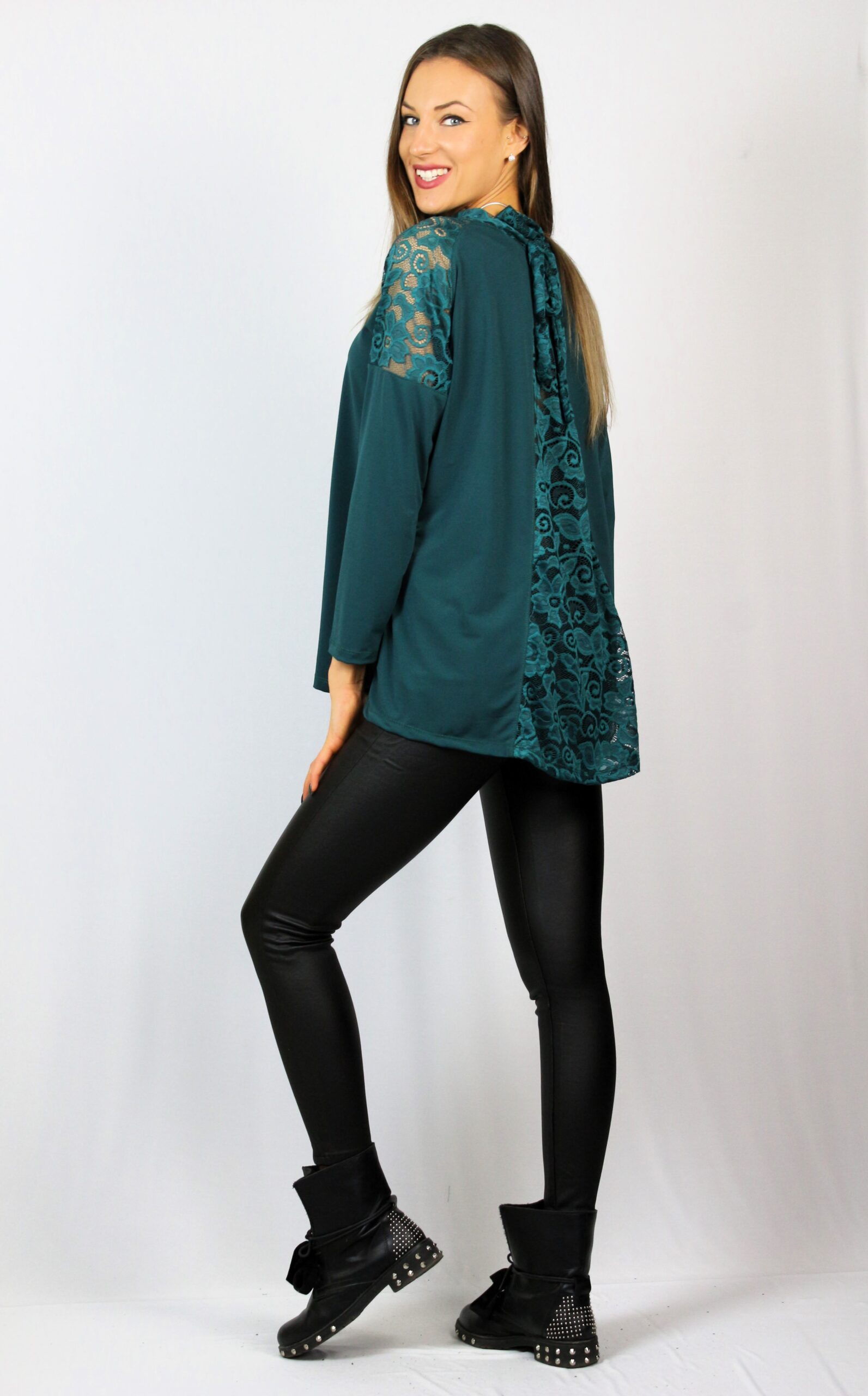 Туника свободно падаща надолу  с асиметрична дължина и пандела на гърба.  На ръкавите и гърба е комбинирана с дантела.