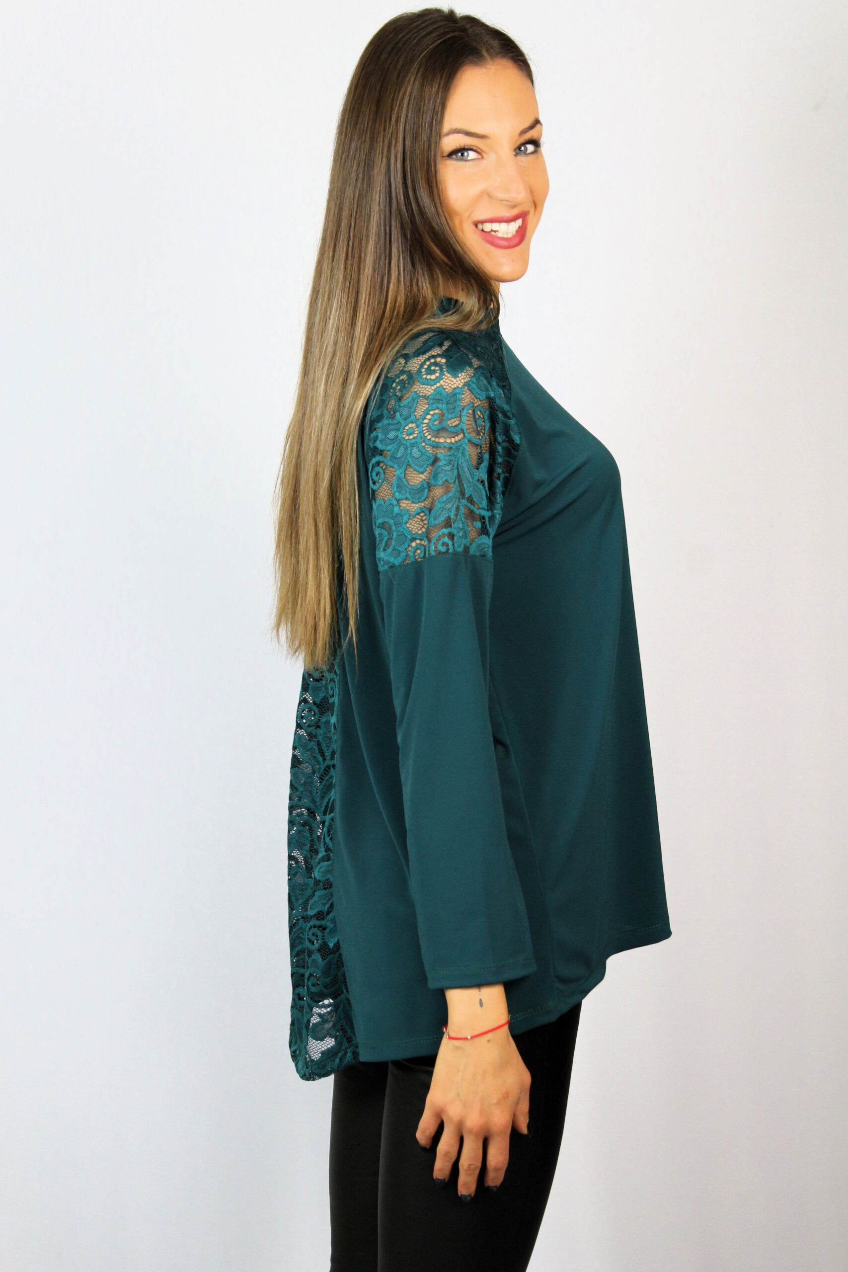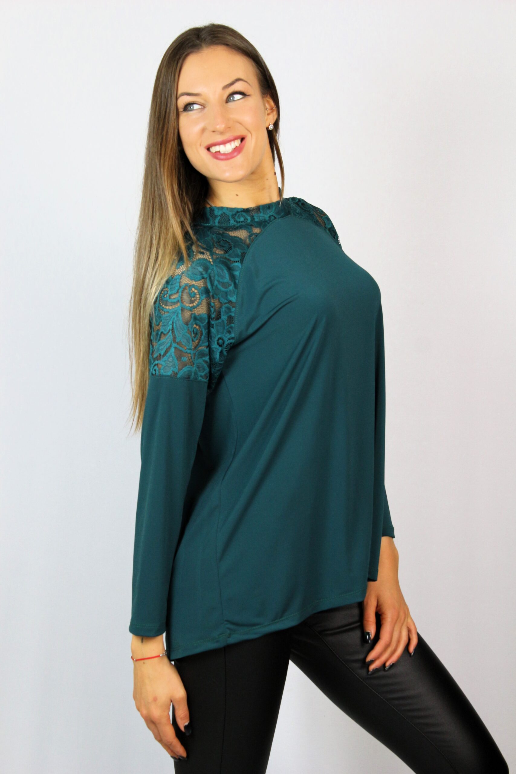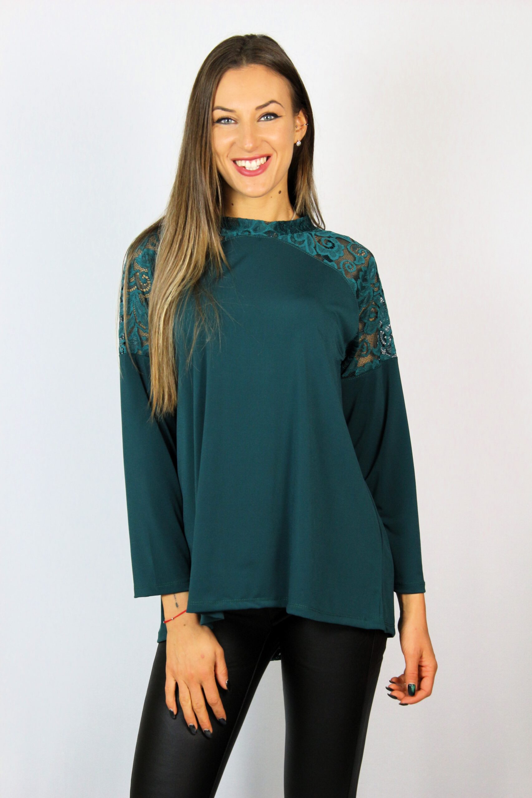 Туника свободно падаща надолу  с асиметрична дължина и пандела на гърба.  На ръкавите и гърба е комбинирана с дантела.