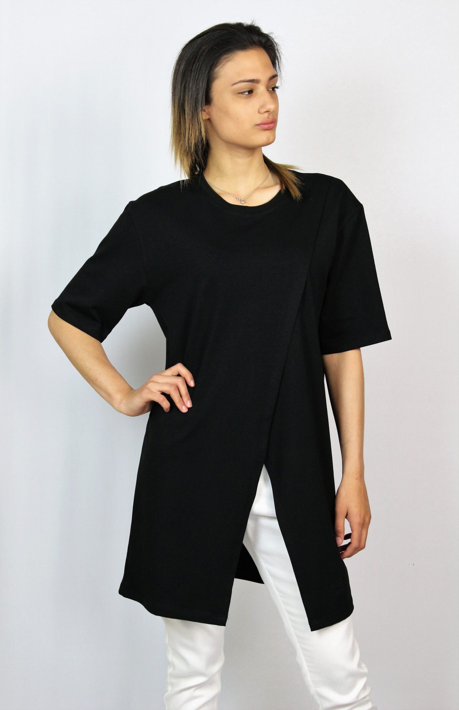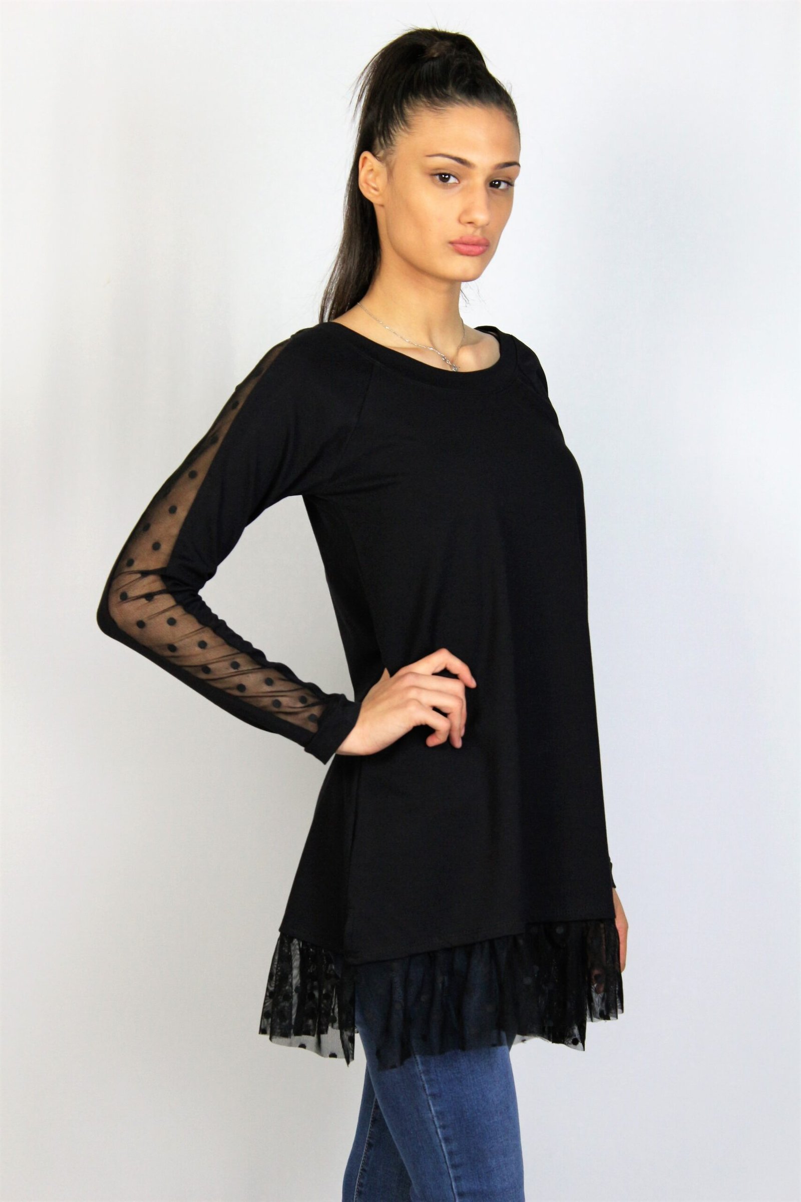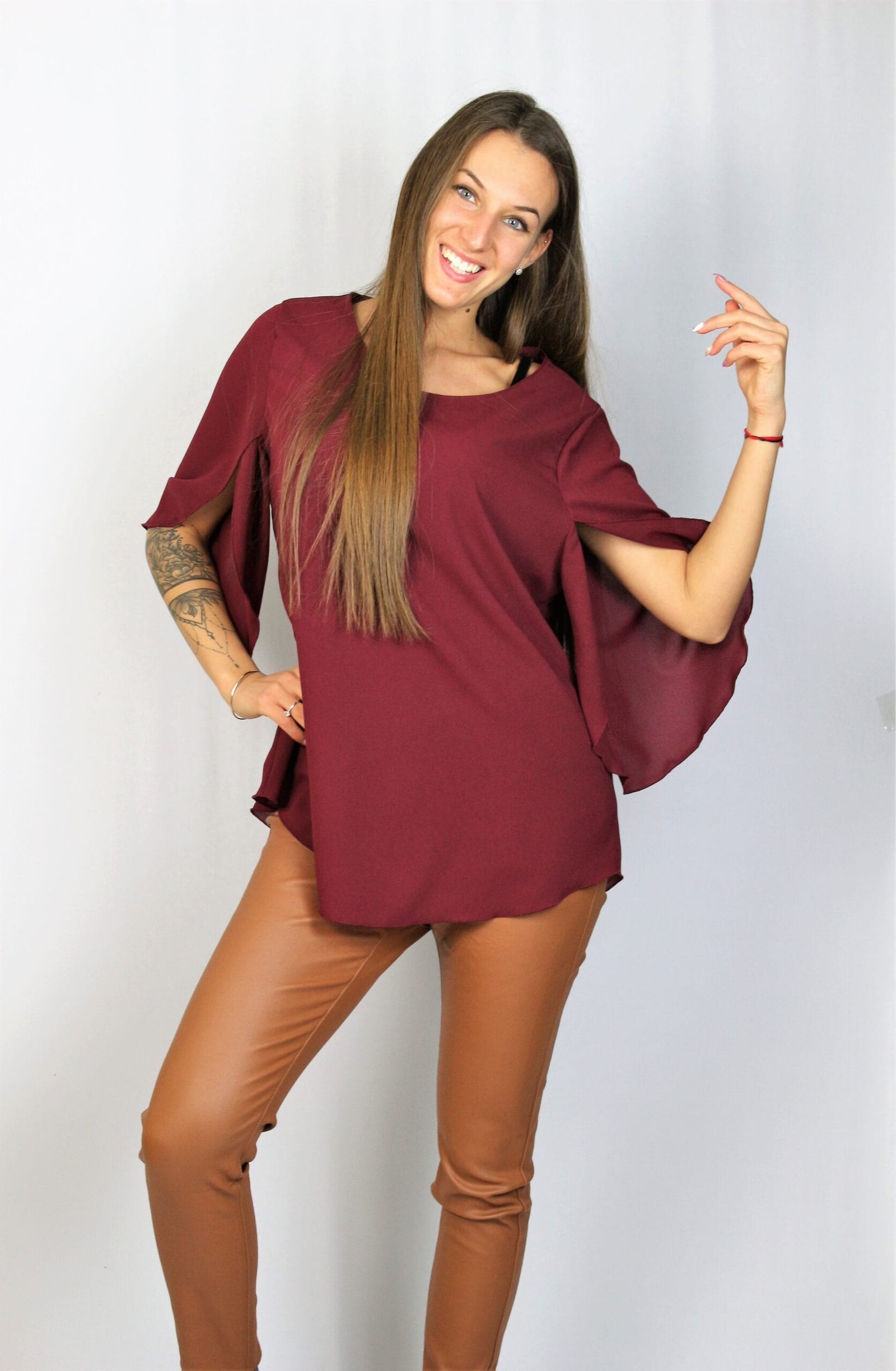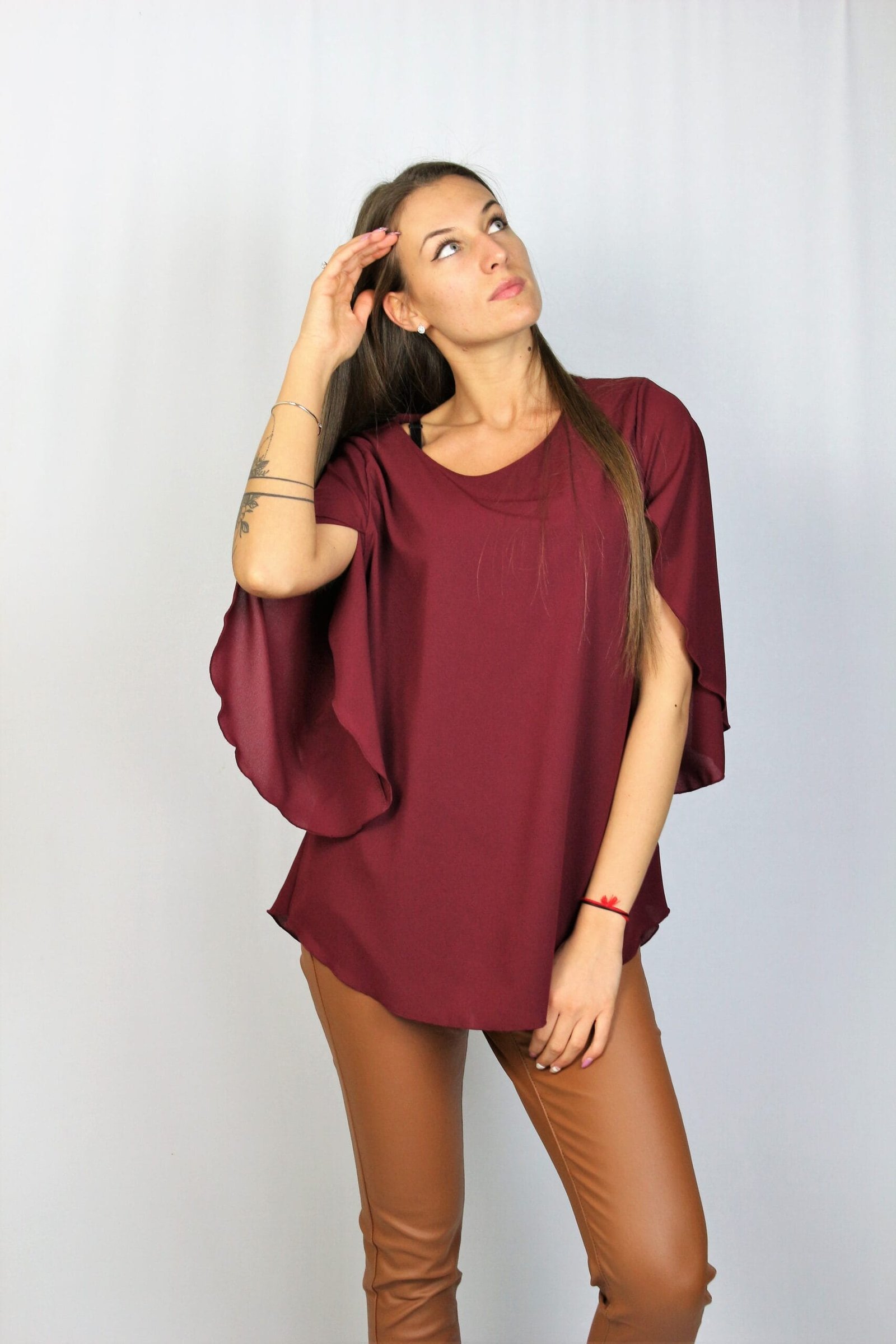 Туника свободна кройка с паднал ръкав ,леко издължена отзад ,комбиниран с кожено бие..