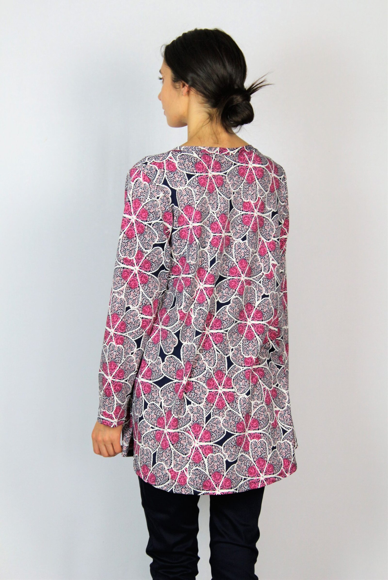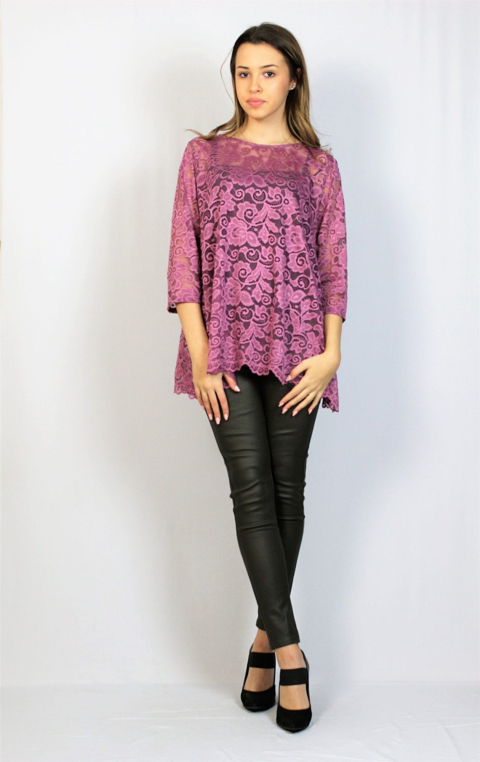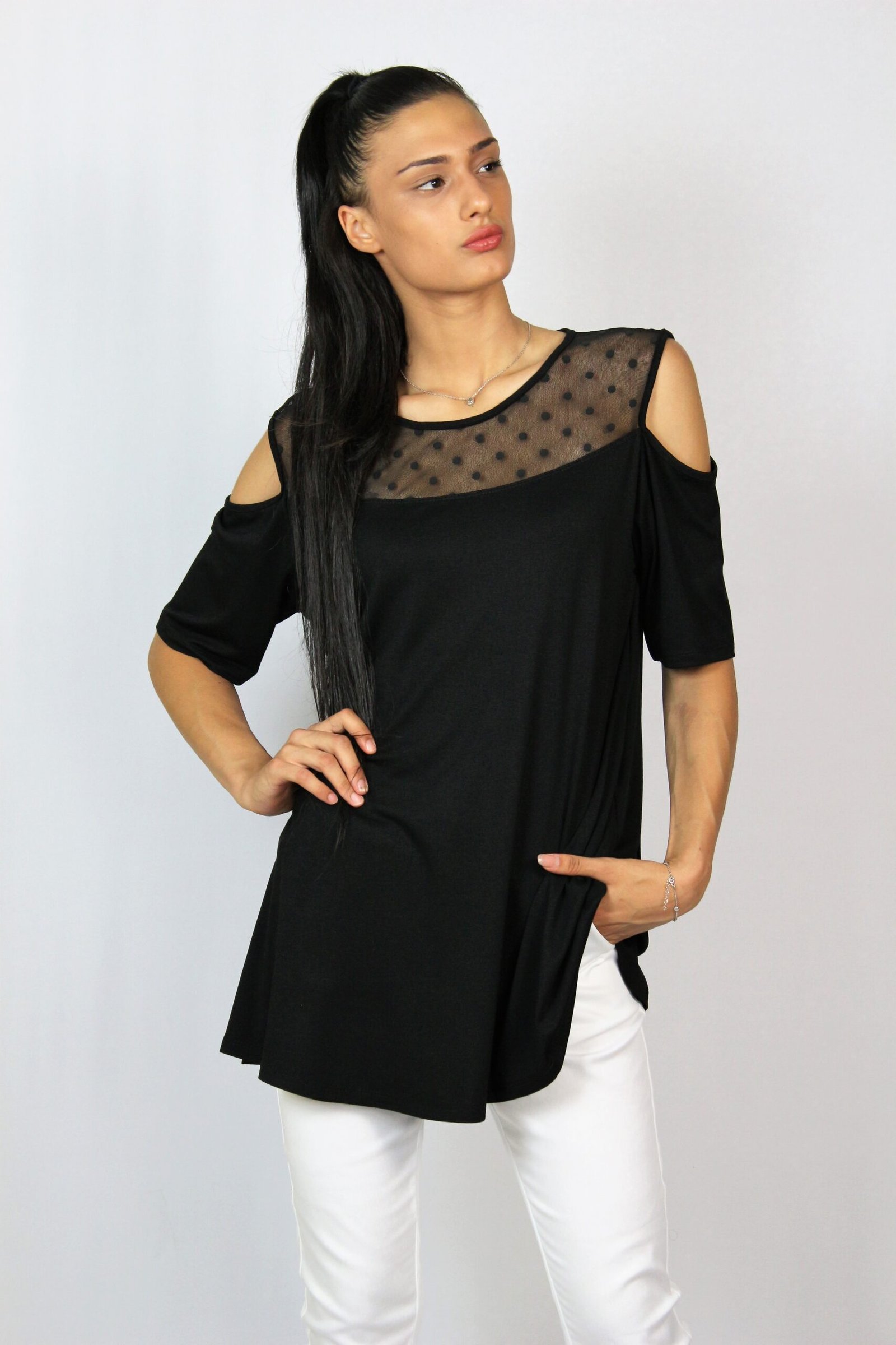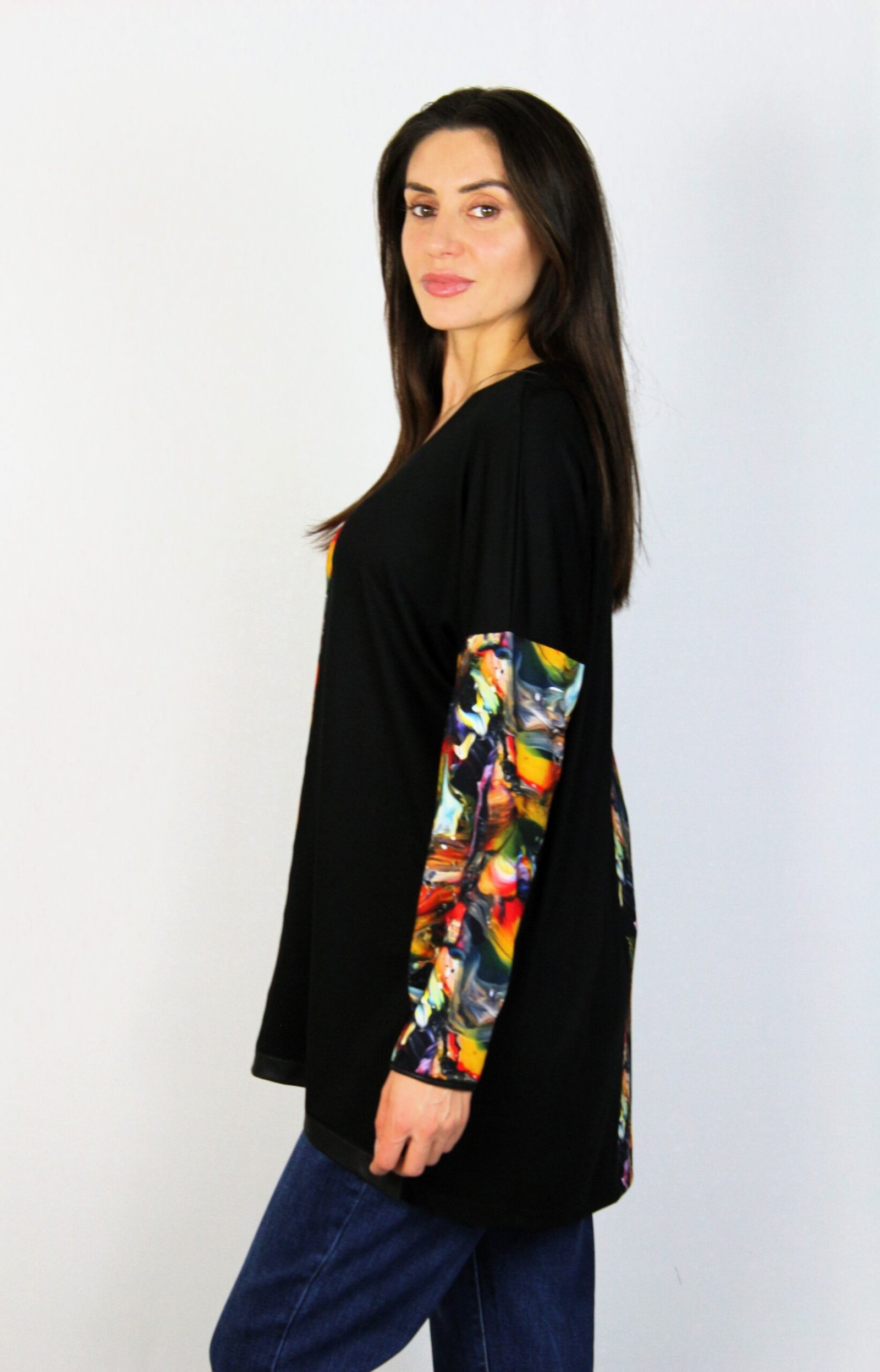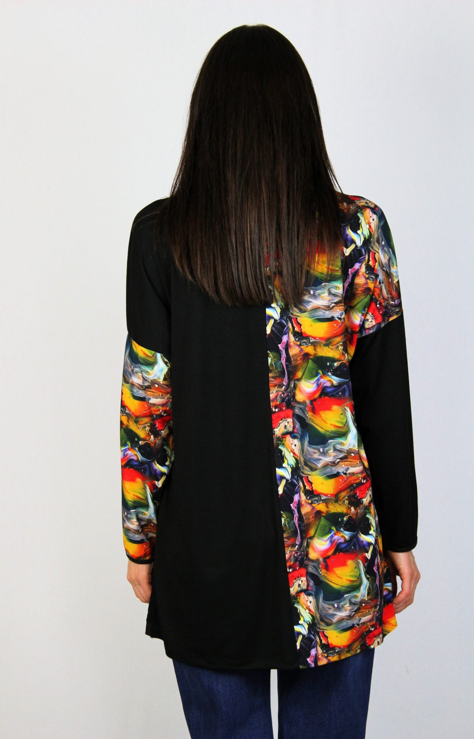 Туника свободна кройка с паднал ръкав ,леко издължена отзад ,комбиниран с кожено бие..