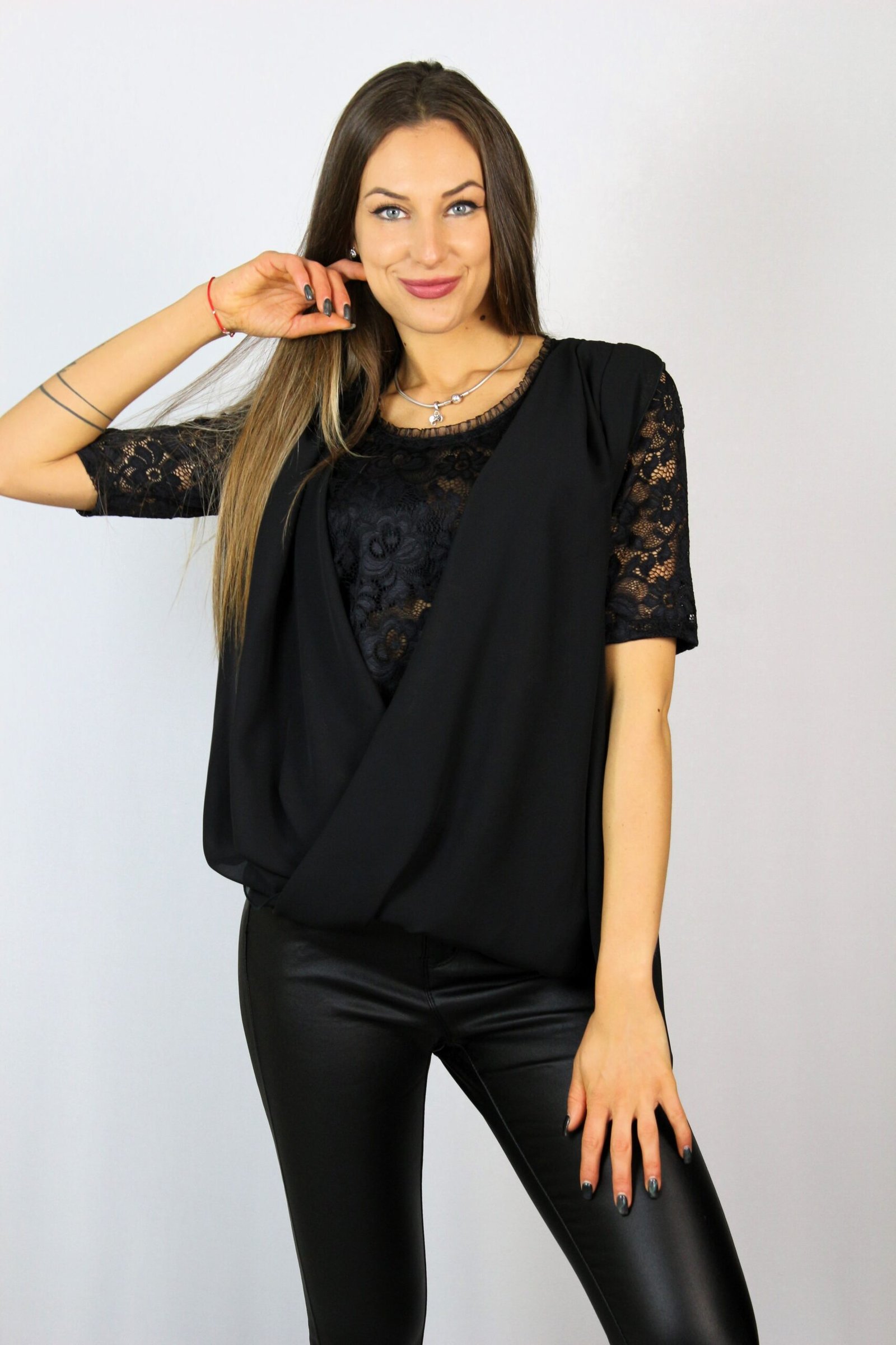 Туника от блуза дантела комбинирана с шифон издължен от единия край с прехвърляни предници .