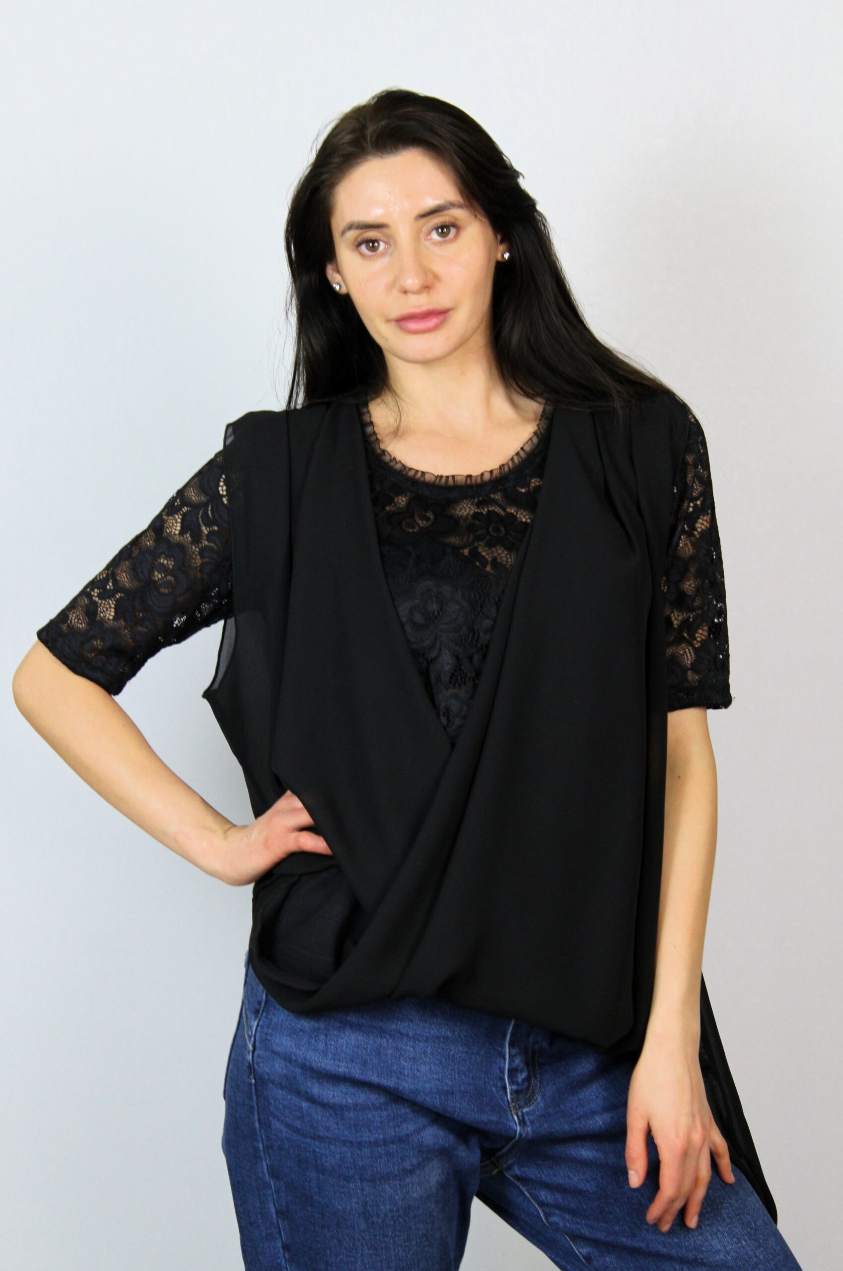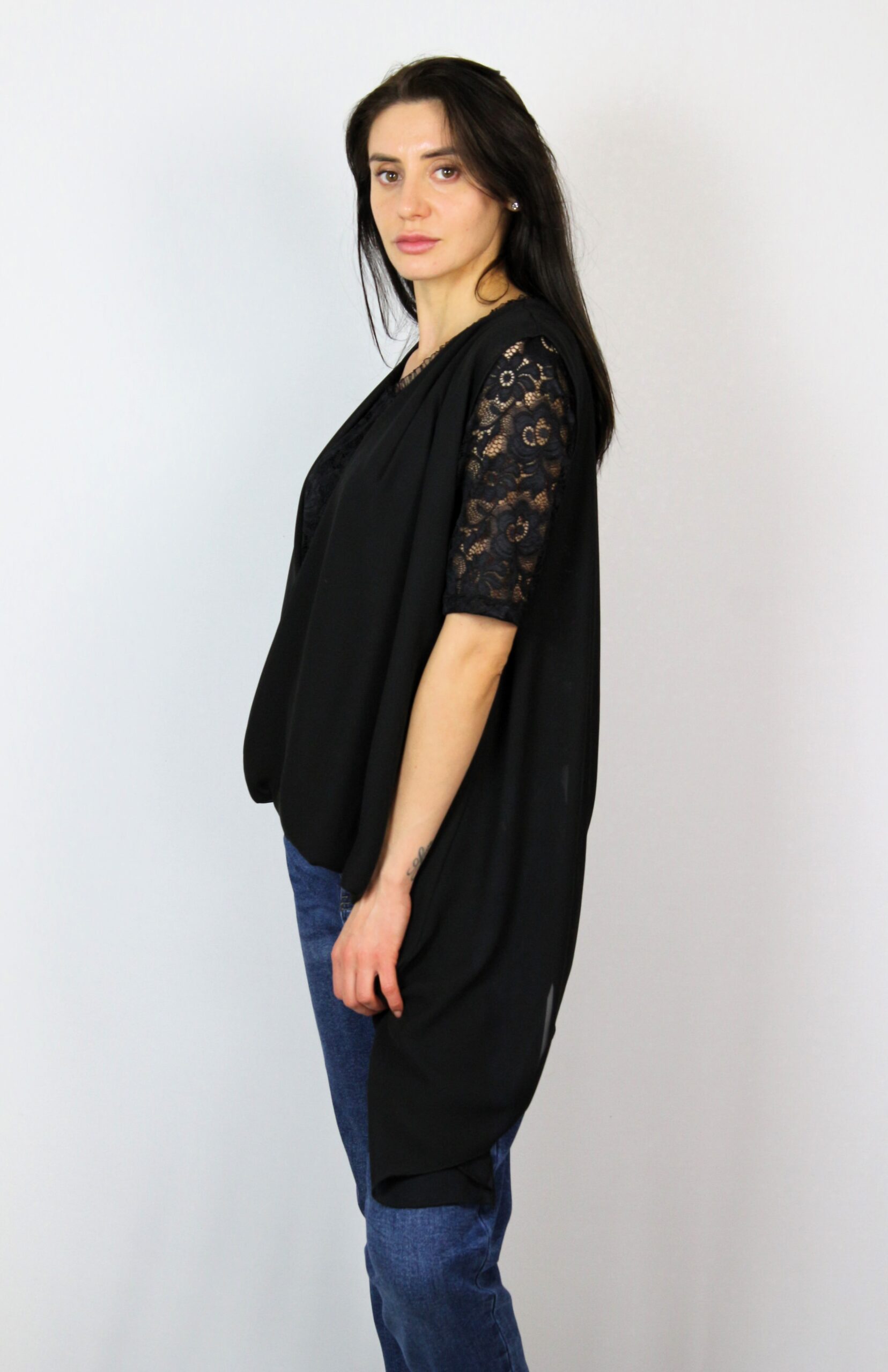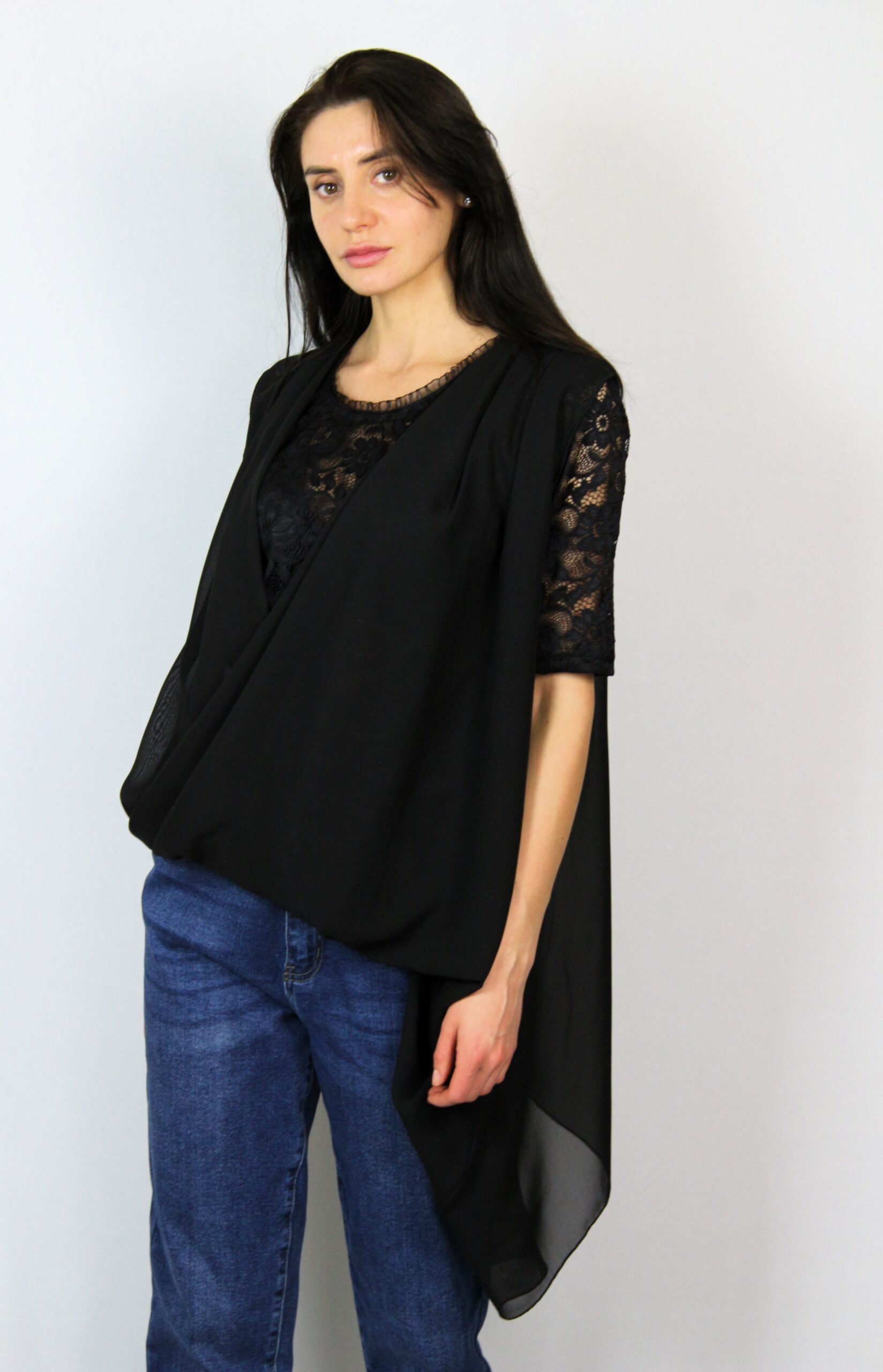 Туника от блуза дантела комбинирана с шифон издължен от единия край с прехвърляни предници .