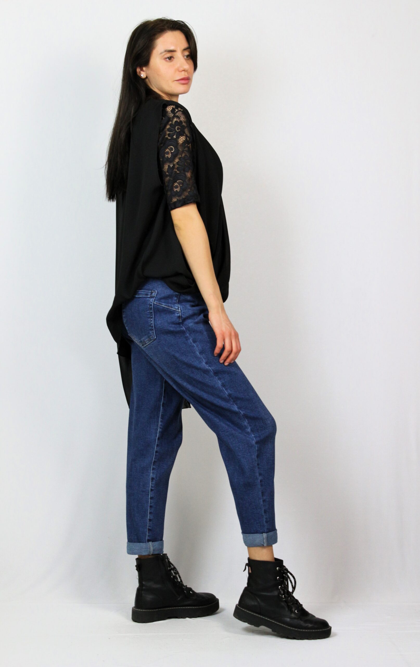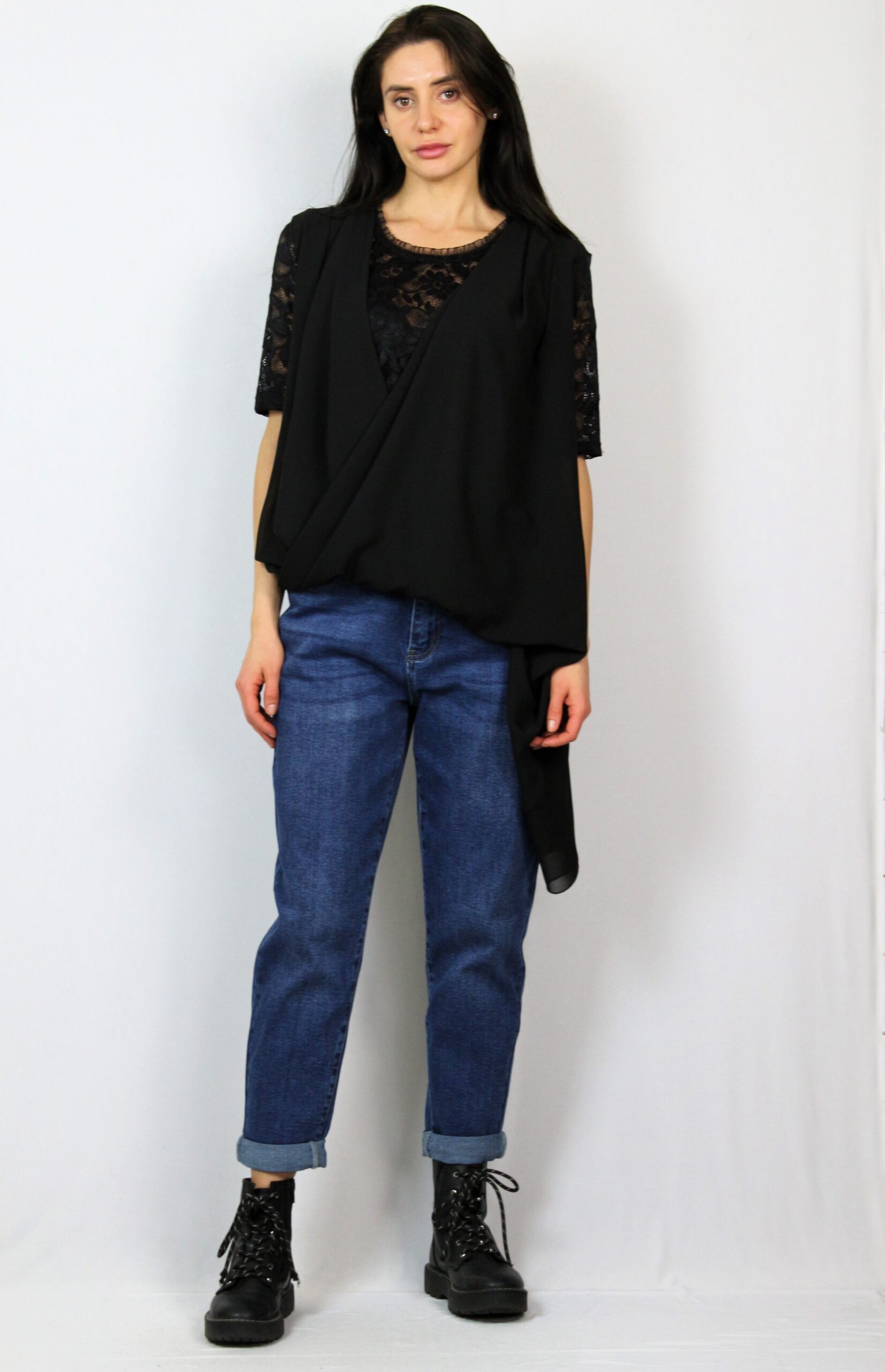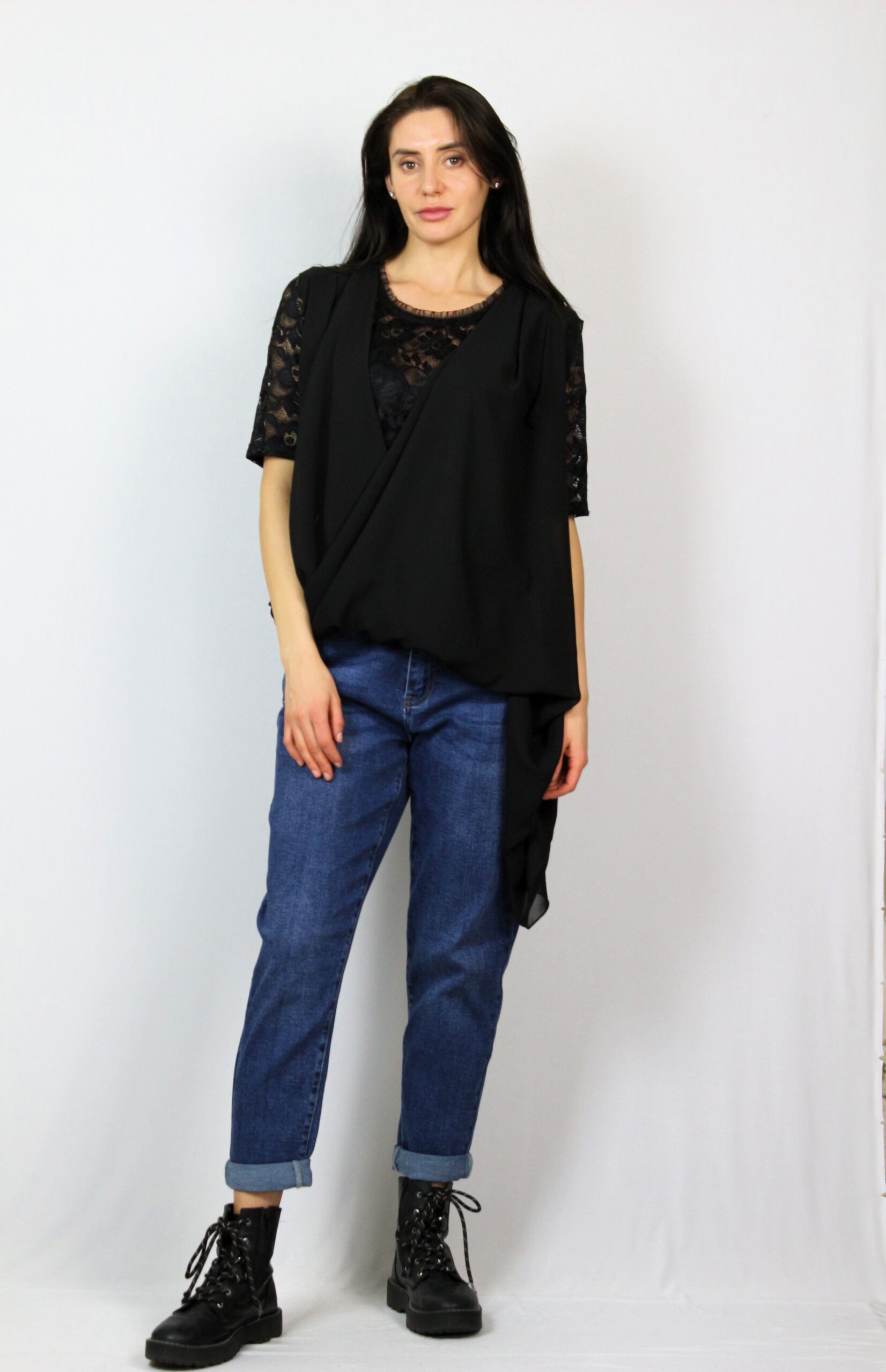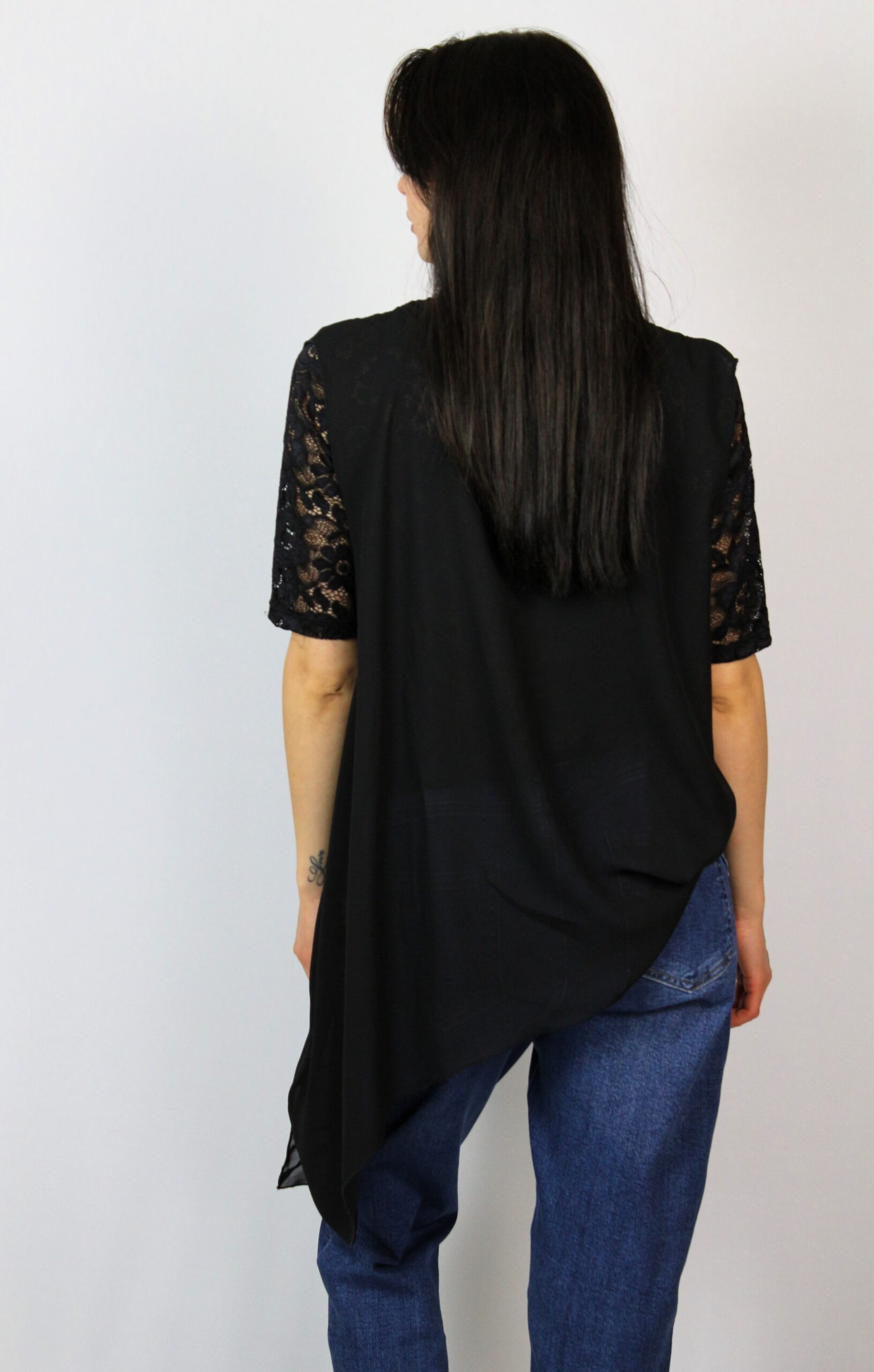 Туника от блуза дантела комбинирана с шифон издължен от единия край с прехвърляни предници .