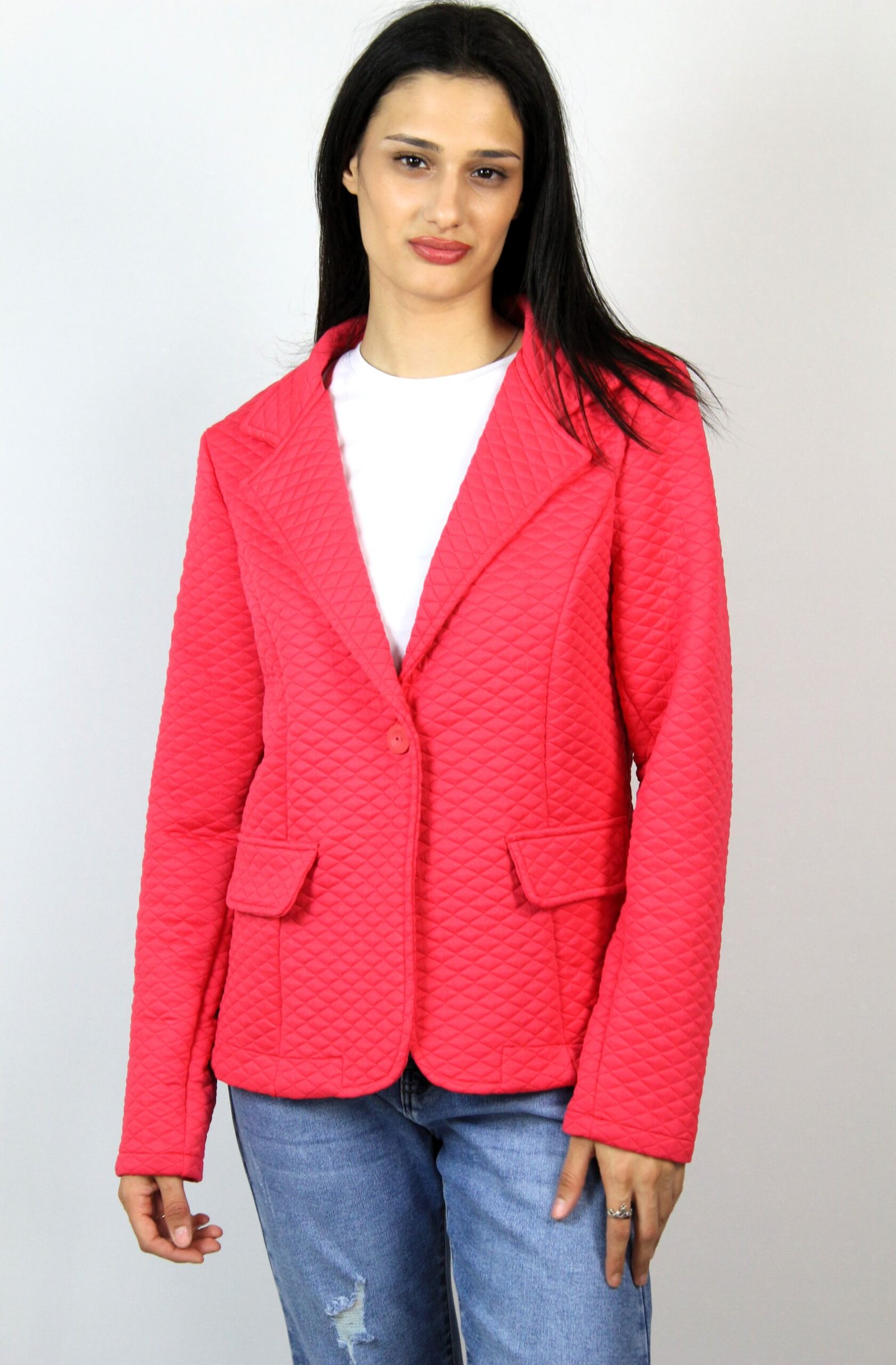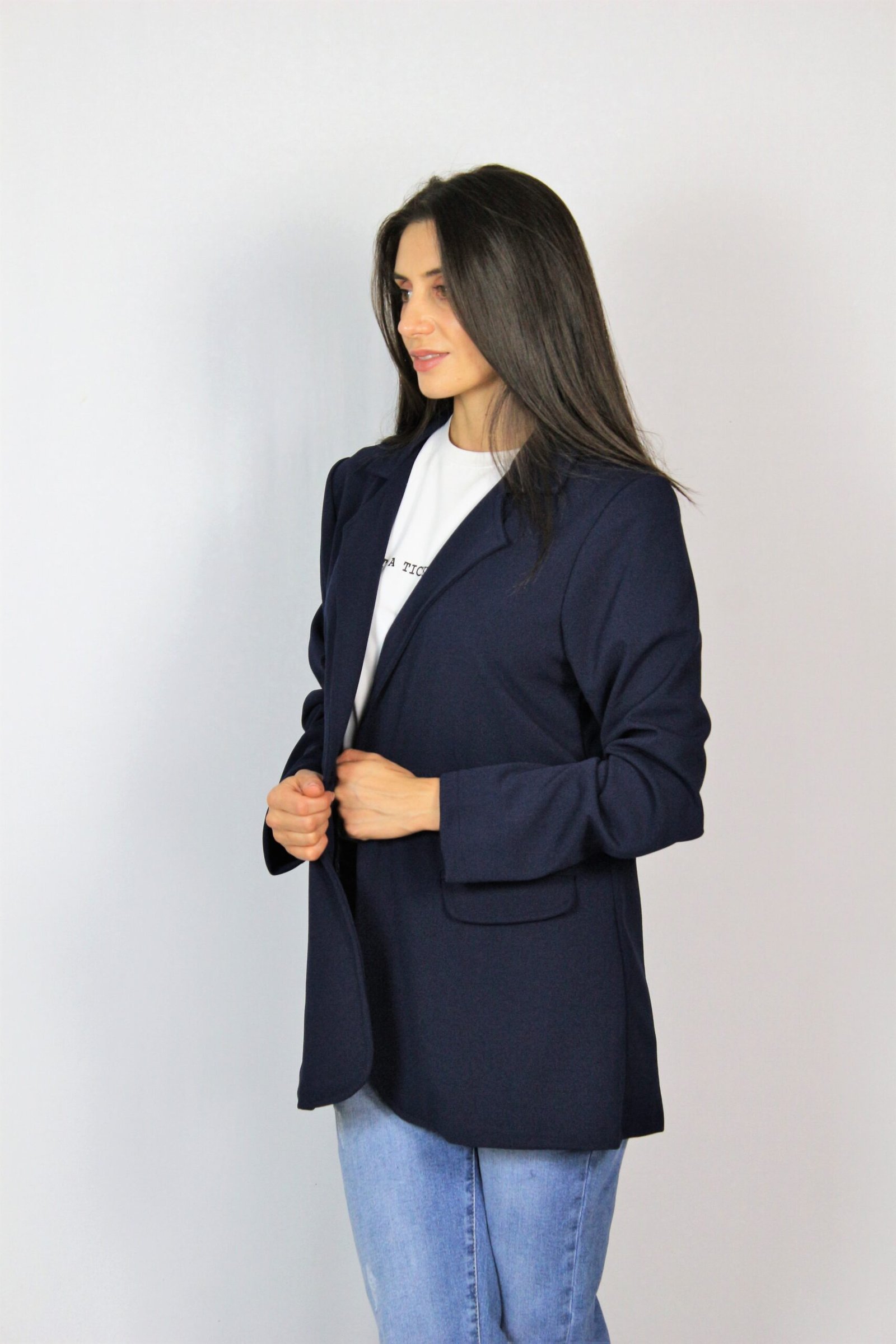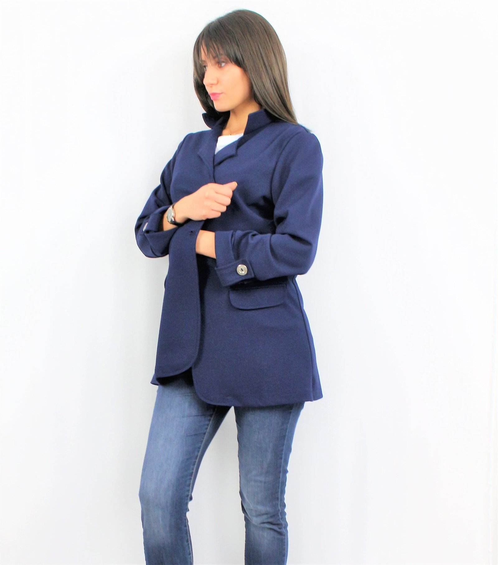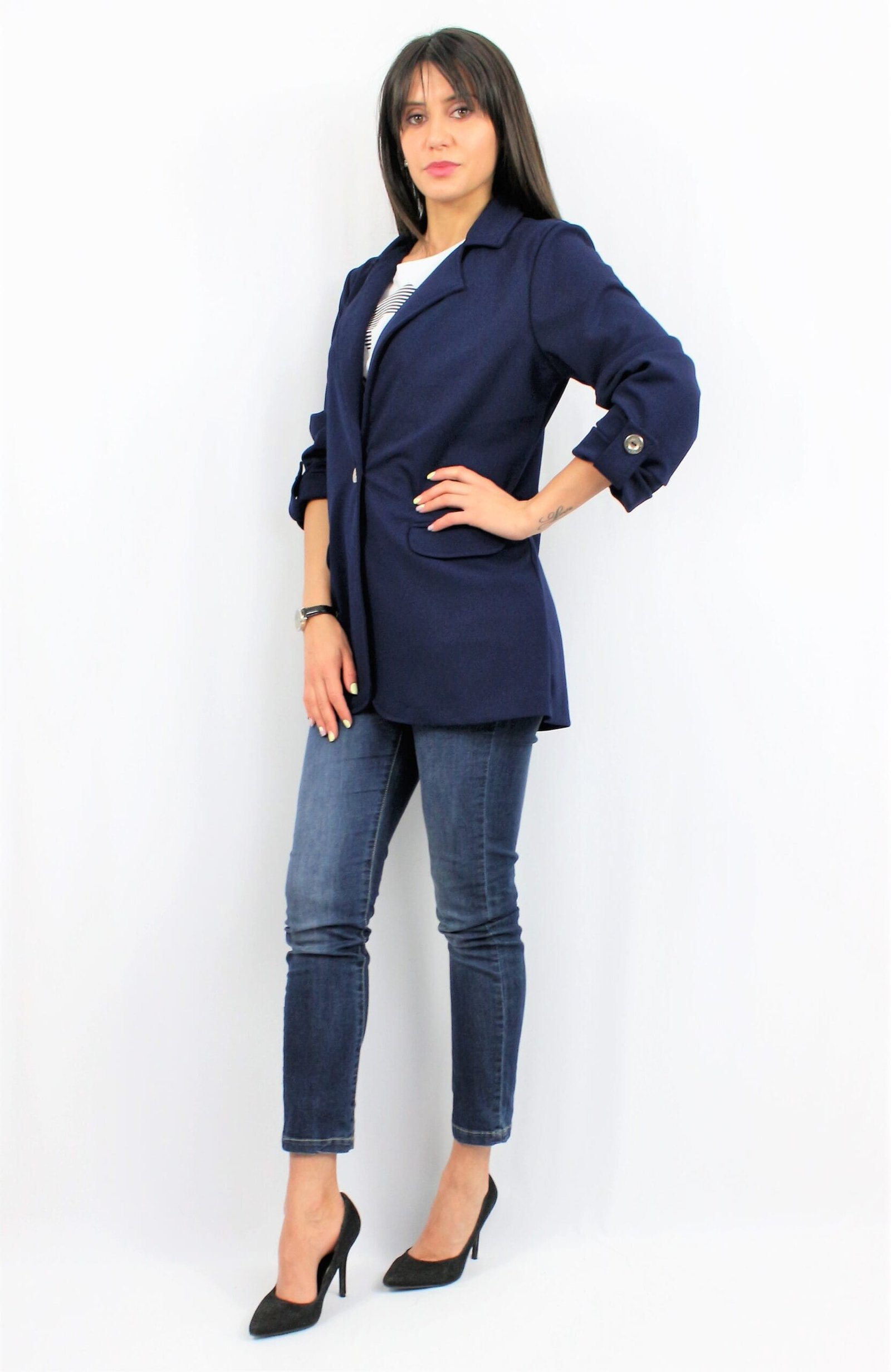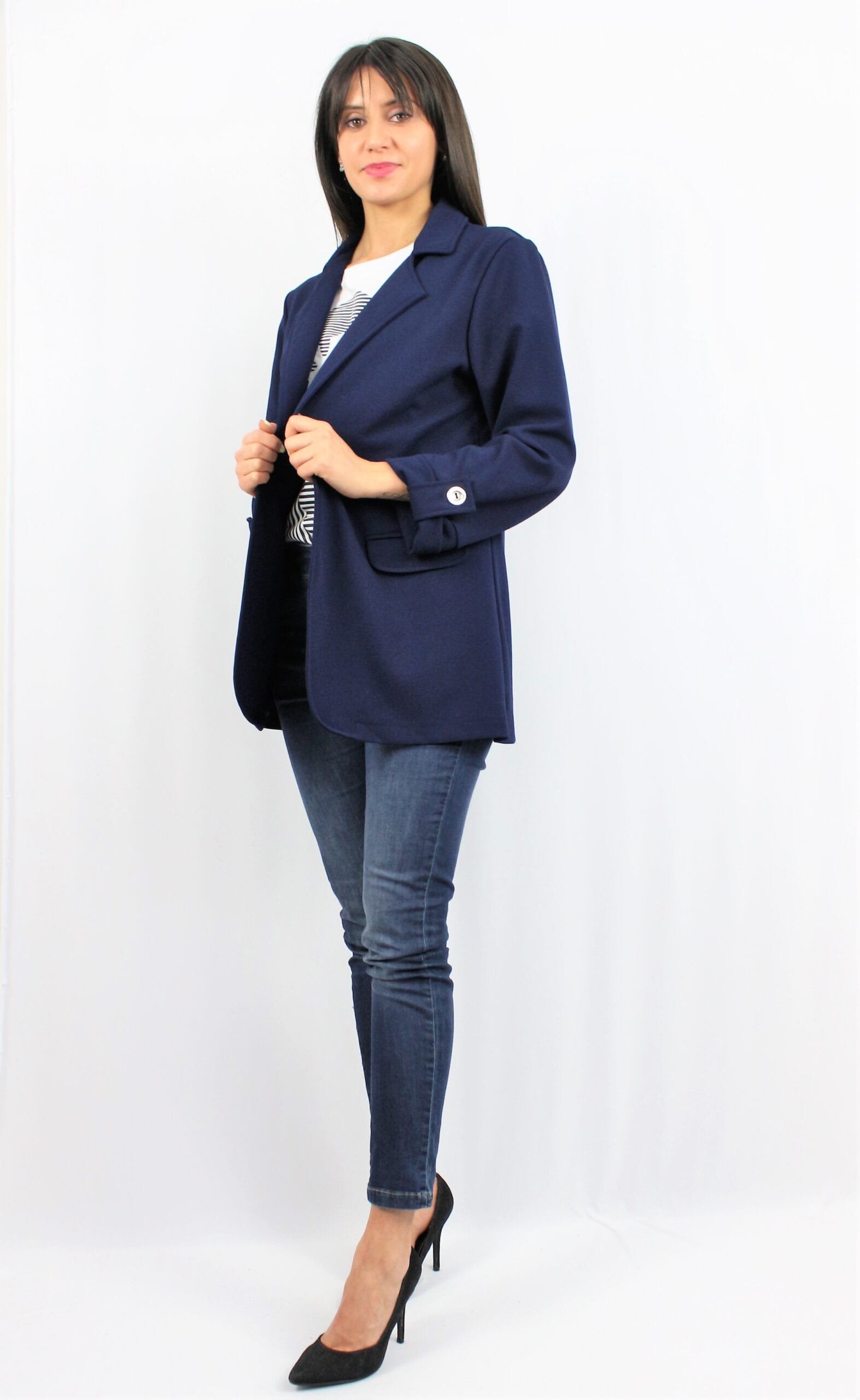 Блейзър с яка с ревери, навит ръкав с гайки и дължина под лакътя. Изработен от креп неопрен – полиестер с еластан.